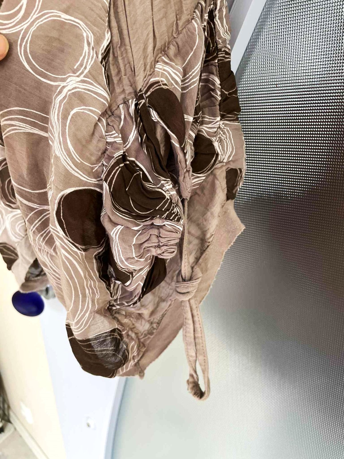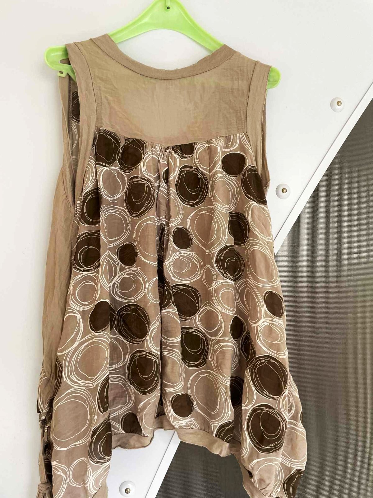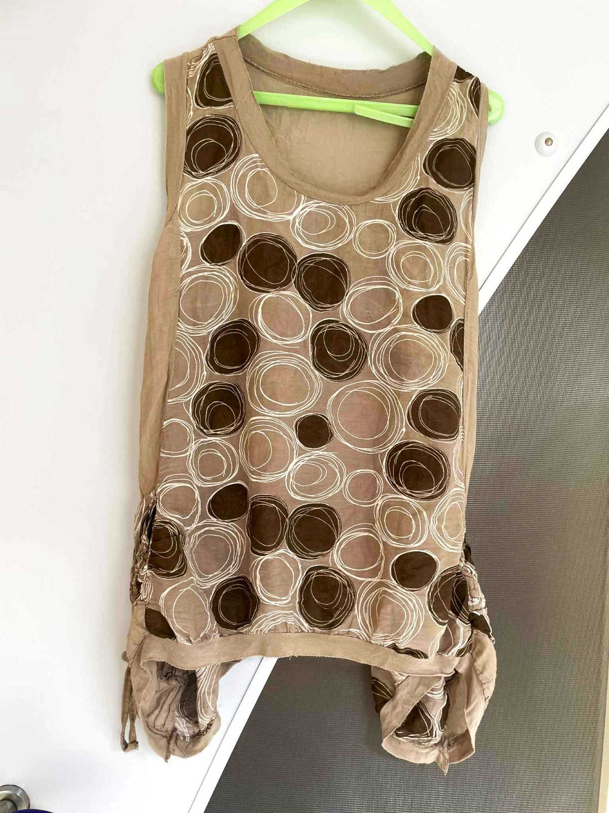 nadčasová letná tunika,ktorá zakryje všetky nedostatky,jemnučký úplet v kombinácii s organzou,nosí sa jemne vykrčená,na rohoch prevísajú cípy a veľmi zaujímavo riešené vrecká,zaujímavý kúsok, super pre tehotné ale nielen, šírka meraná pod pazuchou = 51 x 2 cm,dlžka meraná pod pazuchou na boku smerom dole k cípu = 61 cm,dlžka meraná v strede chrbta smerom po dolný okraj = 67 cm,vzadu je sedielko - viď foto,strih je do áčka,smerom dolu sa rozširuje,vzorovaný materiál je kvalitný šifón - jemne priesvitný,boky,lemy a sedielko je z tenučkej kvalitnej tričkoviny,super aj na biele tričko