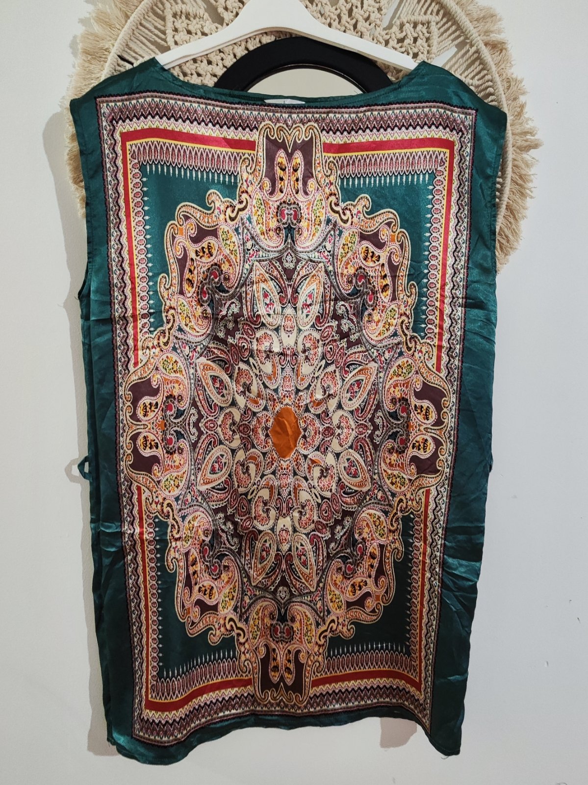Netradicny top s plisovanym dielom v predu. Lahucky material. V peknom stave. Rozmery prsia 43 cm, dlzka 75 cm.