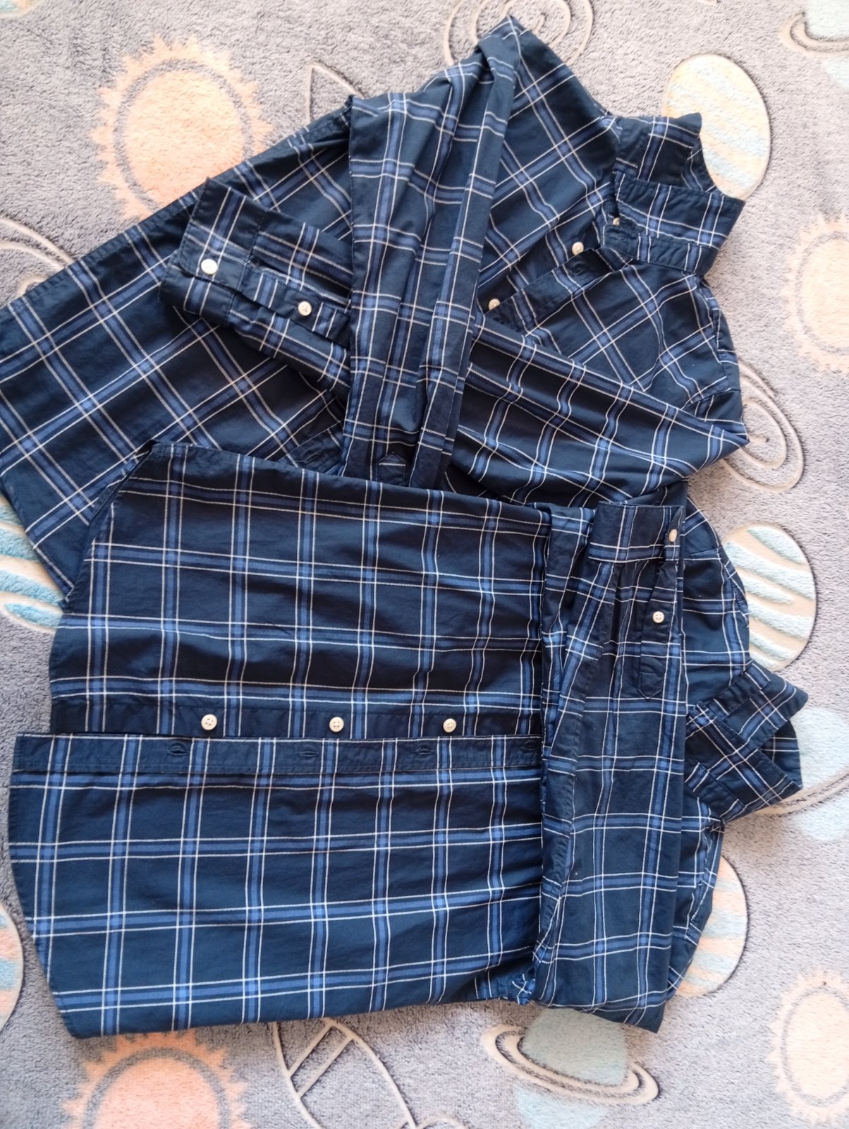 Košeľa vo veľmi dobrom stave. Oblečená párkrát. Tmavomodré prúžky sú svetlejšie ako na foto.