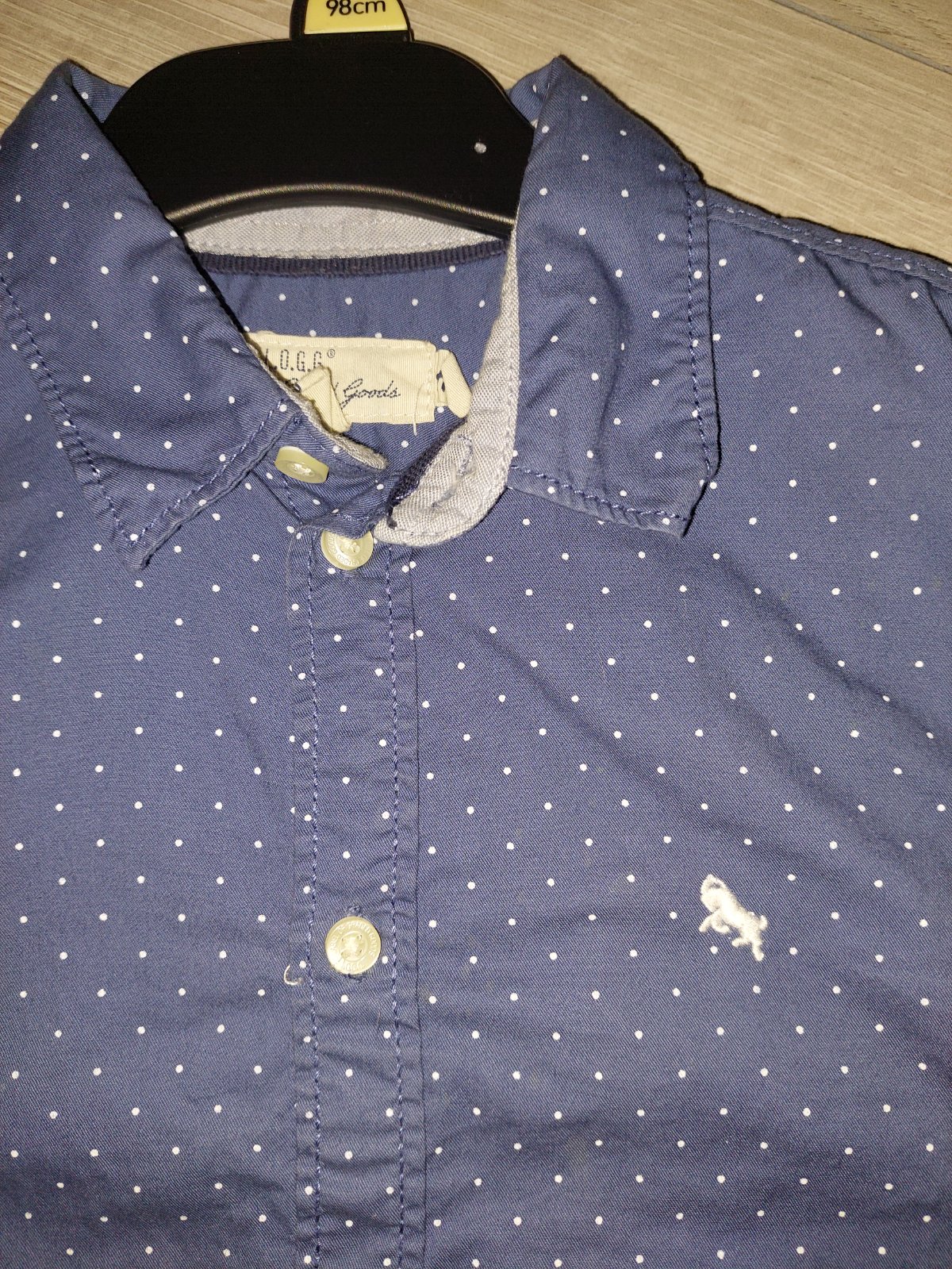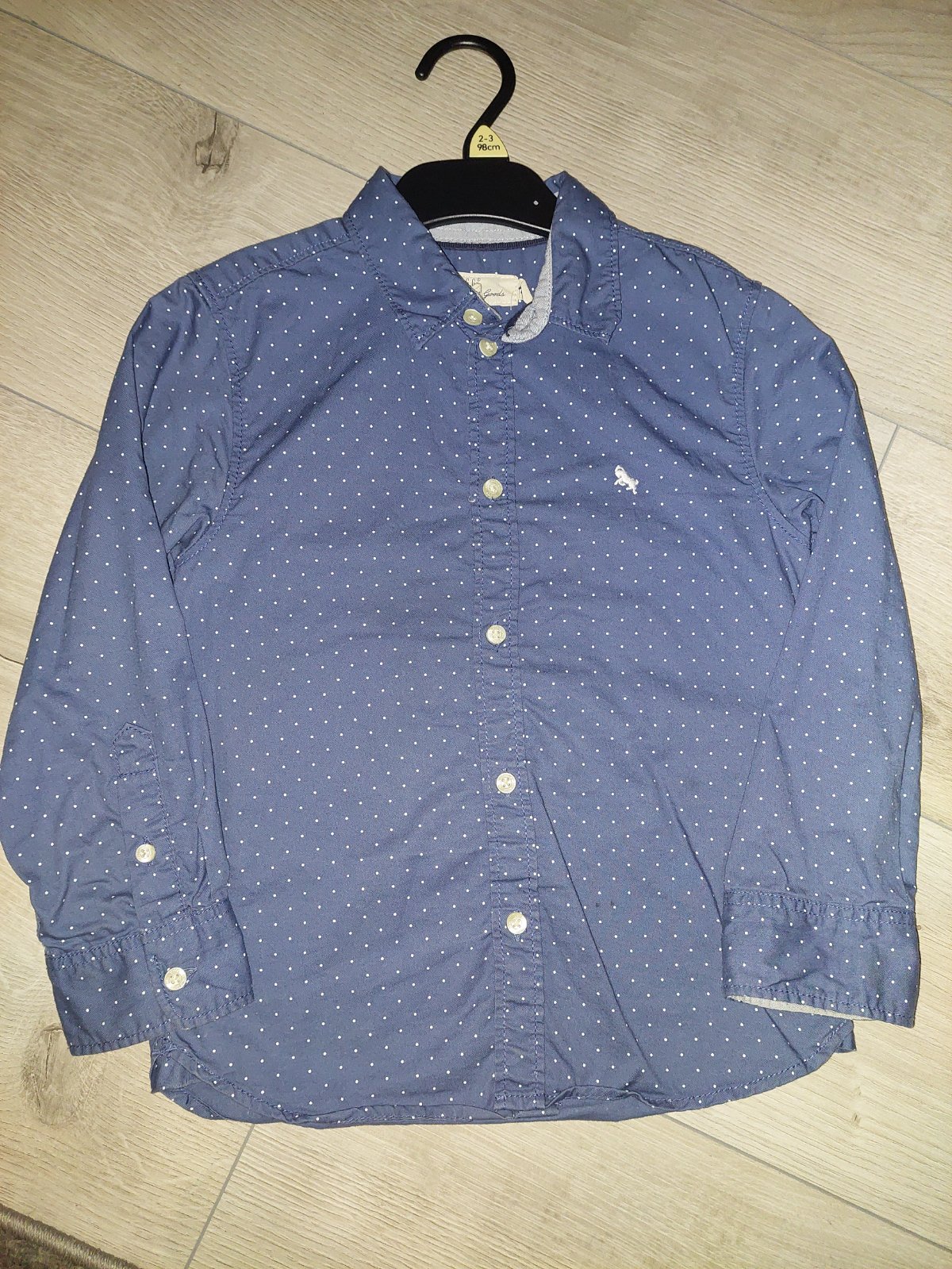Slušná modrá košeľa s malými bielymi bodkami. Rozmery: celková dĺžka 46 cm, pod pazuchami 36,5 cm, dĺžka rukáva od ramena 40,5 cm.