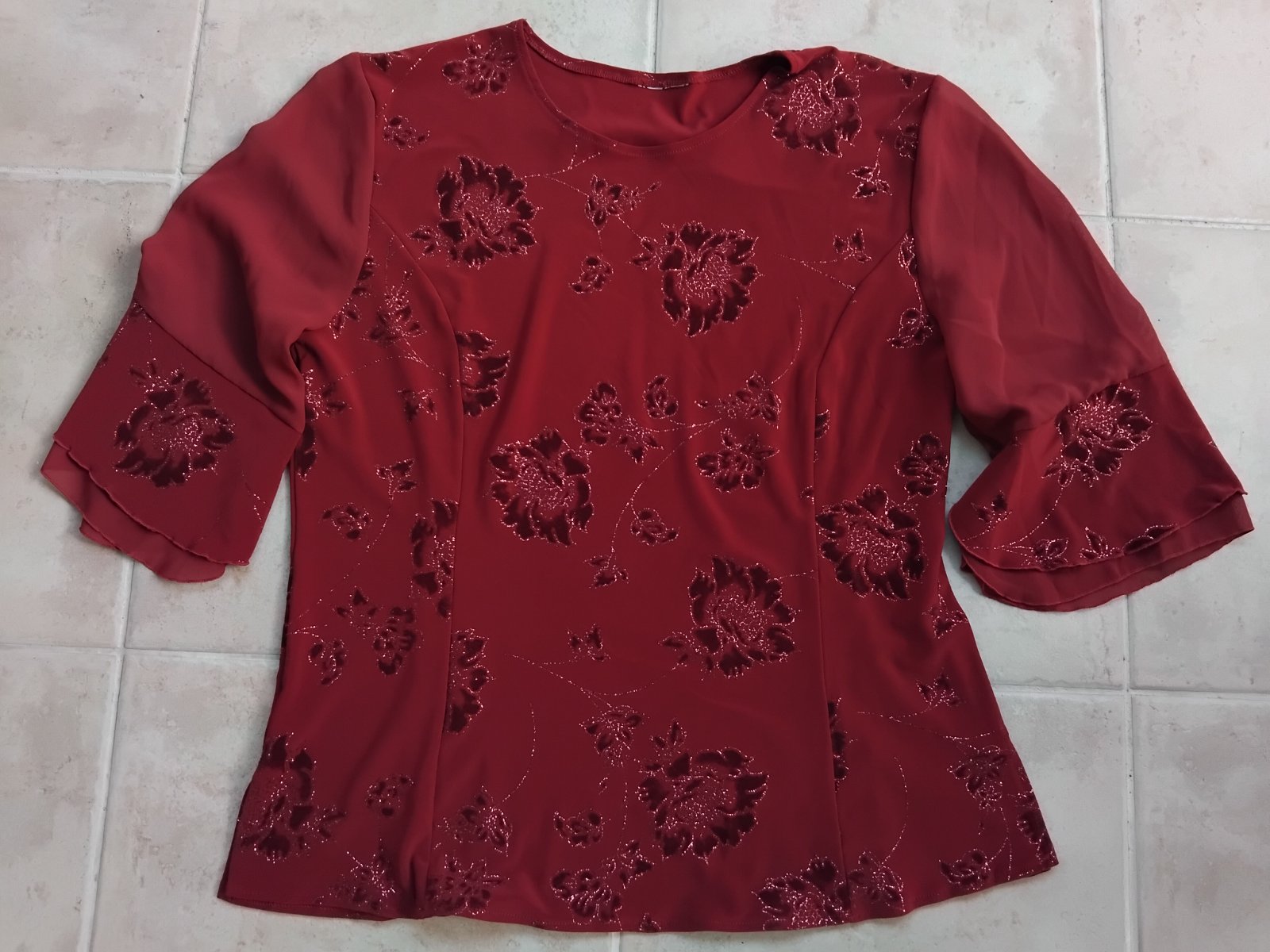 Bluzka s volanovymi rukavmi, slavnostne. Trblietave kvetinky. 1x oblečene na oslave. Velkost odhadom, premerajte. Top stav.