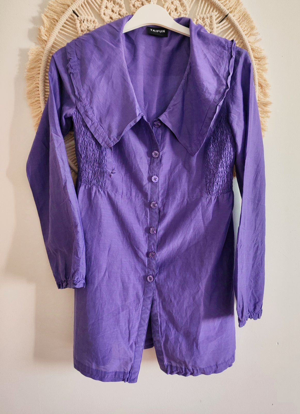 Raz oblecena, farba ako na druhej foto. Zapinanie na boku na zip.skryte gombiky pod maslickami pod golierom.elasticka. Celkova dlzka 57, cez prsia 47, dlzka rukav 60.povodna cena 29 eur bez postovn...