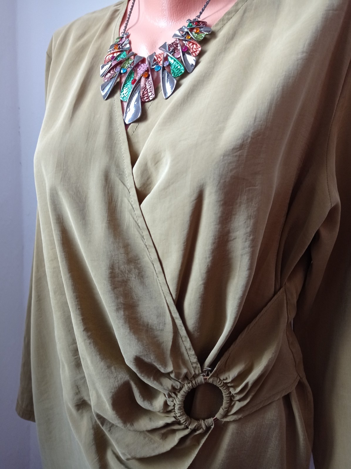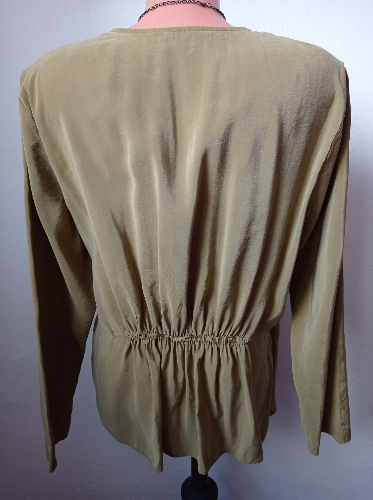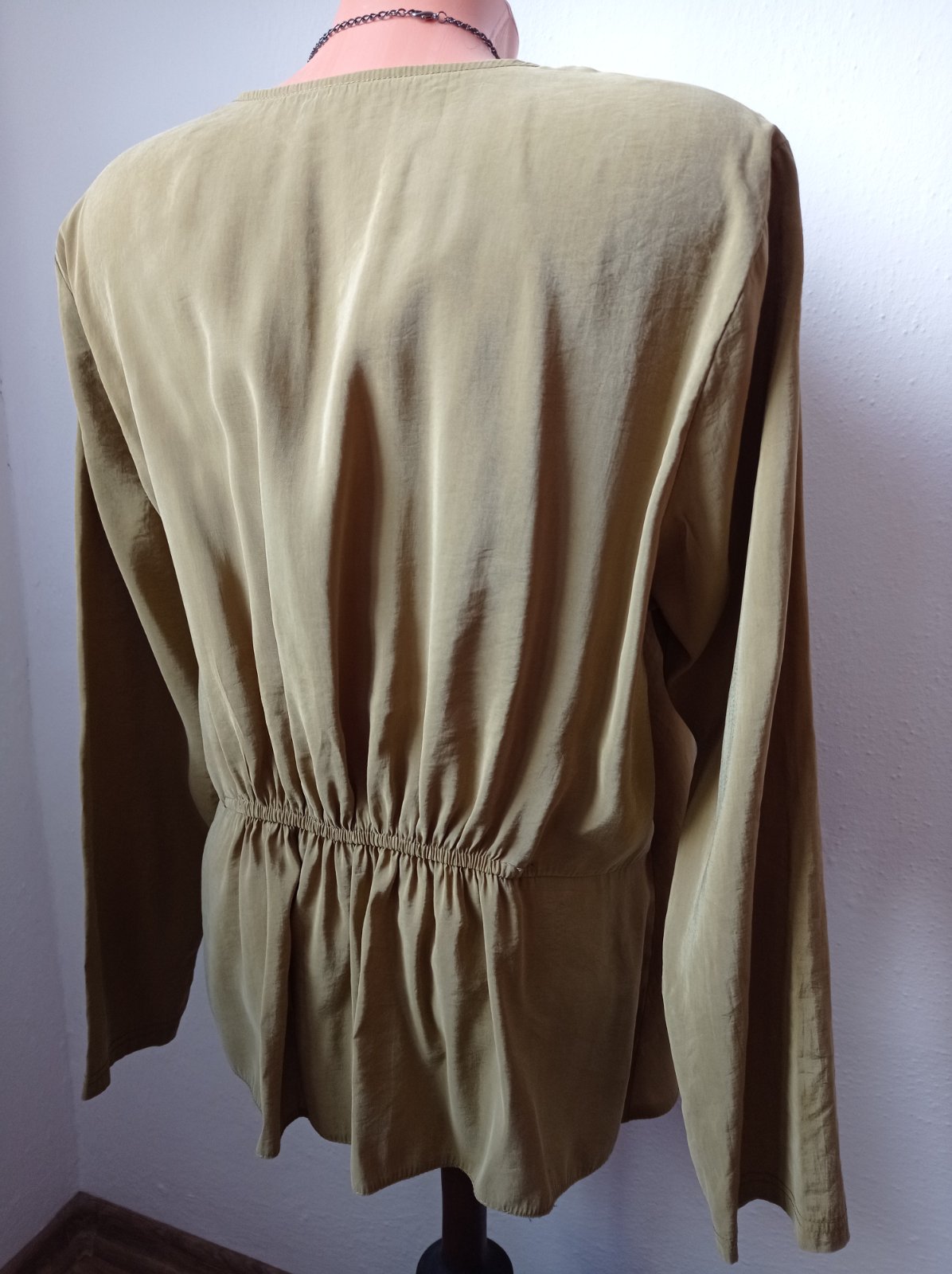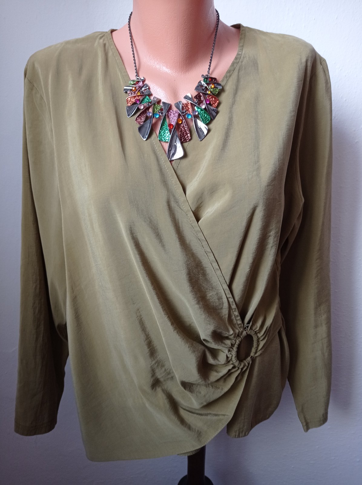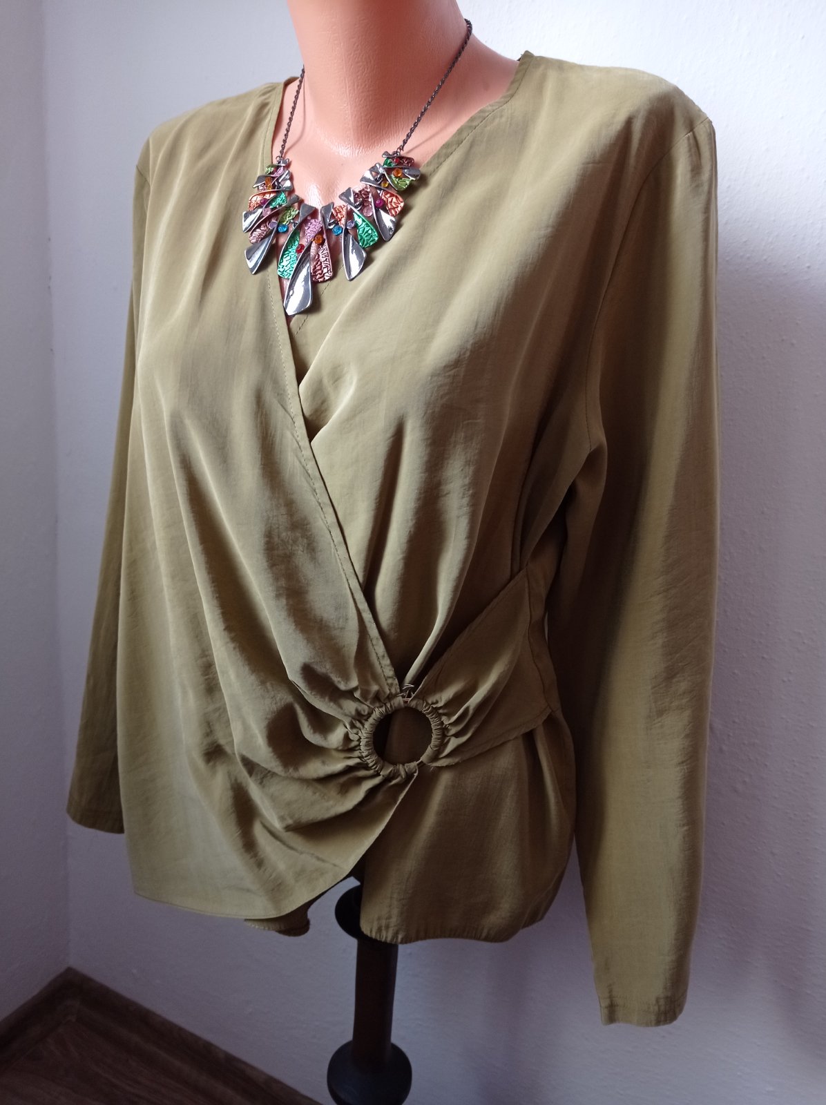 Blúzka je vo výbornom stave, z príjemného materiálu, má krásny zavinovací strih, vzadu v páse je stiahnutá gumičkou. Veľkosť 40, dĺžka 63 cm. Predáva sa bez náhrdelníka.