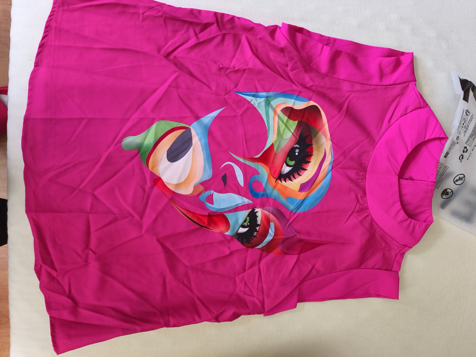 Málo nosená, top stav, základná farba je pink, univerzálna veľkosť, voľný strih, obv. meraná pod pazuchami 46,5cm, predná dľ.65cm, zadná dľ.61cm Cena je 2,50 eur+poštovné