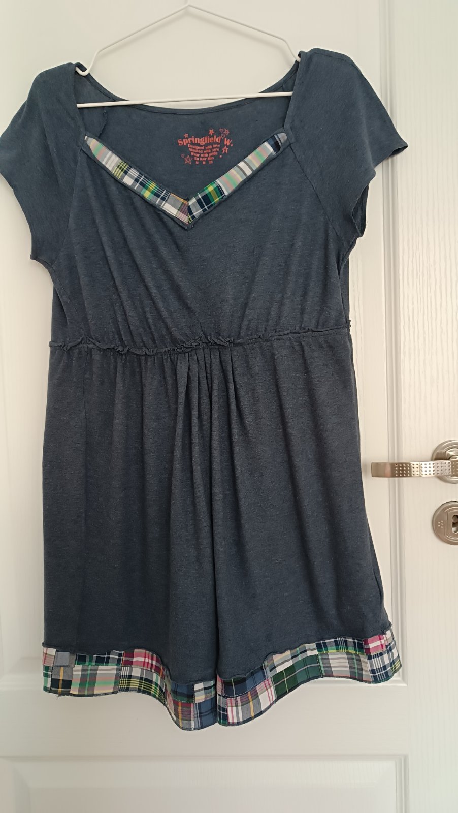 Dĺžka 78 cm, šírka pod pazuchami 44cm, pás 40 cm, 100 % bavlna, značka Springfield, uvedená veľkosť M ale myslím že skôr veľkosť L, taká modro šedá farba