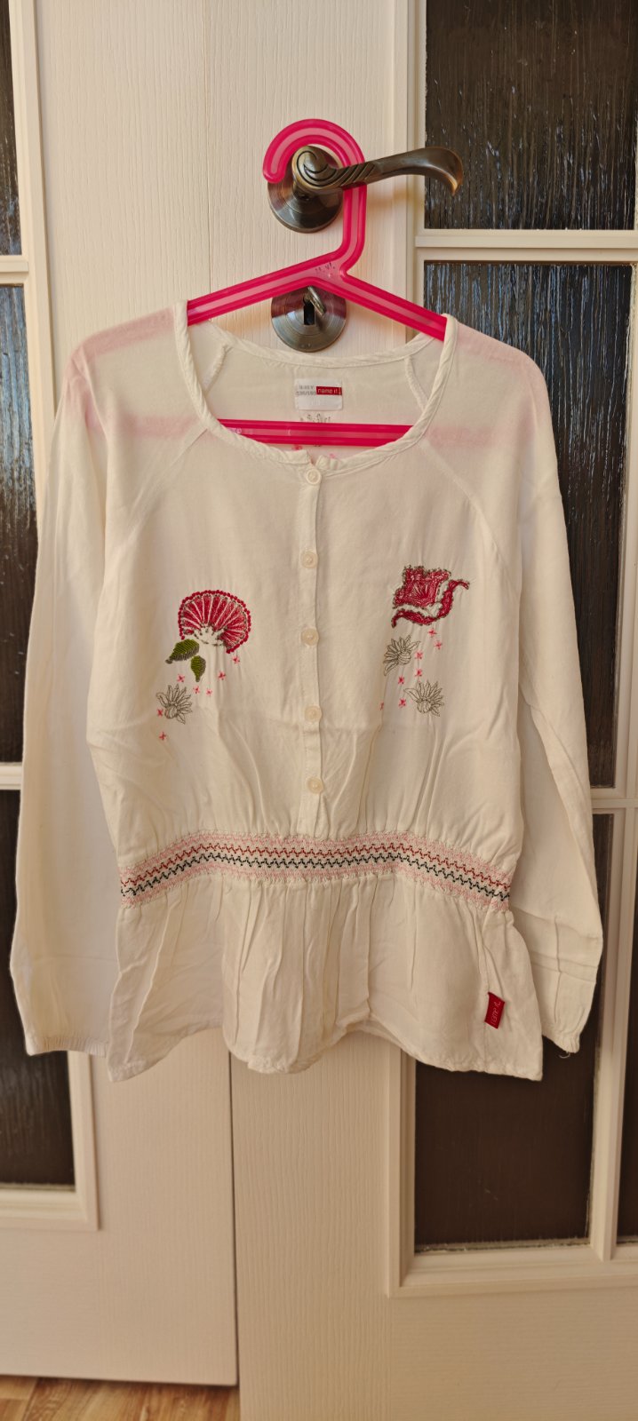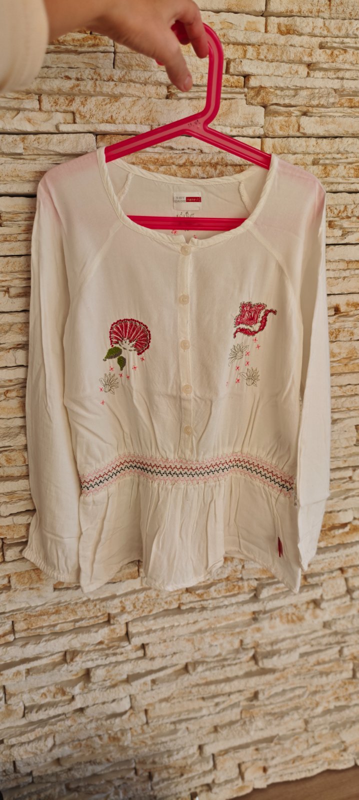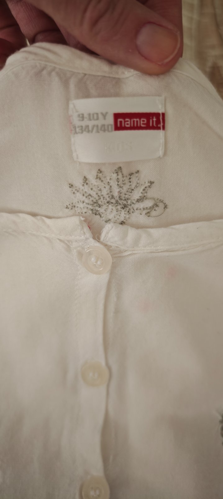 Predám zaujímavú bielu blúzku s dlhými rukávmi a výšivkou, značky name it. Blúzka je jemnulinka, na rukávoch a v páse do gumičky. Osobný odber v Petržalke. Poštou pošlem po pripísaní platby na účet.