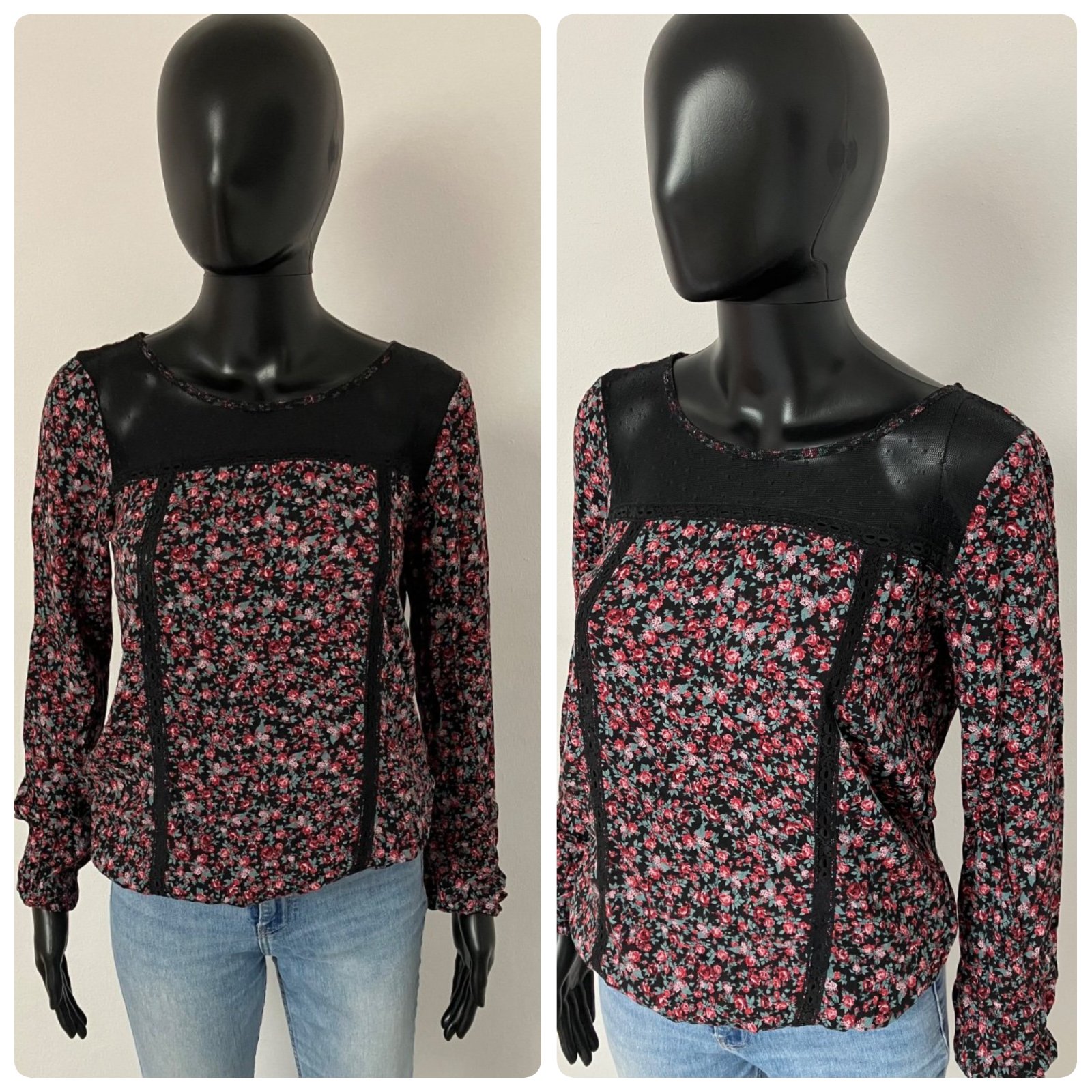 Dámska kvetovaná blúzka s dlhým rukávom, čipka, guma na spodku a na konci rukáva, jemne elastická, materiál 100%viskóza.