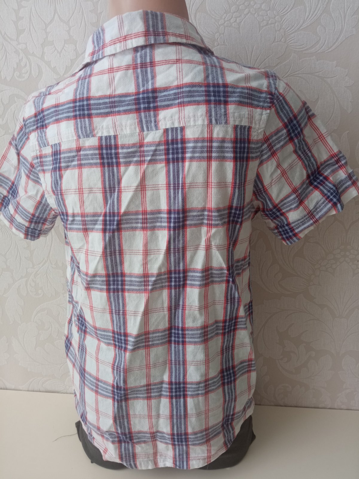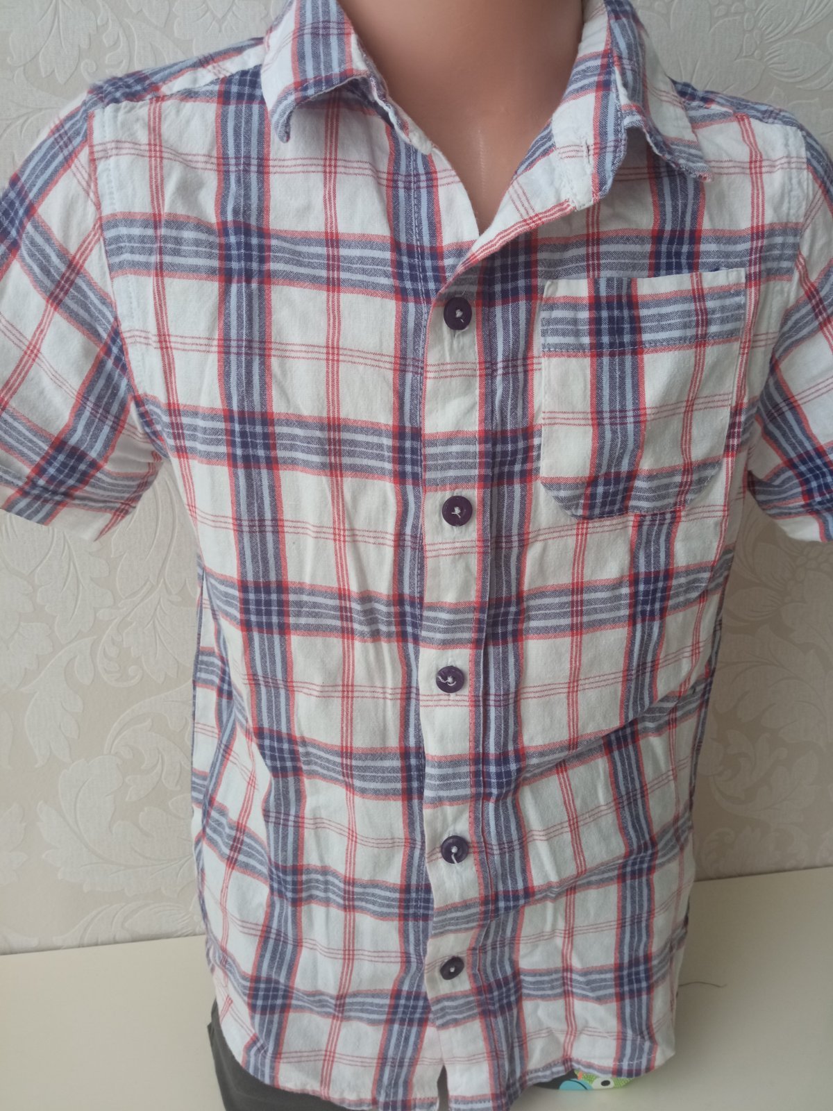 Chlapčenská kockovaná košeľa s krátkym rukávom, zapínanie na gombíky, jedno vrecko na hrudi, nie je elastická, materiál 100%bavlna, farba modro-červeno-biela.