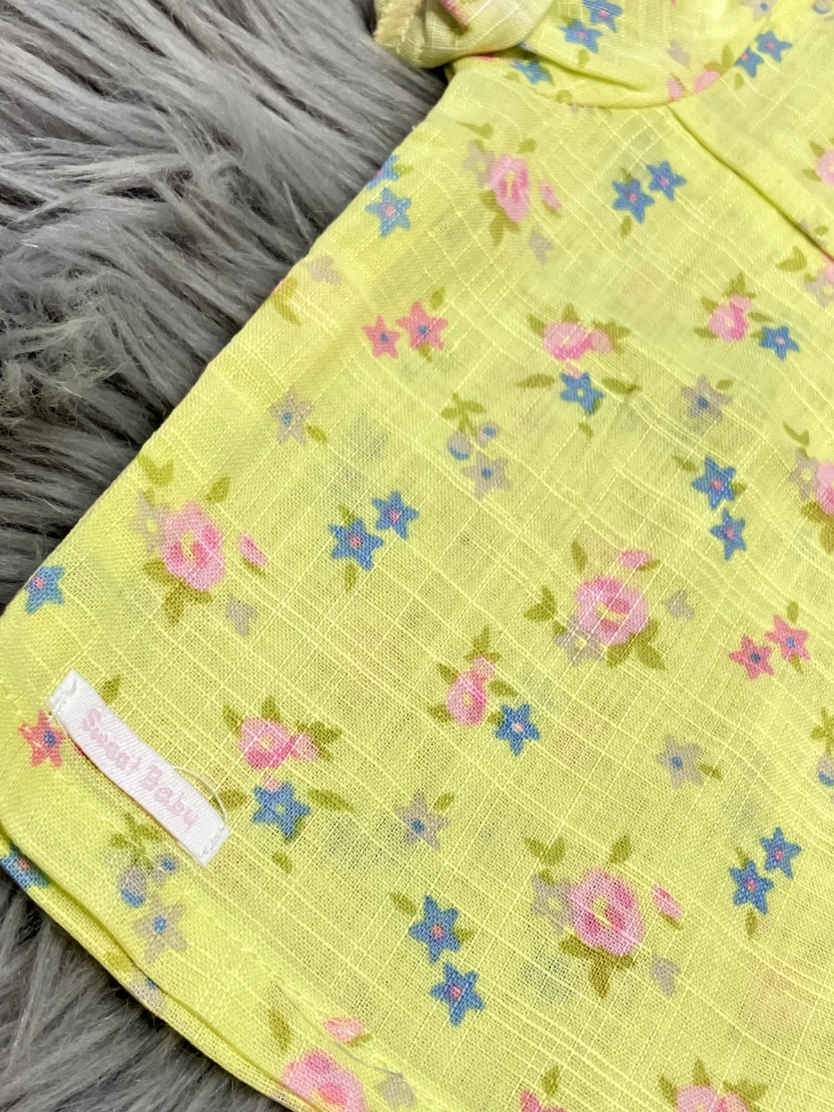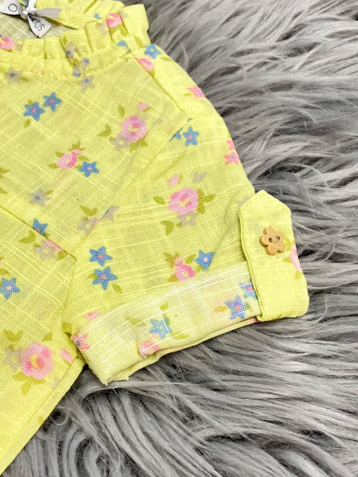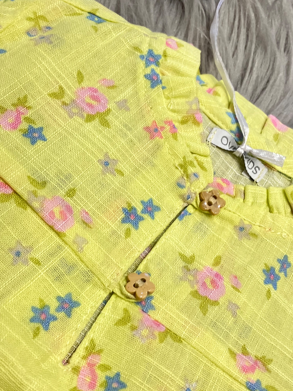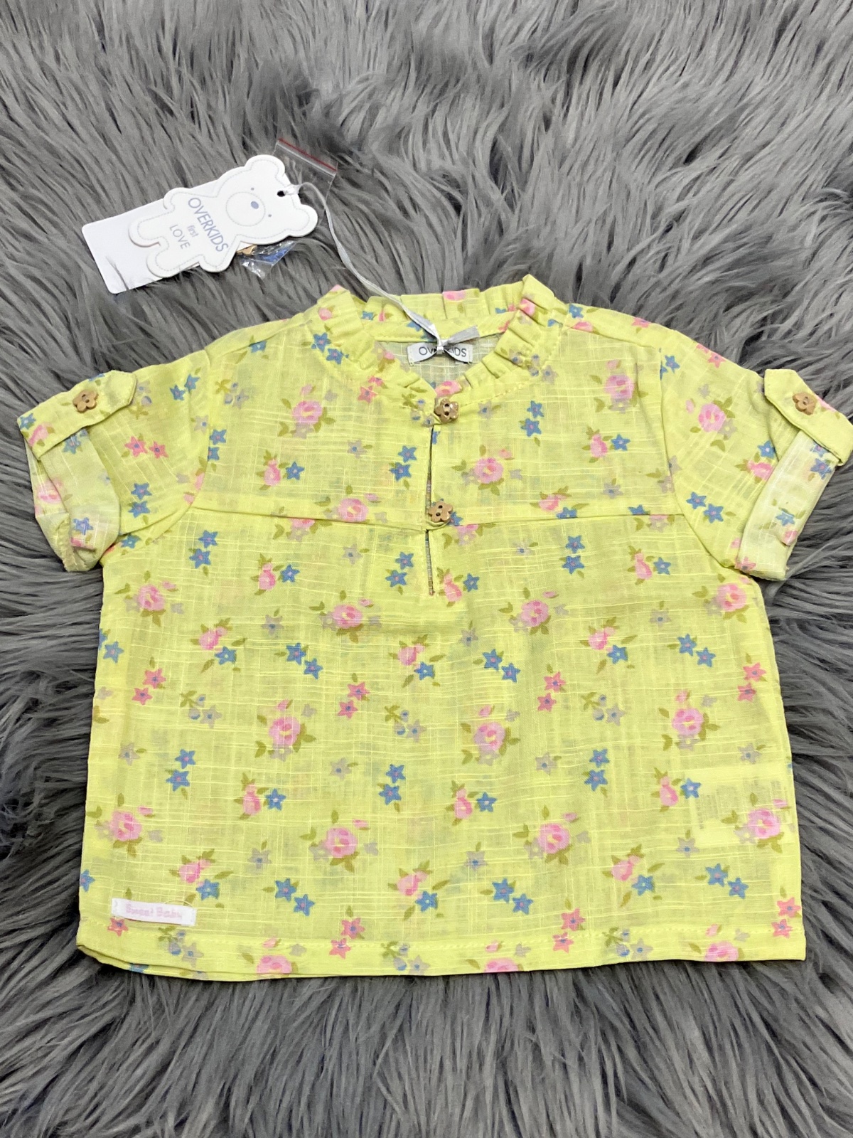 SkladomDievčenská košeľa s krátkym rukávom značky Overkids. Vzor a gombíky kvety. Veľmi tenká, ako ľanová. Jemne elastická. Pre 1-3 mes. Materiál: 100%bavlna.