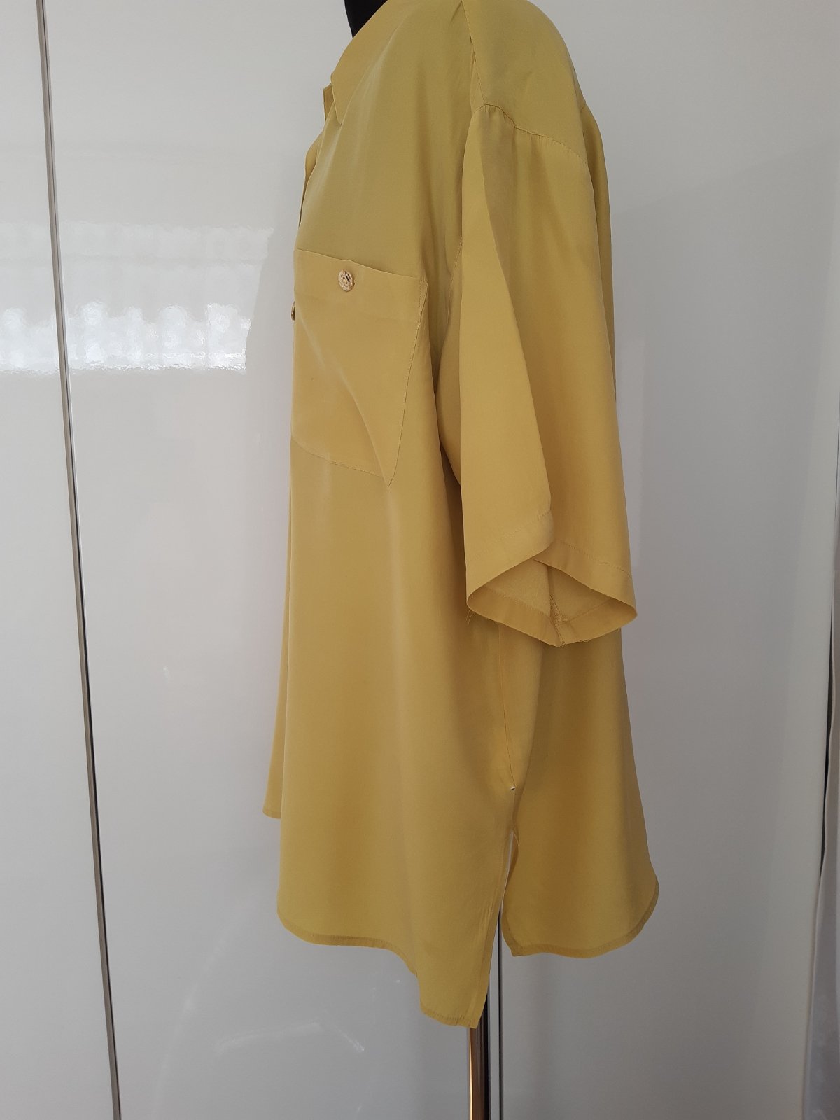 Voľný strih, širšie, voľné rukávy, kvalitný hodváb. Dl. 86 cm, šírka 71x2 cm, rukáv ja spadnutý, Udávaná veľkosť je 44, ale podľa rozmerov je to cca 48/50.Blúzka je vo veľmi dobrom stave.