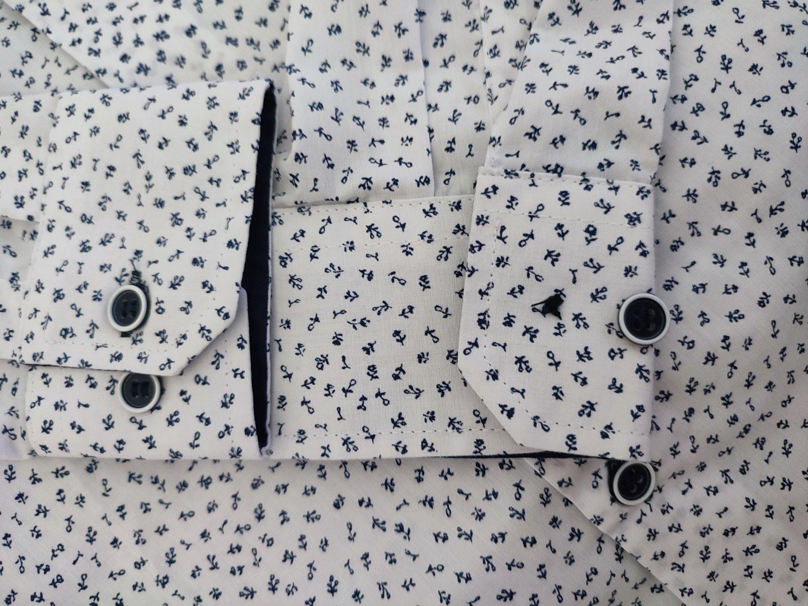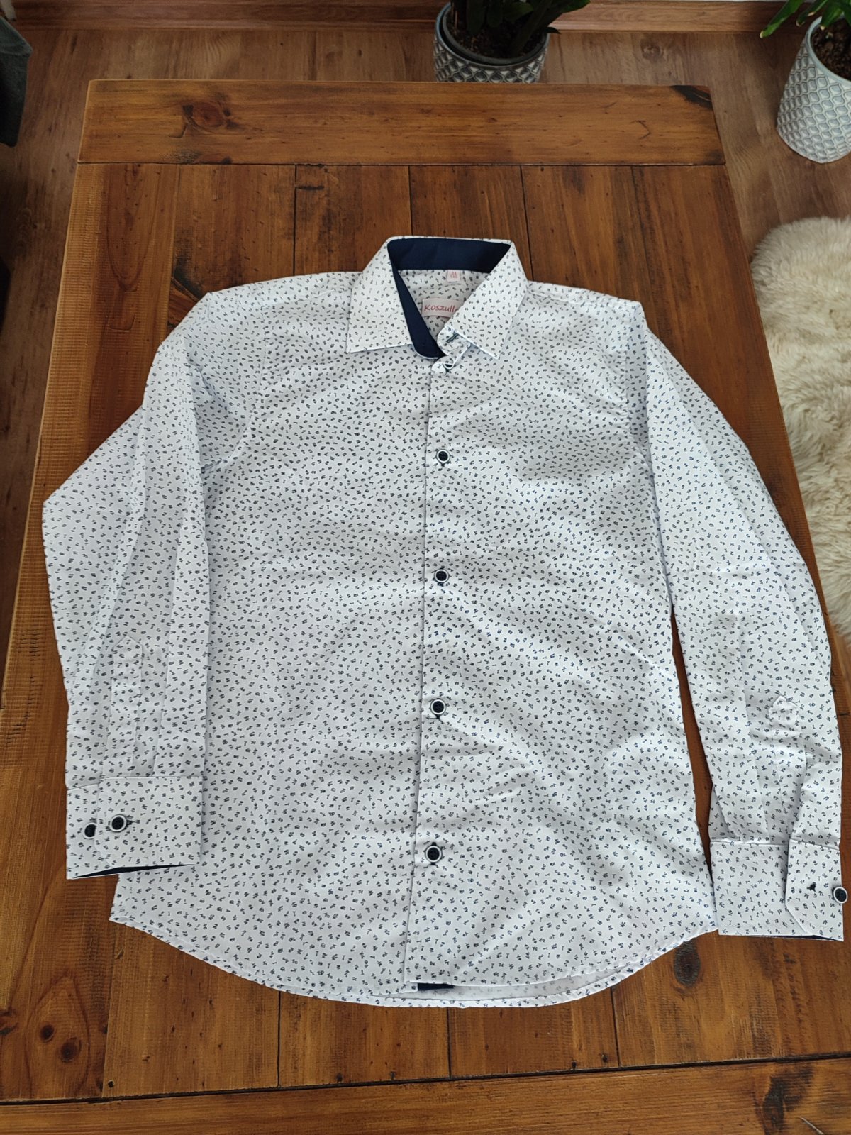 Krásna košeľa na rôzne slávnosti čistá bez fľakov akurát môj syn stratil gombík na jednom rukáve ,ale da sa to zakryť podhnutim rukáva alebo prikúpiť gombík a opraviť viď foto cena je zohľadnená.