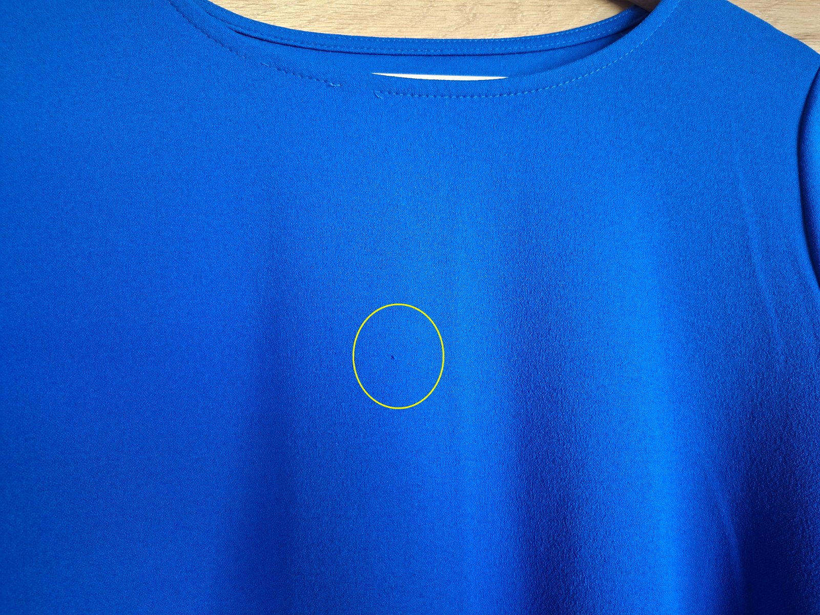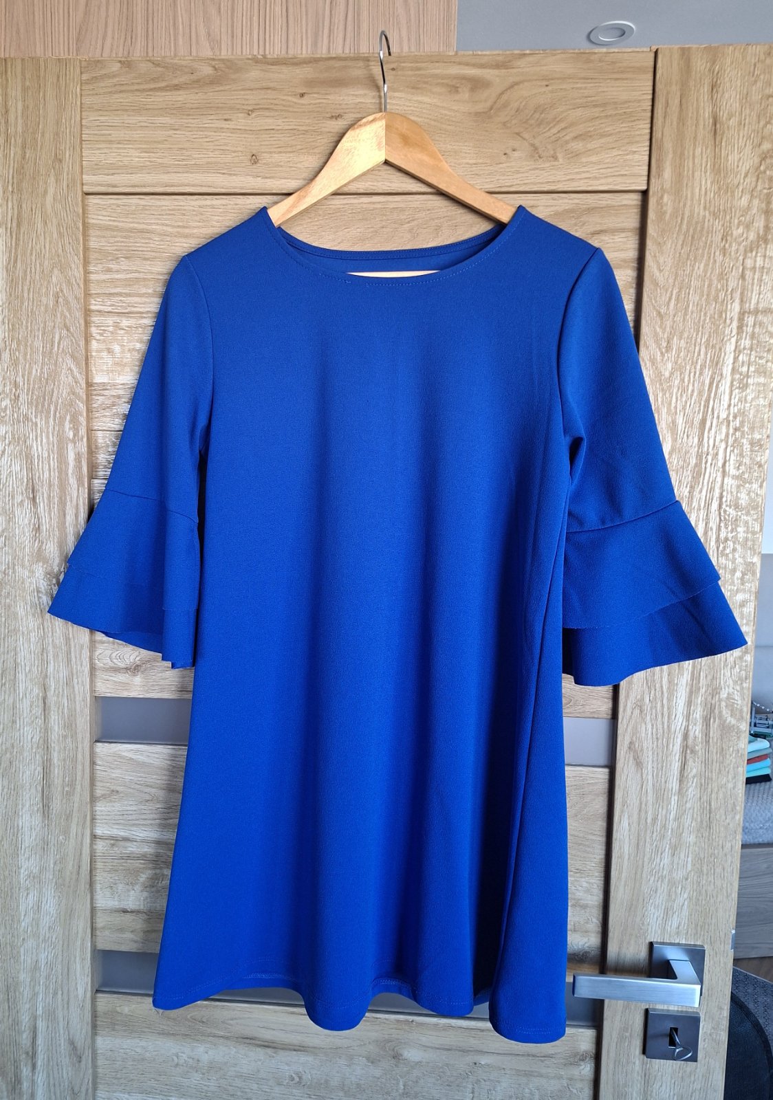 Elegantná dámska tunika vo veľmi dobrom nosenom stave (bez dierok, fliačikov a žmolkov; 1 zatrhnuté miesto na prednej strane - detail viď foto č.2). Tunika má jednoduchý voľný strih - odvážnejšie dámy ju môžu nosiť aj ako minišaty :-). Je ušitá z príjemného, nekrčivého materiálu; má 3/4 rukávy s volánmi. Obliekanie cez hlavu, bez zipsov a gombíkov.