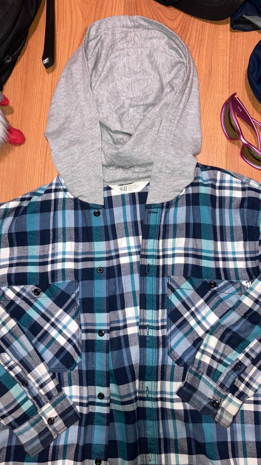 Károvaná košeľa s kapucňou, nosená, ale v peknom stave. Bez dier a poškodení. Zapínanie na gombíky, dve náprsné vrecká, kapucňa z príjemného materiálu