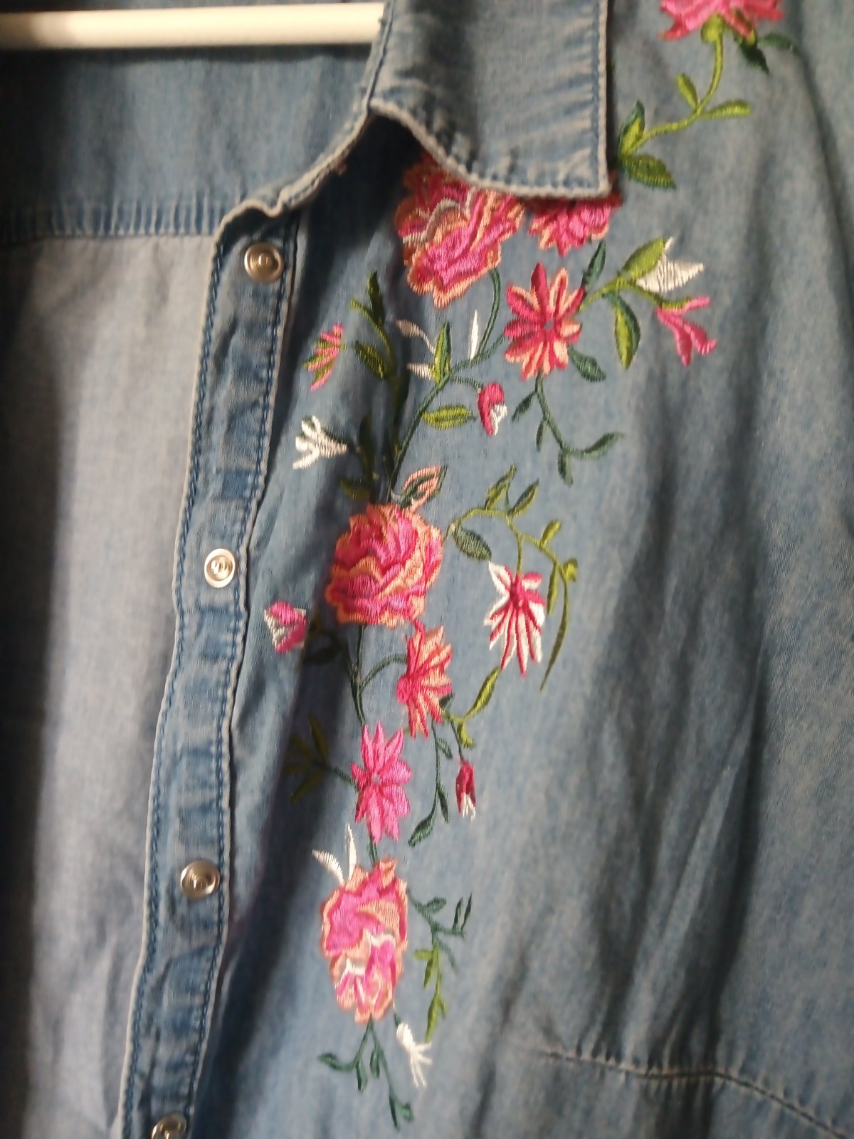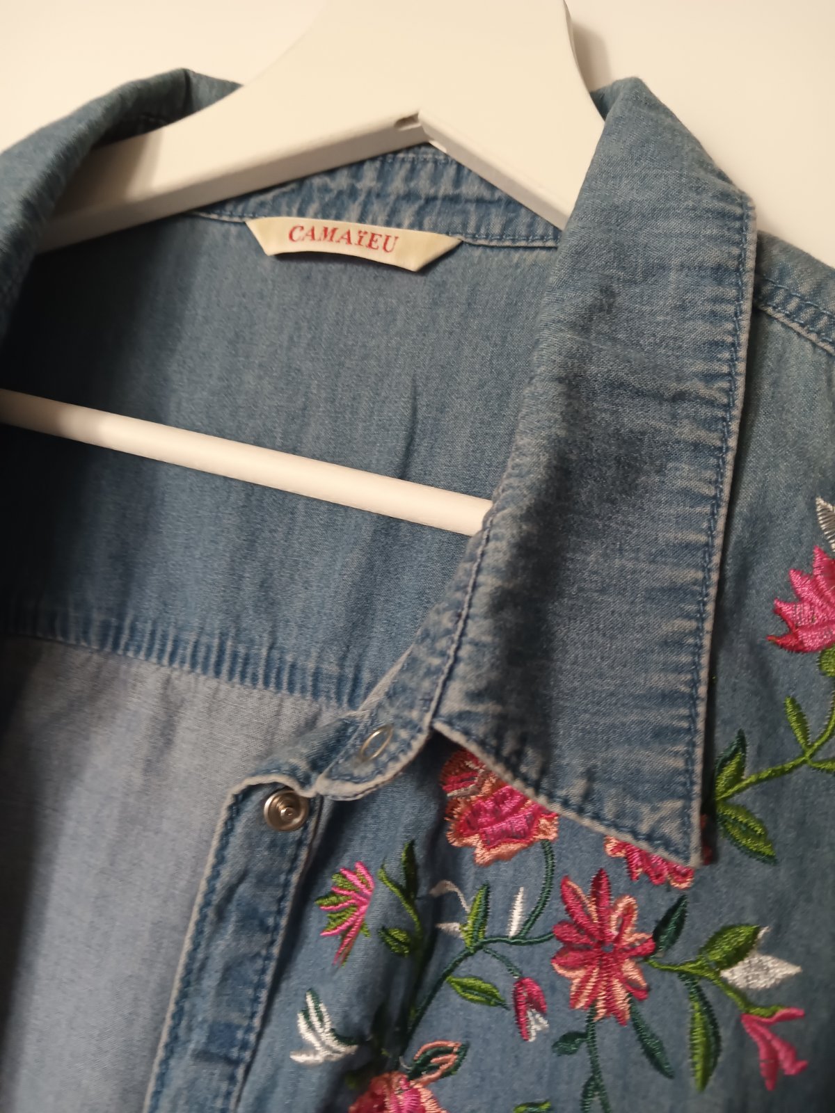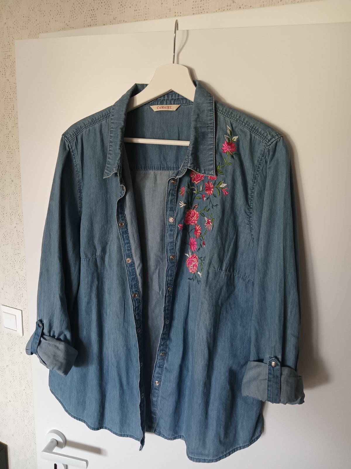 Jeansová košeľa značky Camieau, veľkosť 42, farba modrá, kvietky vyšívané malinové ako na fotke, jemné, neelastické. Mäkká látka.