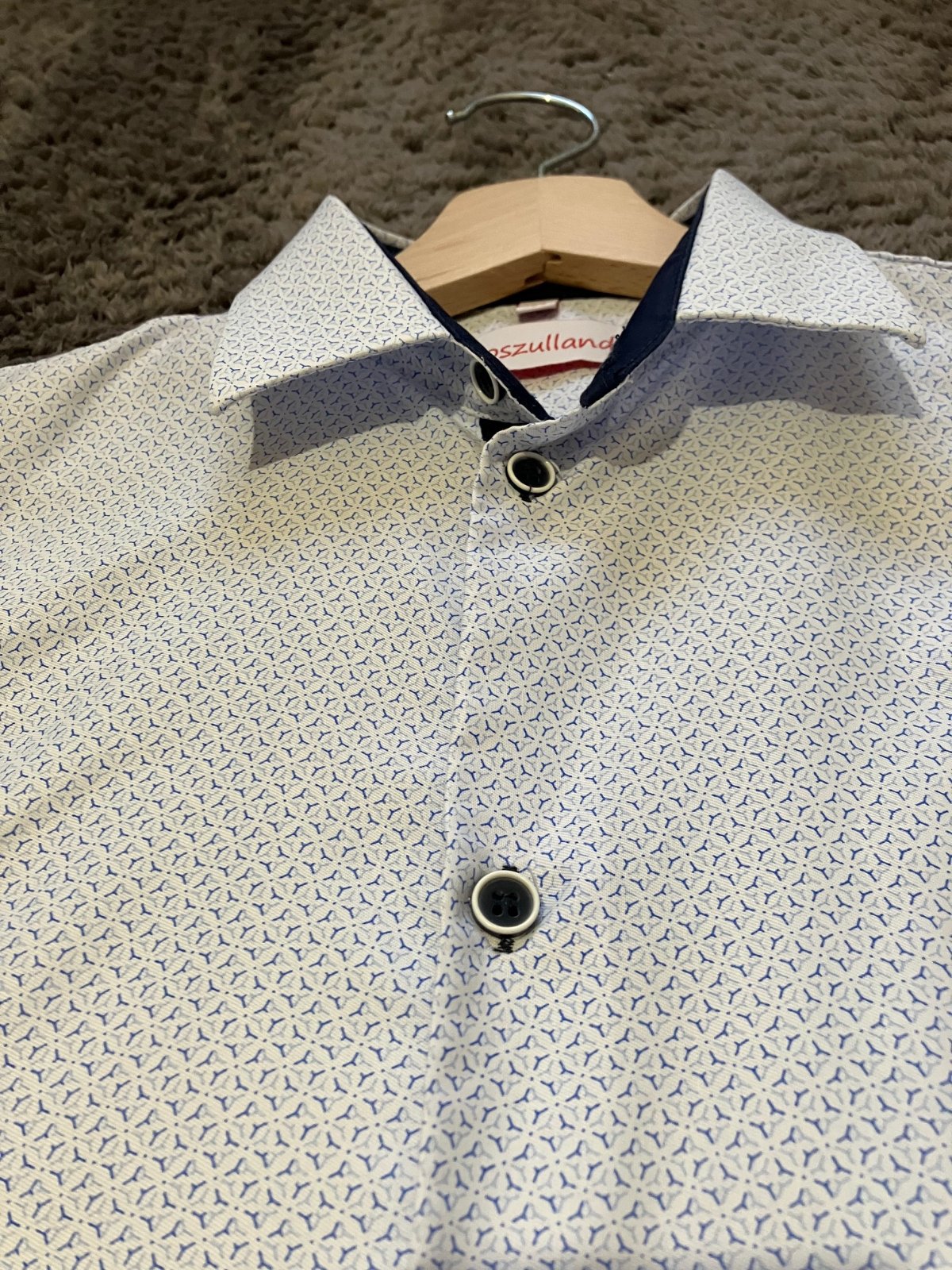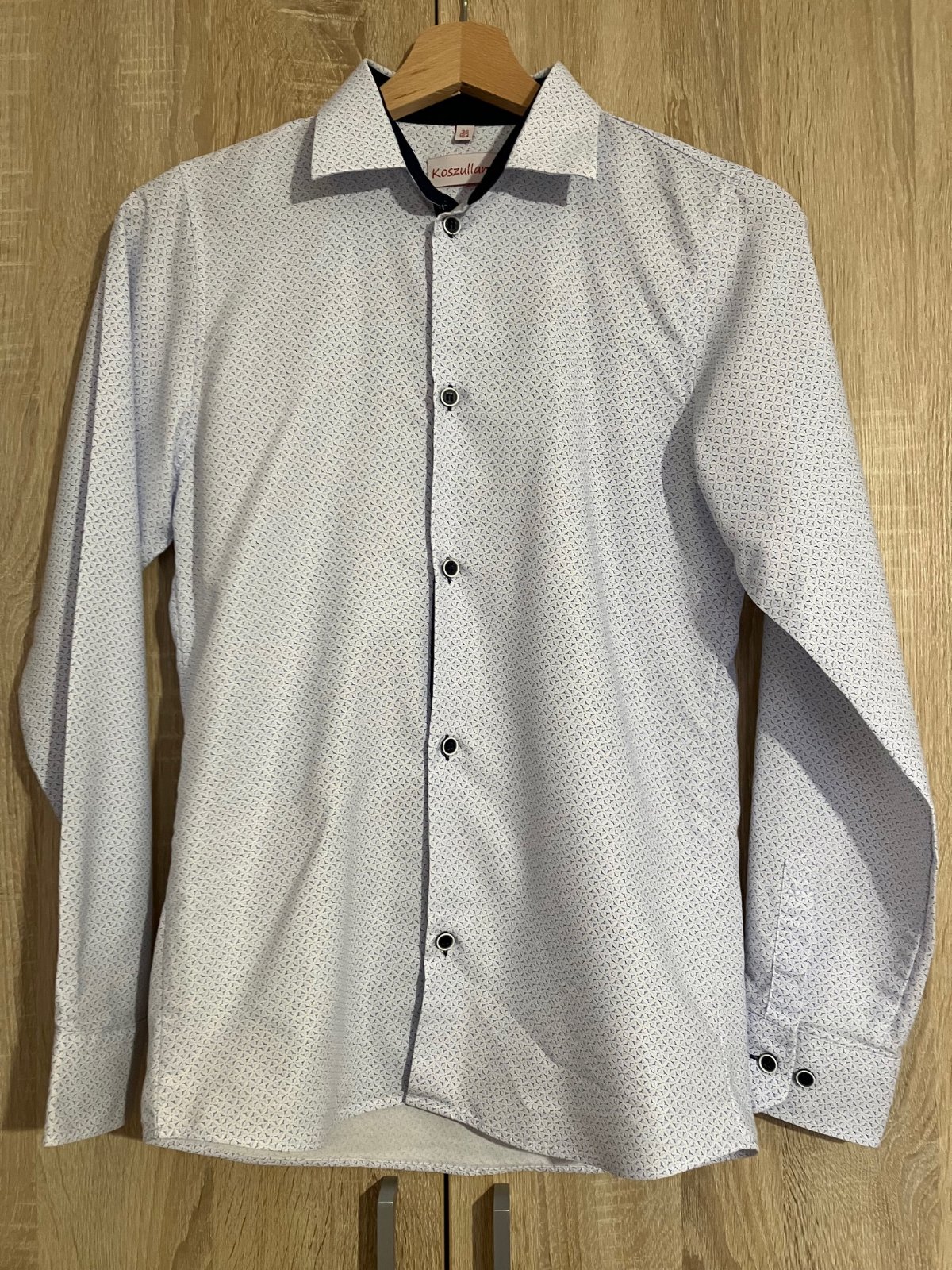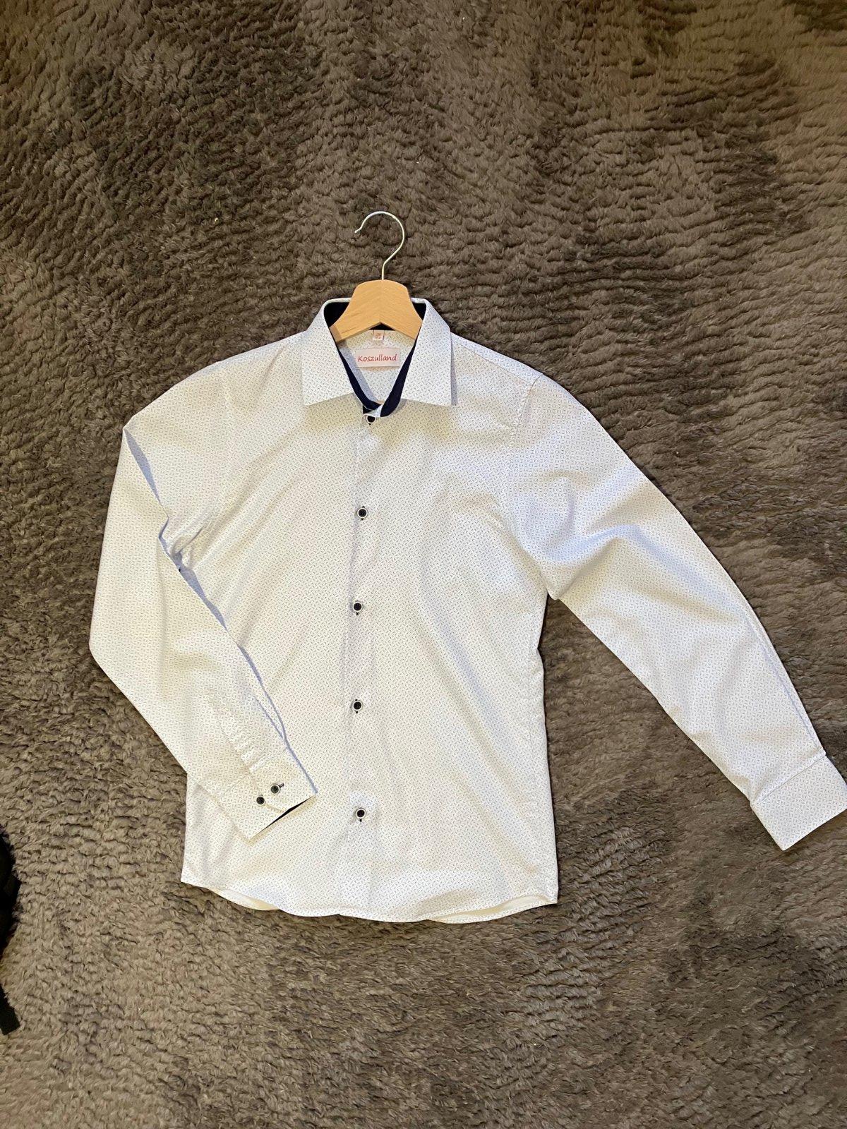 Elegantná chlapčenská košeľa slim fit, ale sadne aj inej postave. Veľkosť na košeli síce 164, ale reálne v. 158. Jemný modrý vzor. Rozmery: dĺžka od ramena nadol 60 cm, cez hruď vyššie 42 cm, nižšie 41 cm (slim fit), dĺžka rukáva 57 cm. 1 x použitá, tip top stav, kupovaná v butiku.