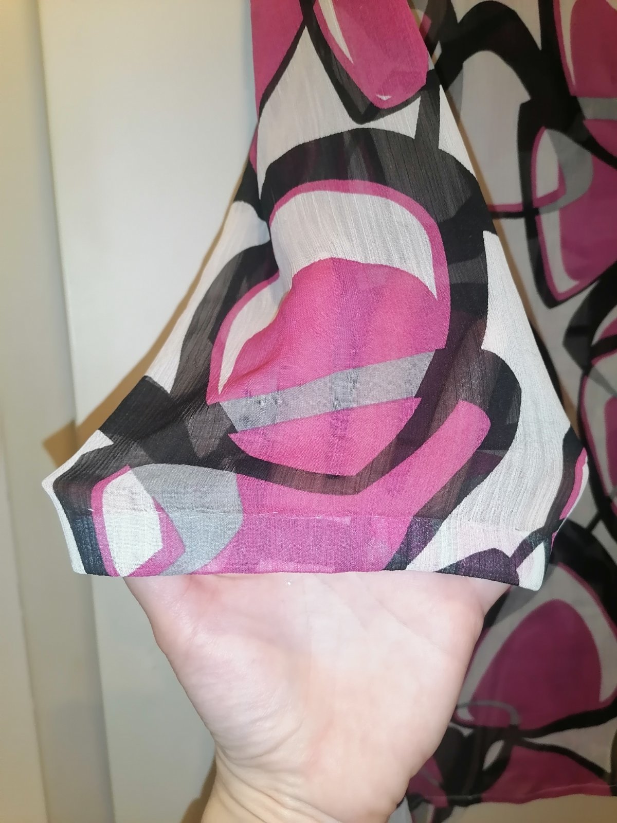 kombinácia cyklámenovej s červenou, bez známok nosenia, prsia 58 x2, dĺžka vpredu 67, vzadu 62, rukáv 43, vzadu krátky zips.Náhrdelník nie je súčasťou ponuky