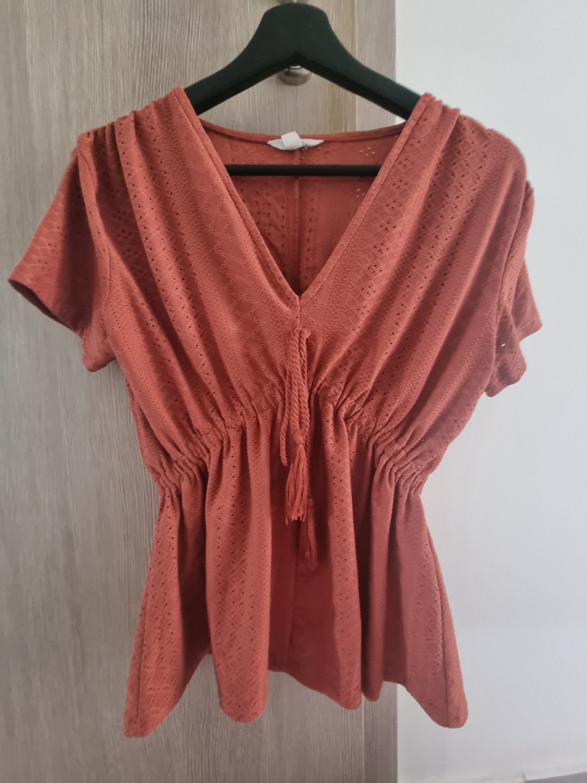 Krásna blúzka jemnej marhuľovej farby. Chrbát je transparentný. Skoro nenosená. Jeden krát vzatá. Je to väčšie S-ko. Dĺžka predného dielu je 54 cm, zadného 62 cm. Šírka 50 cm.