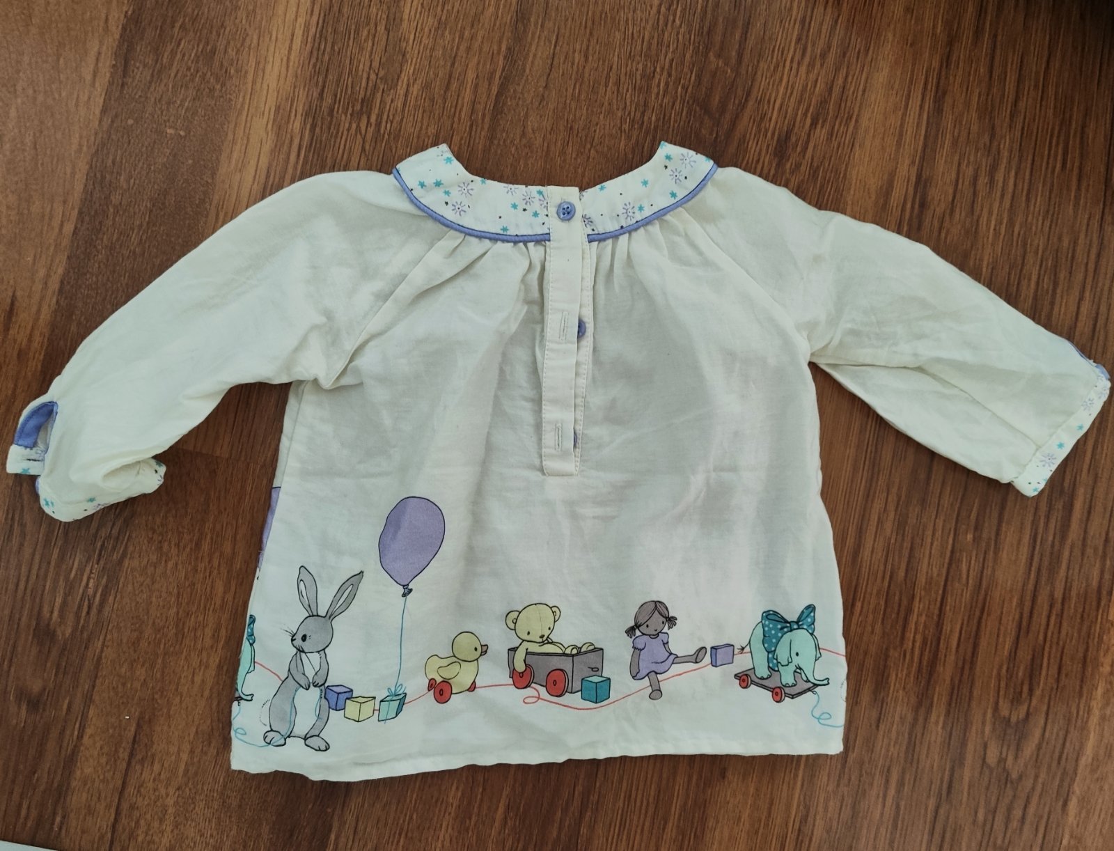 Nádherná ľahká košieľka maslovej farby veľkosť 3-6 mesiacov , oblečená párkrát , super stav, jediná chybička okolo goliera je na 1 cm trošičku poškodená, - fotka ( pravdepodobne sa to stalo pri pra...