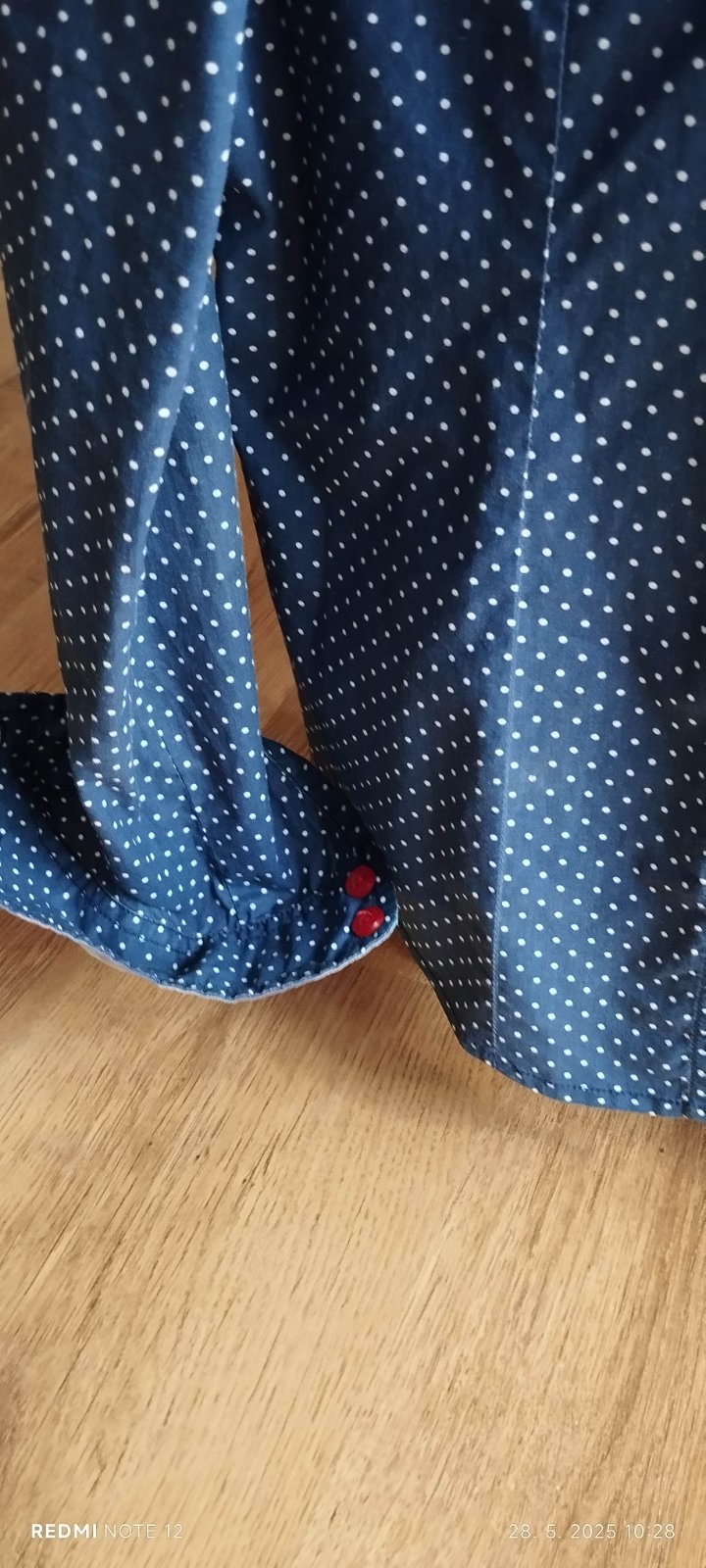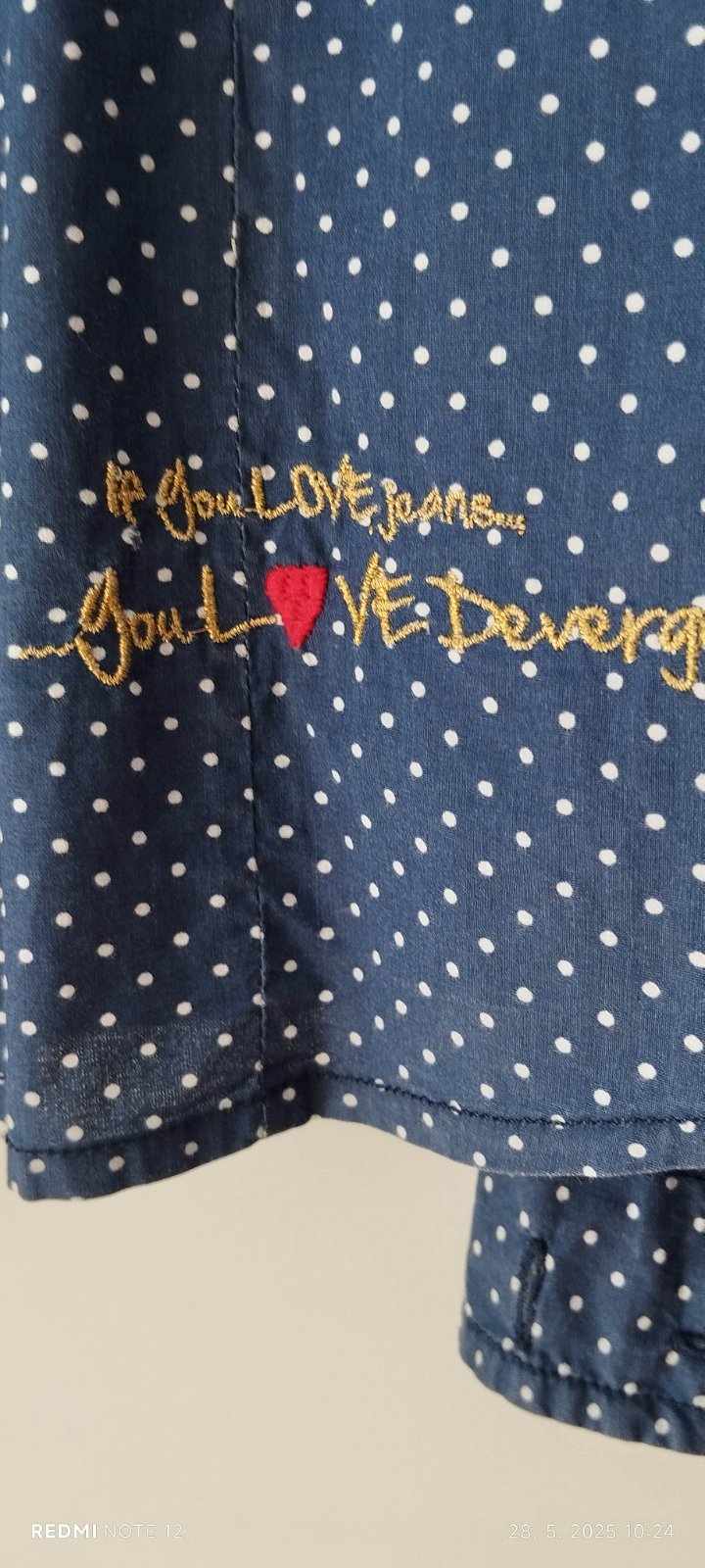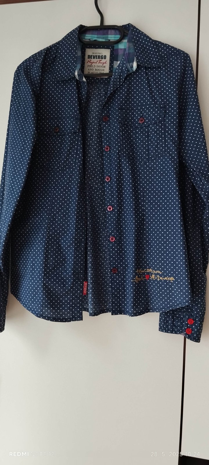 Riflová košeľa ľahkého materiálu vo veľkosti S značky Devergo. Košeľa je modrosivej farby, zapínanie na cvoky, vpredu na prsiach 2 malé vačky, na chrbte veľmi pekne popísaná textom žltej farby. ...