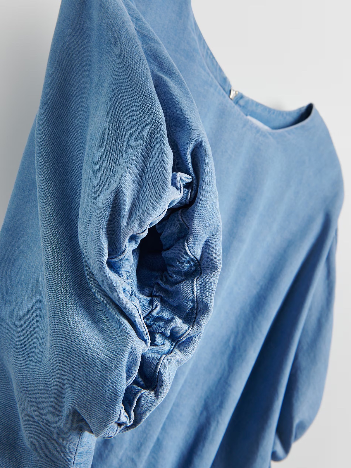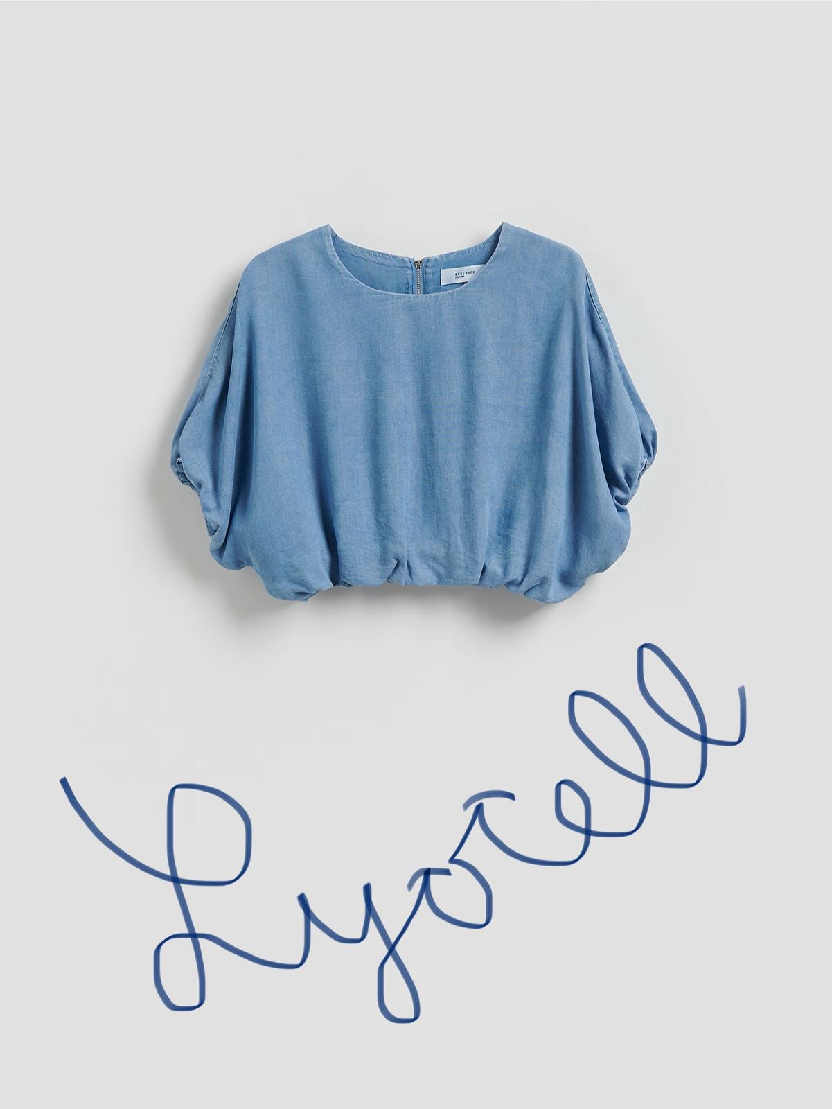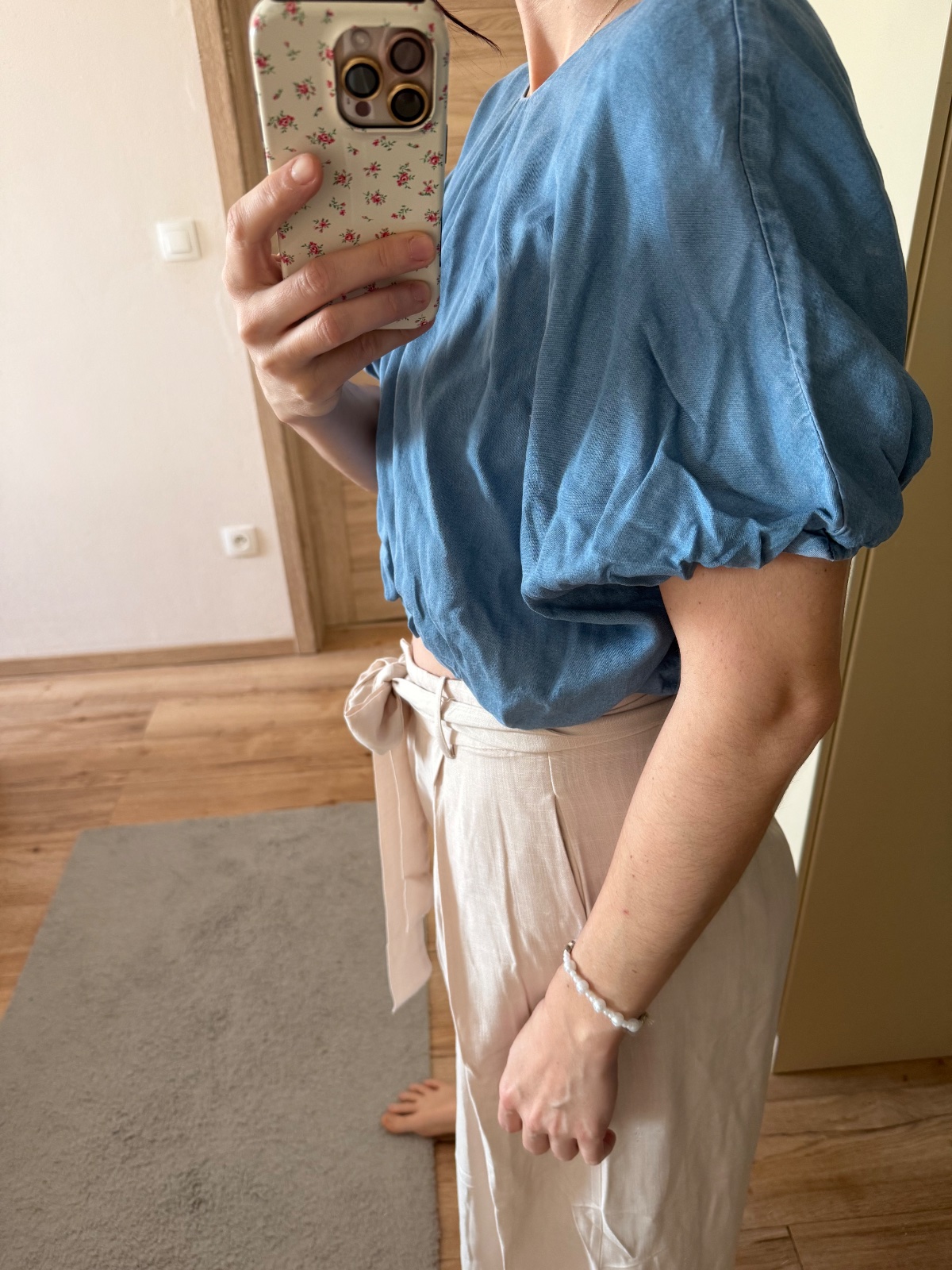 Nadychana skratena bluzka z rady Premium, PC 30€. Material je lyocell, velmi prijemny na telo, je podsita. Farba je alo svetla dzinsovina, ale na dotyk hebka.