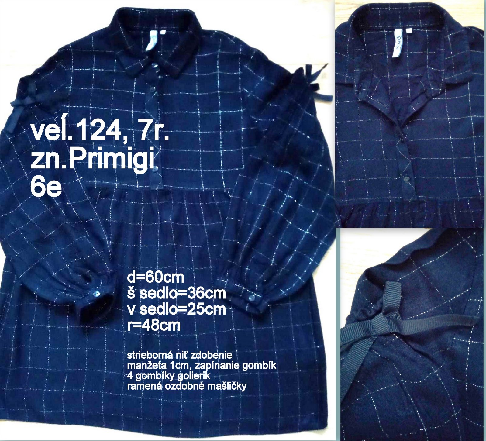 Predám dievčenskú blúzku veĺ.124, zn. Primigi, d=60cm, š sedlo=36cm, d sedlo=25cm. r= 48cm, 1cm široká manžeta, zapínanie na 1 gombík, golierik má zapínanie na 4 gombíky, materiál tenší, celé pretkávané striebornou niťou, na ramenách ozdobné mašličky, top stav