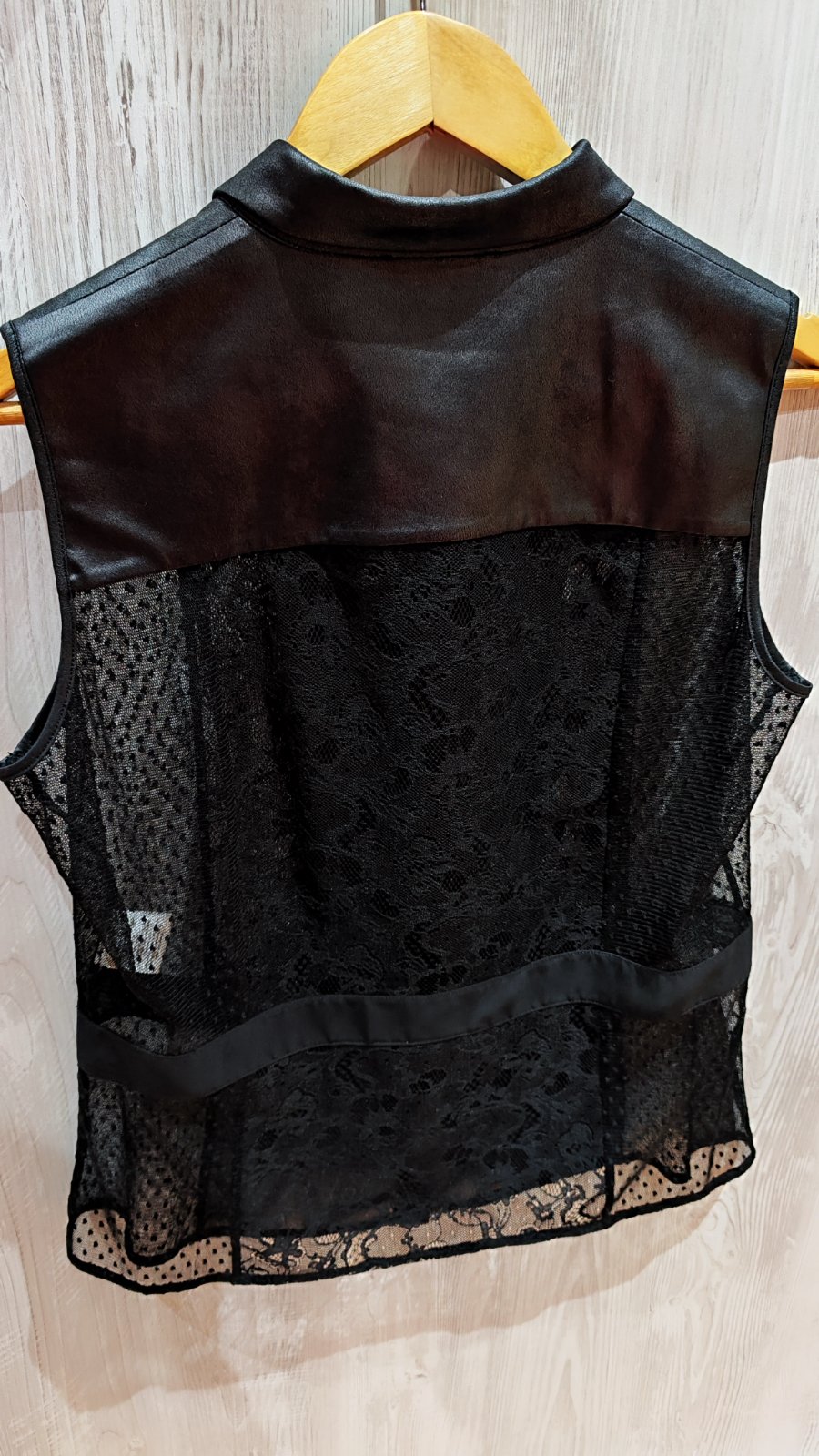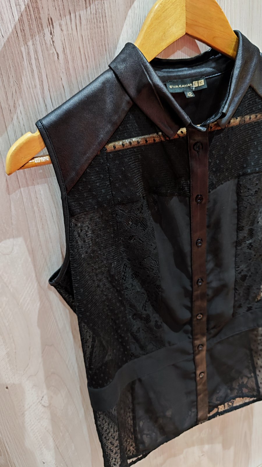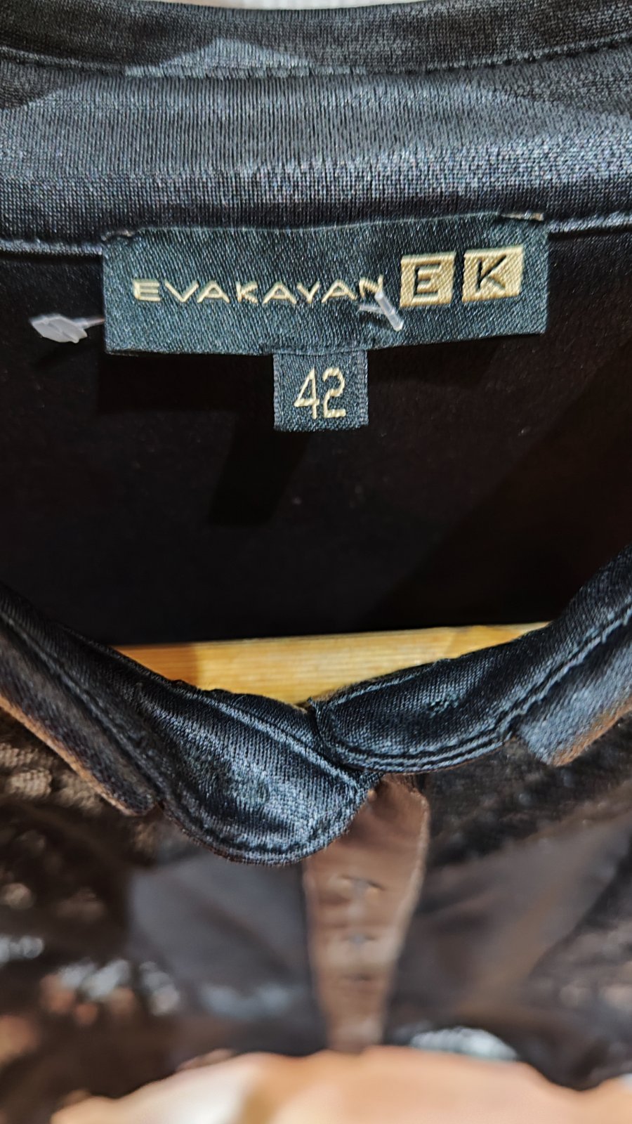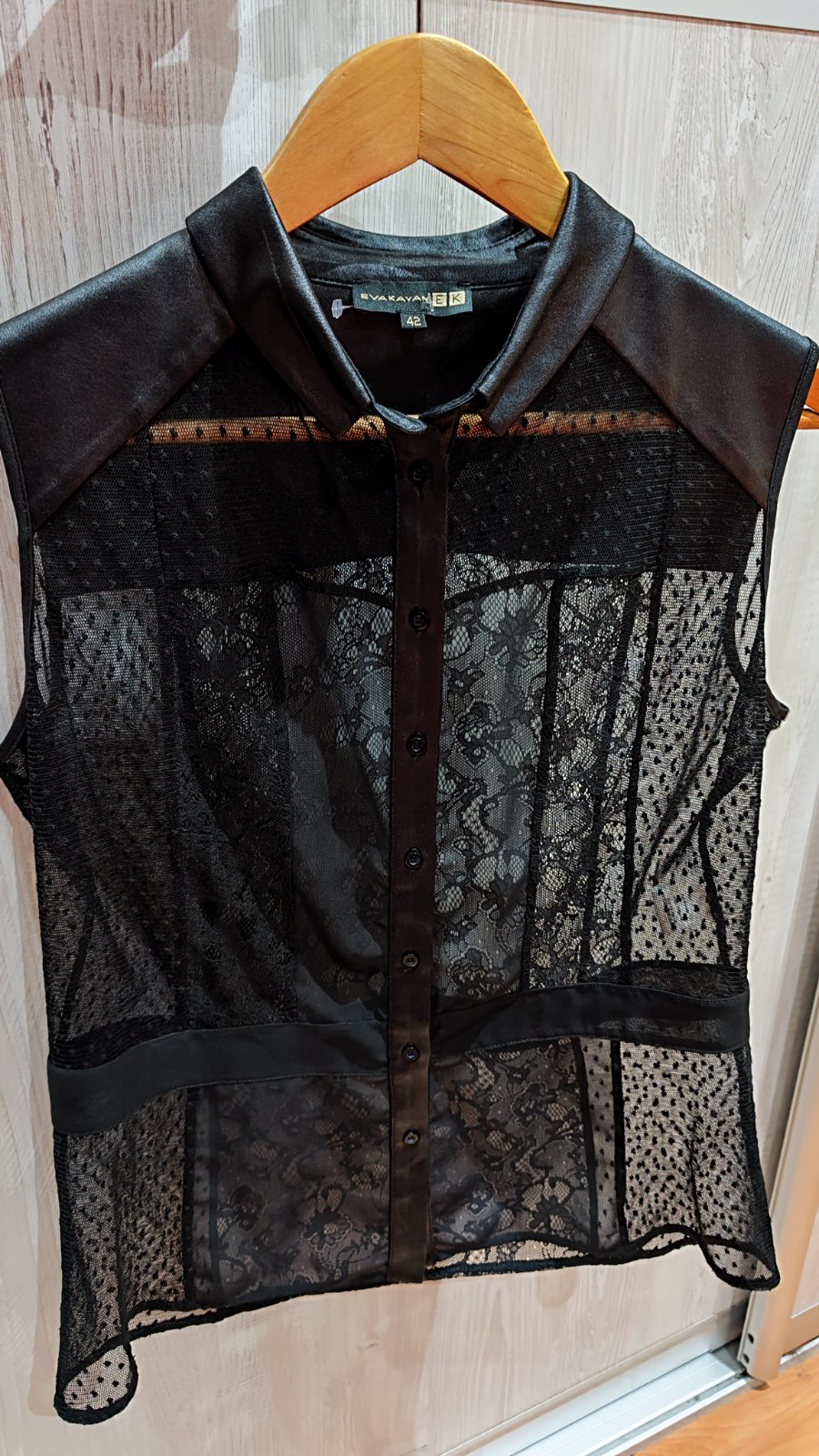 Blúzka prestížnej francúzskej značky Eva Kayan, veľkosť písaná 42, sedí na také M-ko. Od pazuchy k pazuche v neoblecenom stave má šírku 48 cm a v pohode sa natiahne až do 58 cm.