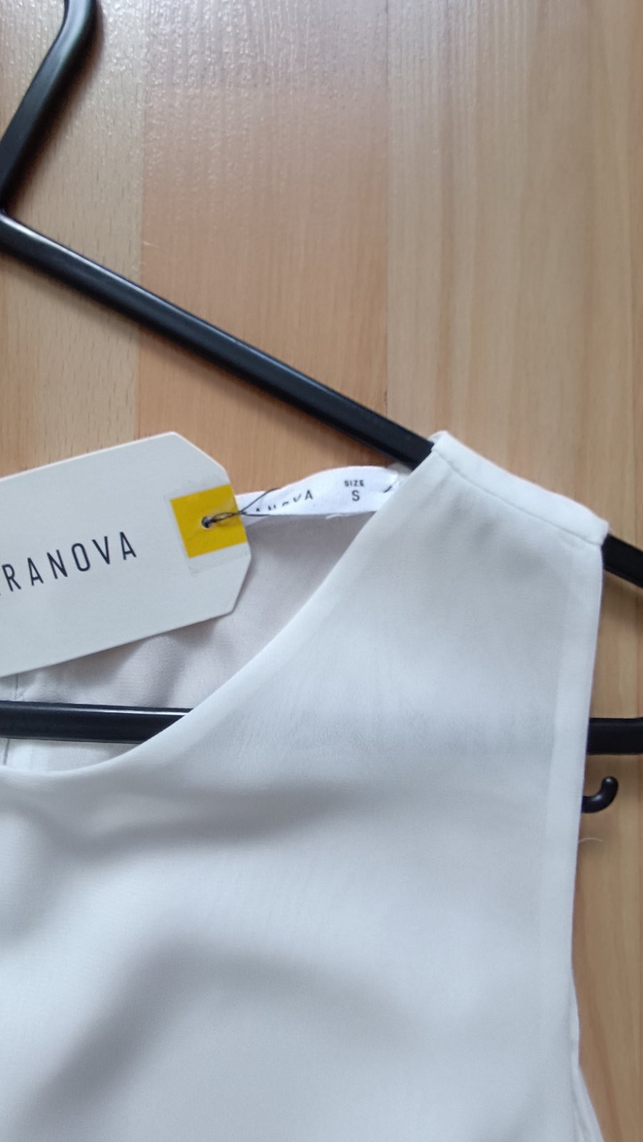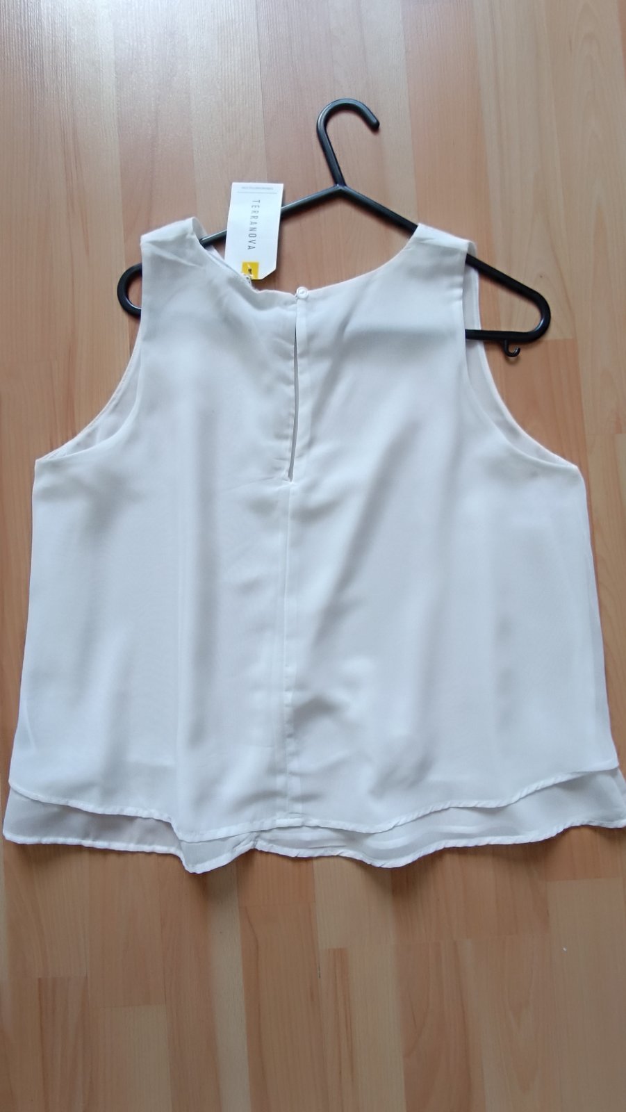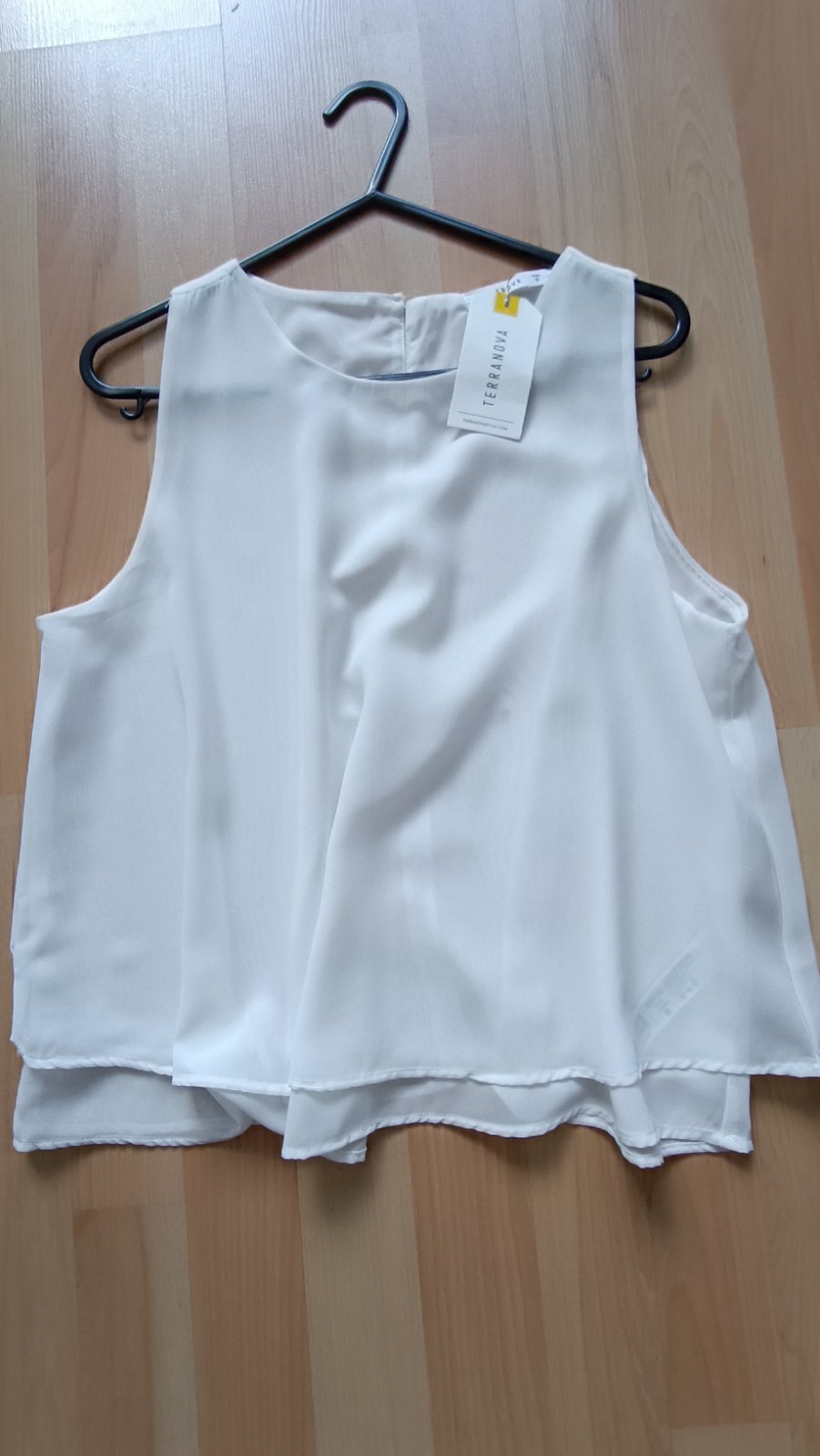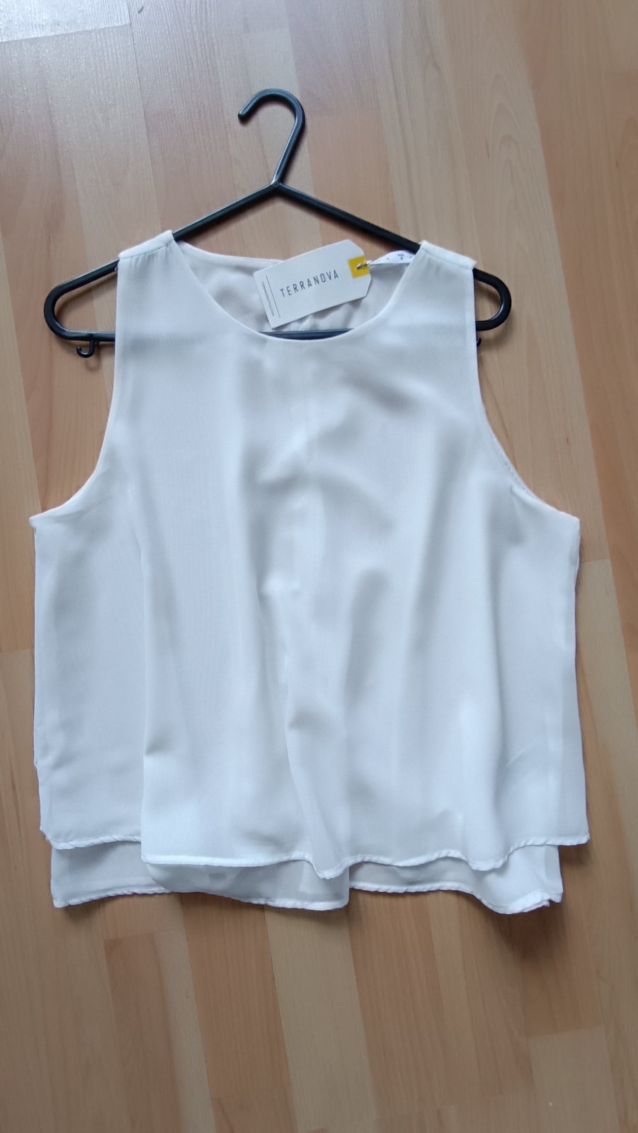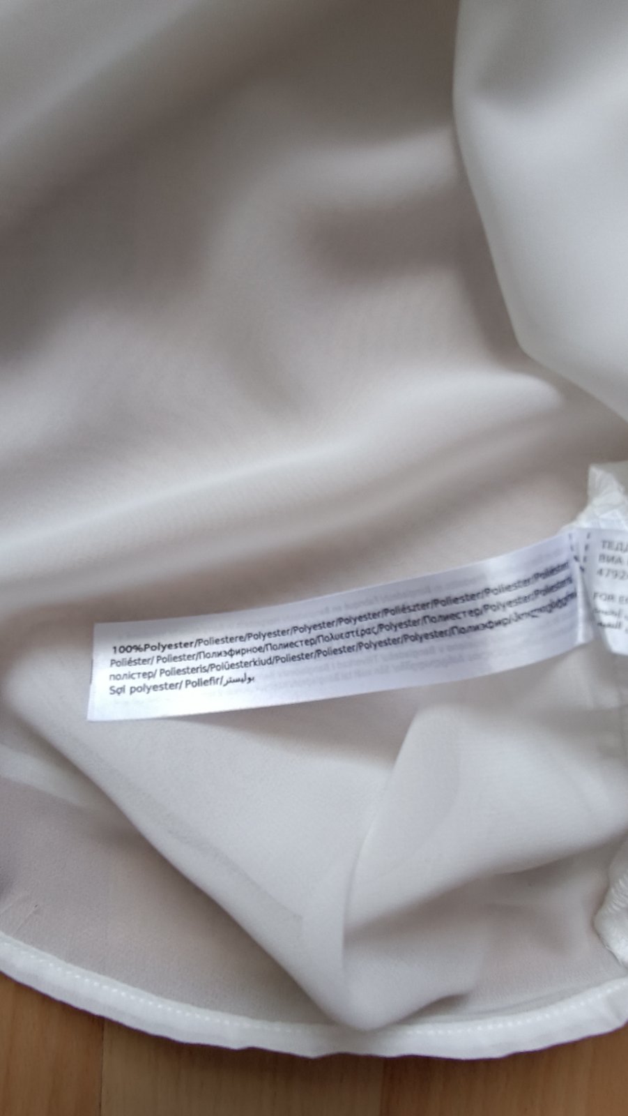 Dĺžka 52cm, šírka pod pazuchami 50cm, rozširuje sa, mierne presvitá, vzadu na gombík, 100 % polyester, uvedená veľkosť S, ale skôr veľkosť M