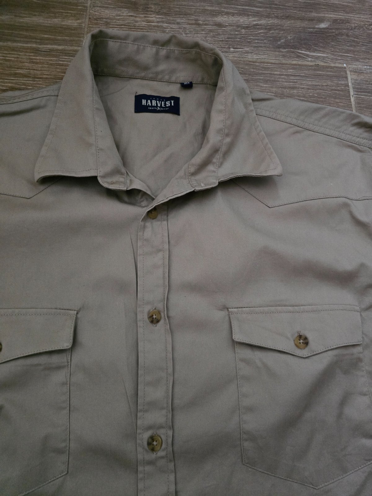 1x.oblečená,slim košela,farba nieco medzi hnedou a horčicovou..