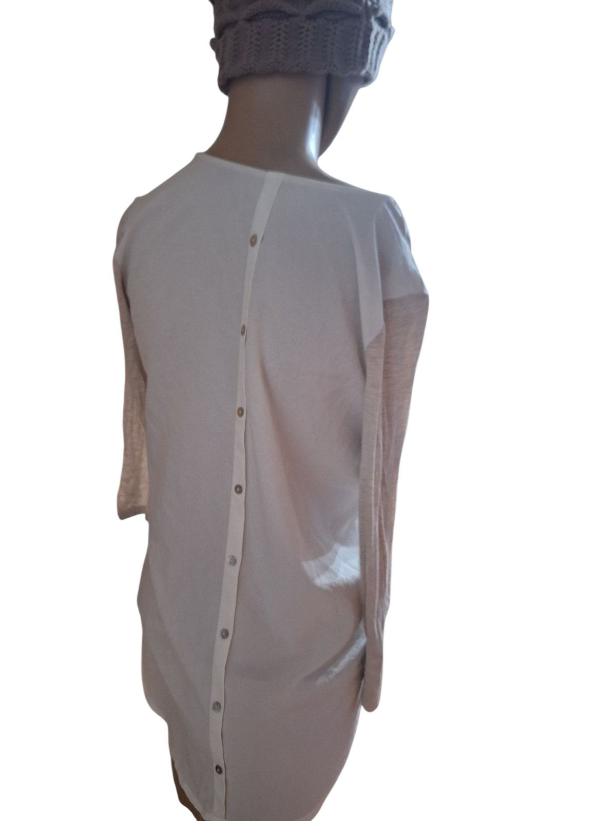 Ľahká elegantná blúzka s dlhým rukávom, ktorá sa dá vypnúť na 3/4 rukáv. Rozmery: dĺžka-60cm obvod pŕs-96cm obvod ramena-44cm dĺžka rukávu-58cm