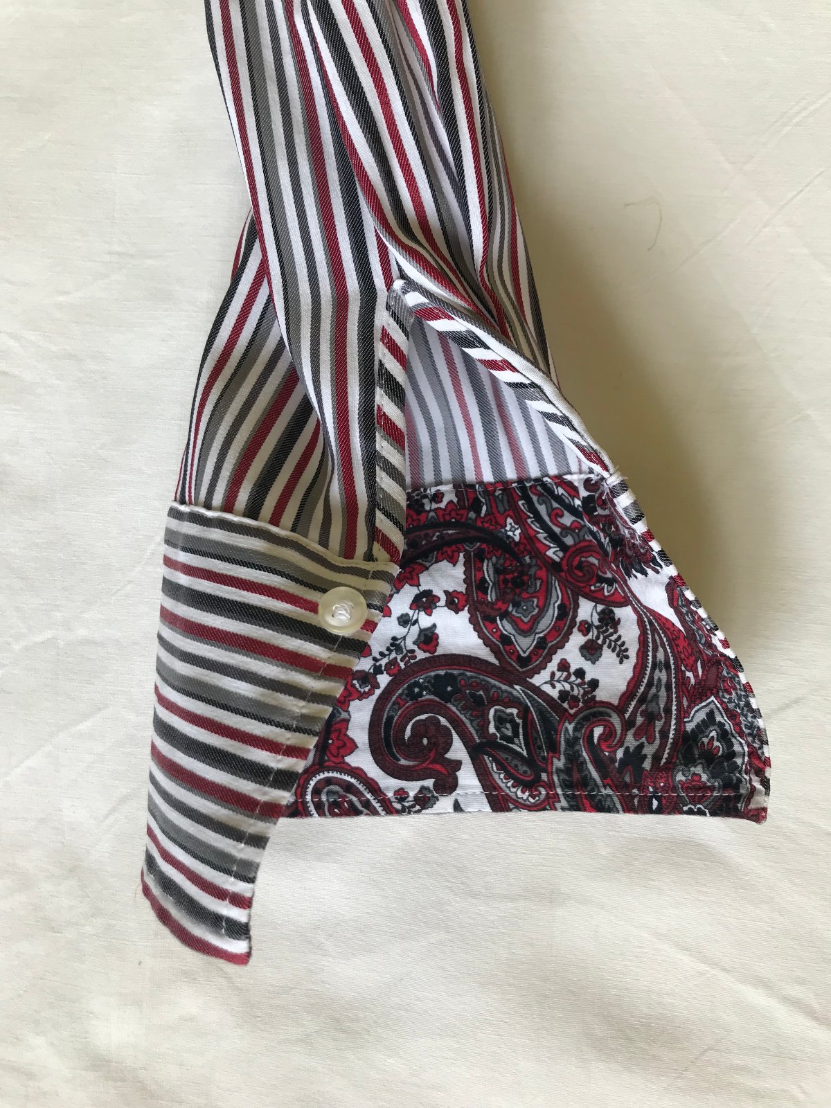Predám sivo-bielo-bordovú pásikavú košeľu, Gerry Weber, "38", vzor na vnútorných límcoch, zapínanie na gombíky, elastický materiál. Veľmi dobrý stav, málo nosená.