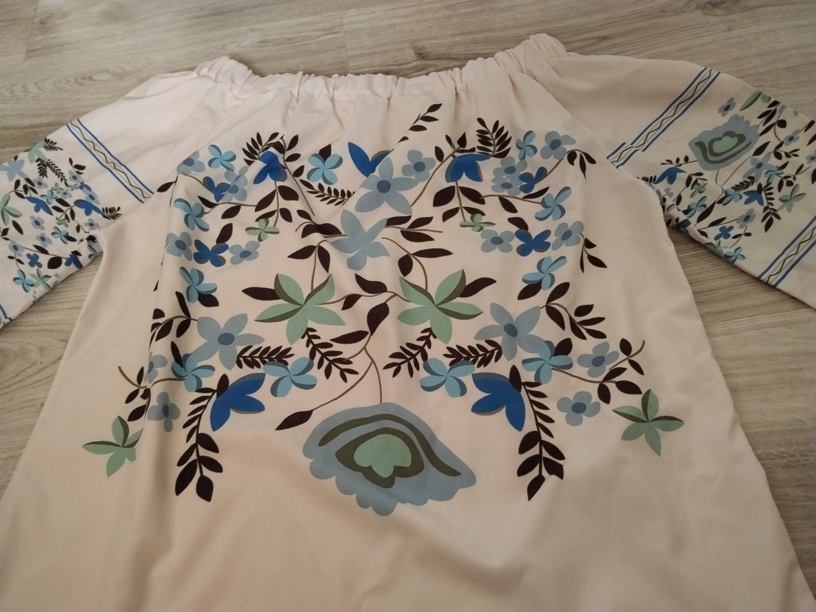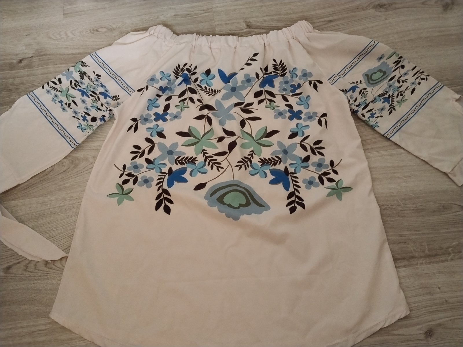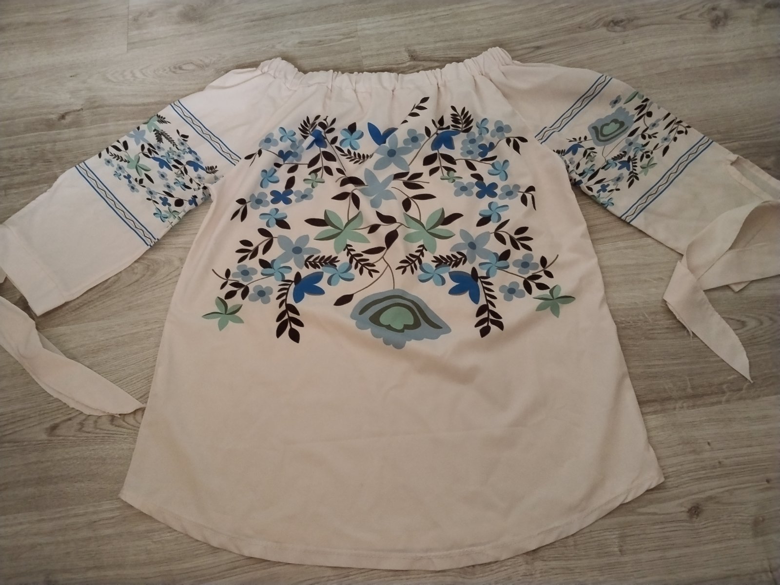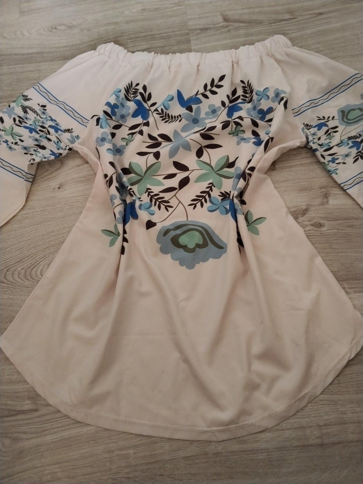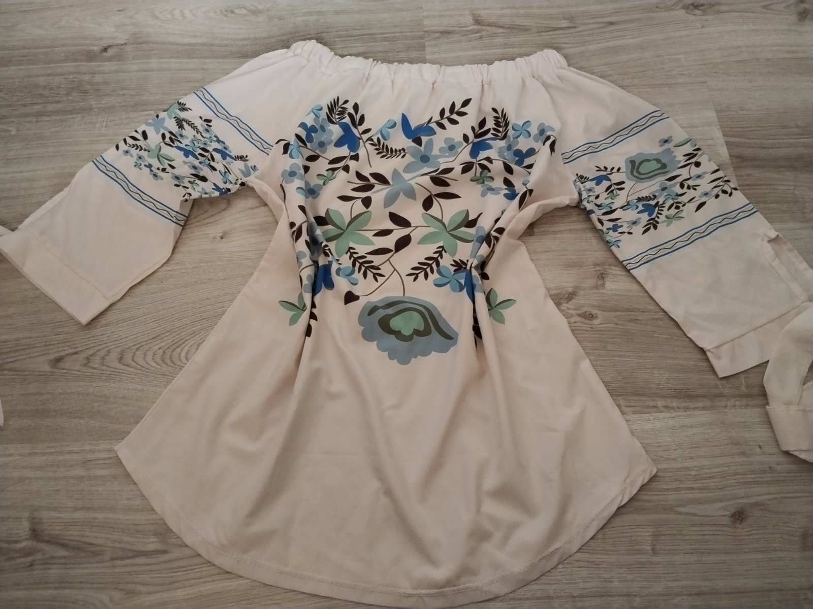 Blúzka jemnej púdrovej farby s krásnym vrozom, na rukávoch je viazanie, guma okolo výstrihu- dá sa nosiť na štýl Carmen, stiahnutá na ramená... Pri výmene 6€