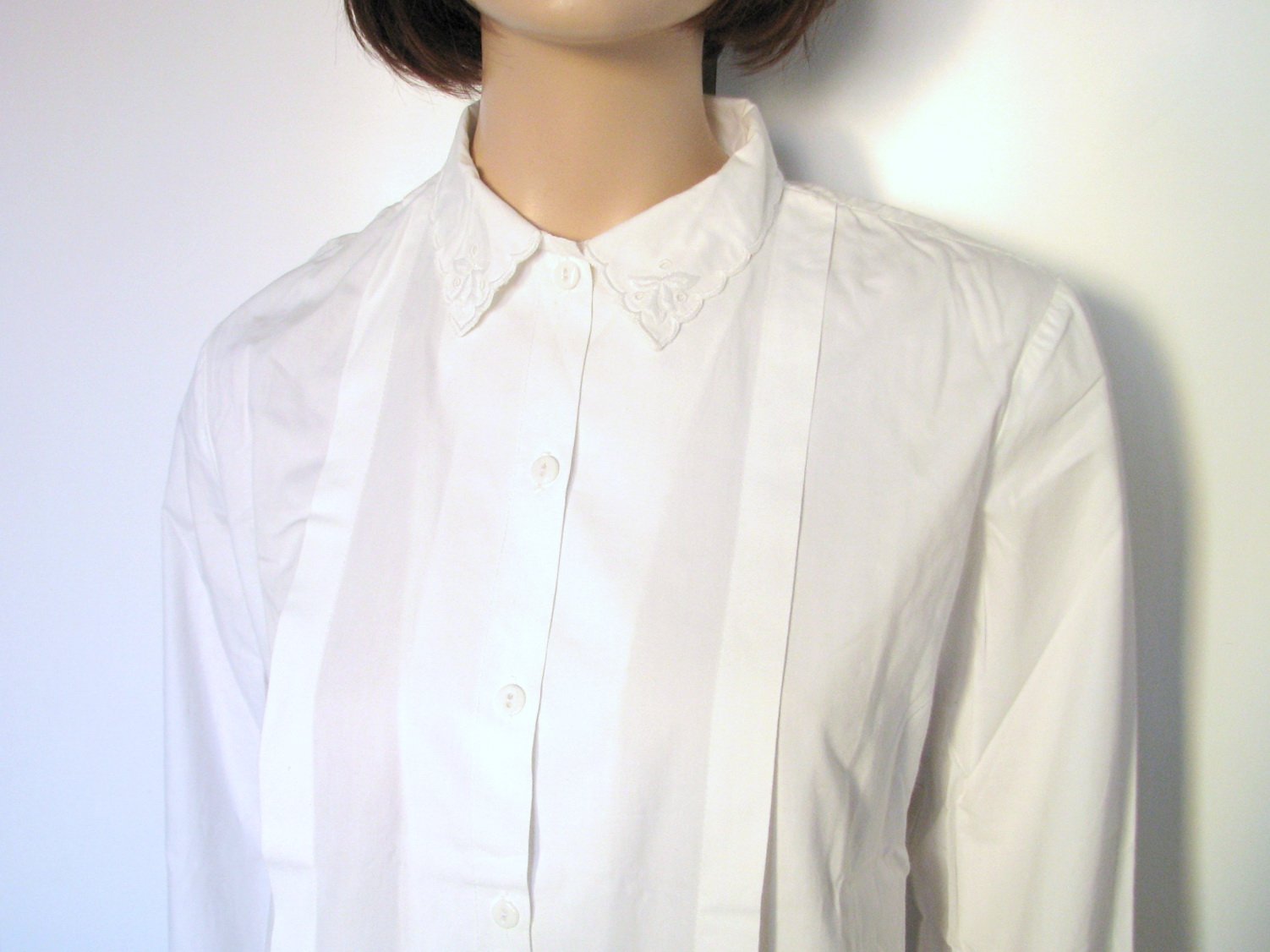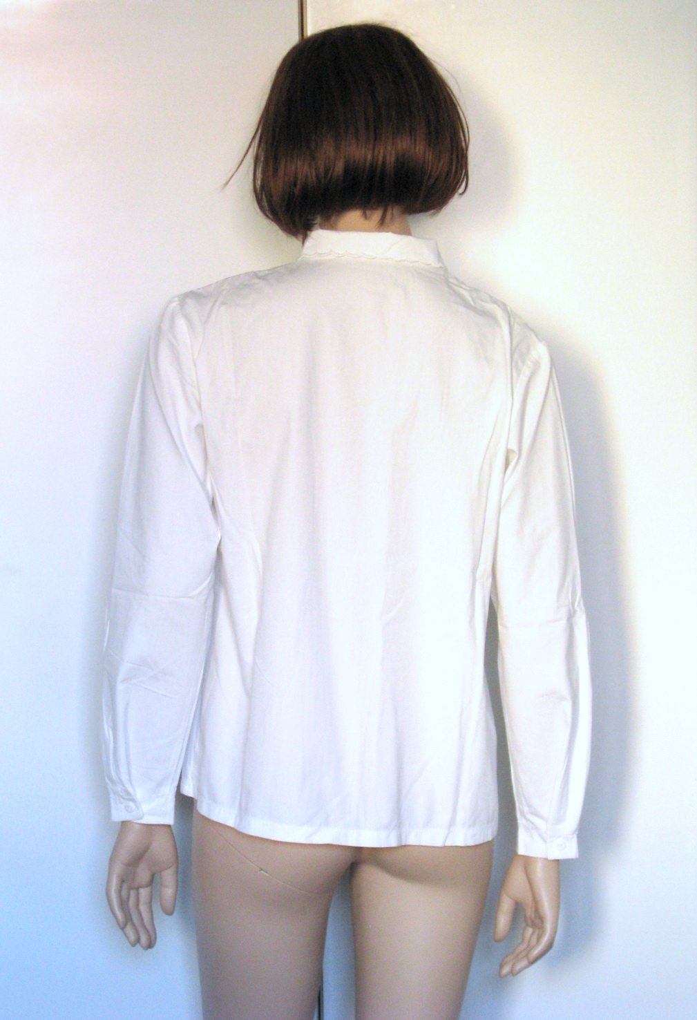 Vintage biela vyšívaná blúzka s dlhým rukávom. Má jednu mini modrú bodku ako od pera na rukáve a jednu čiernu bodku zboku na golieri; tie má trochu špinky pri hornom gombíku od toho, ako sa ta pripínala brošňa, viď. detailné fotky. Iné poškodenia nemá. Materiál je ako bavlna, no nie som si istá. Veľkosť odhadom M, možno sadne aj L, v prípade záujmu premeriam.