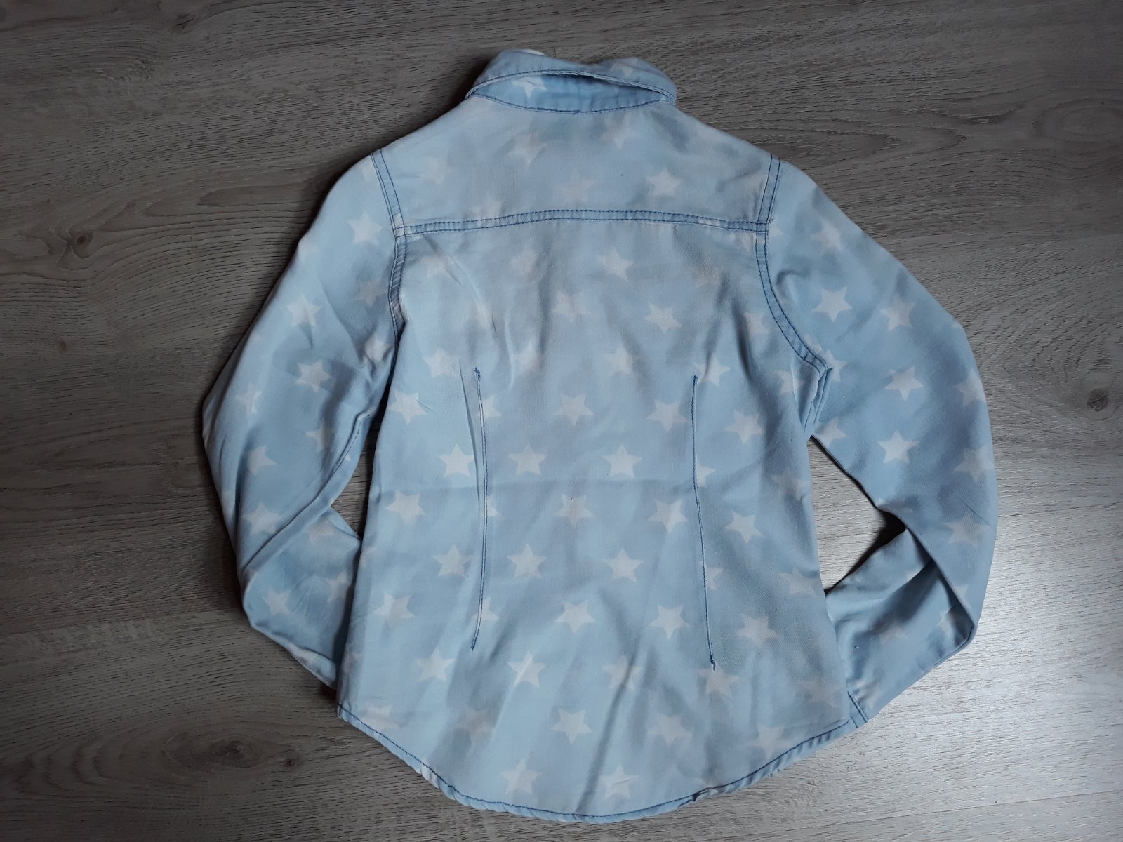 Predám dievčenskú košeľu v riflovom vzhľade veľkosť 134/140. Na jednom rukáve pod gombíkom chýba cvok /viď foto/.