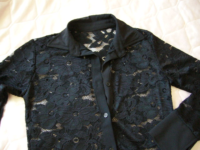 Cierne body z pruznej krajky, bez znamok nosenia. Zapinanie a golier ako na koseli. Sirka pod pazuchami 43x2. Dlzka rukava 58cm. Dlzka od pleca dole po zapinanie v rozkroku 70cm, este sa podda lebo vsetko je pruzne.