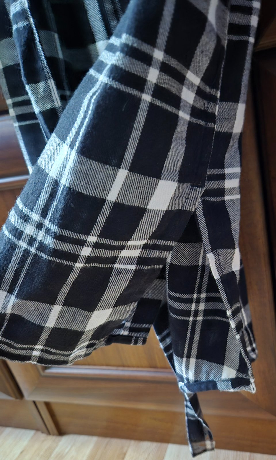 mäkký flanel z bavlny, na bokoch rozstrihy a našité vrecko hore, šnúrka na zaviazanie pre nastavenie šírky, 100% bavlna, top stav, dĺžka rukáva od ramena 62cm, šírka cez prsia 43x2cm pri zapnutom stave, celková dĺžka 90cm