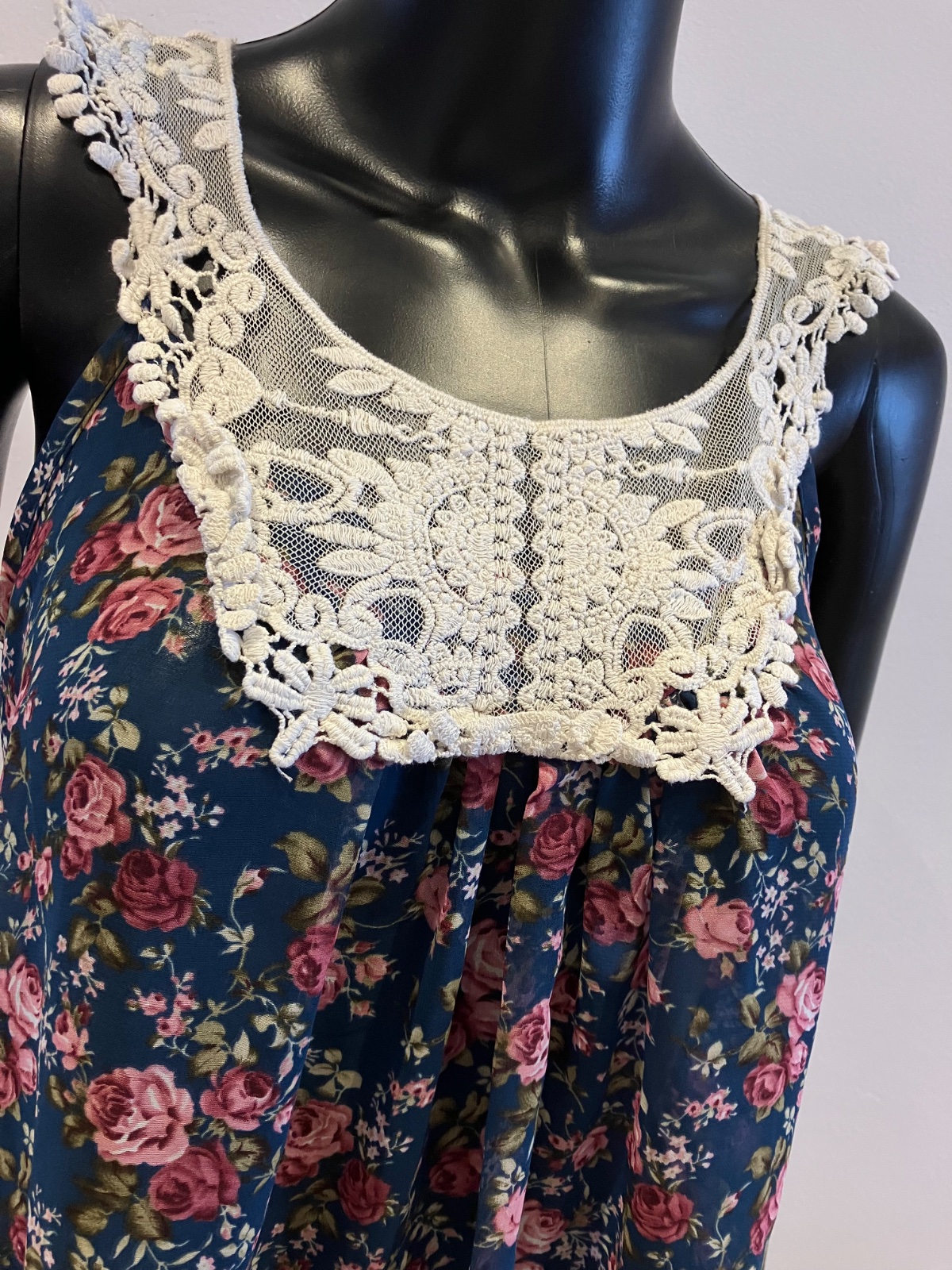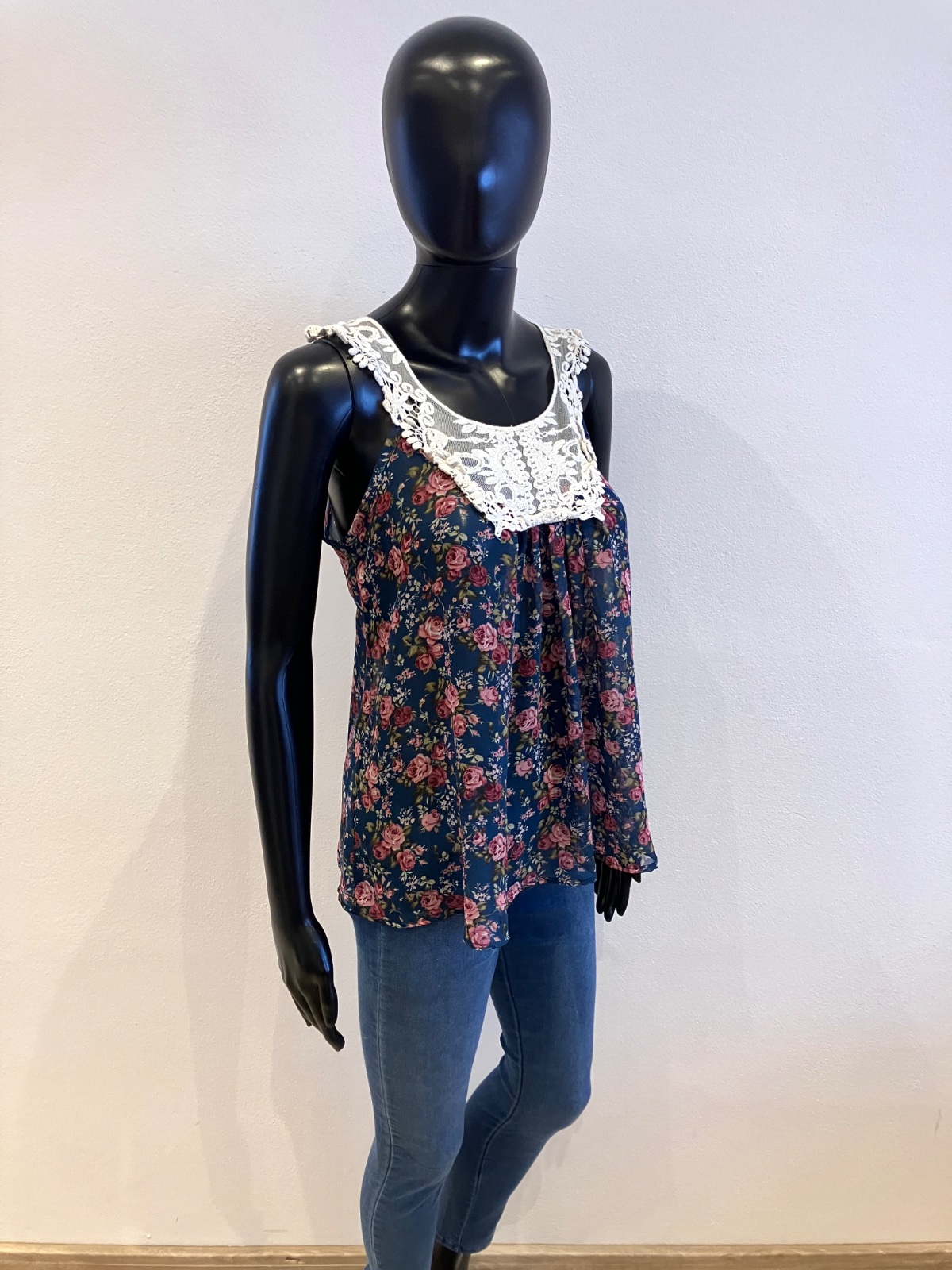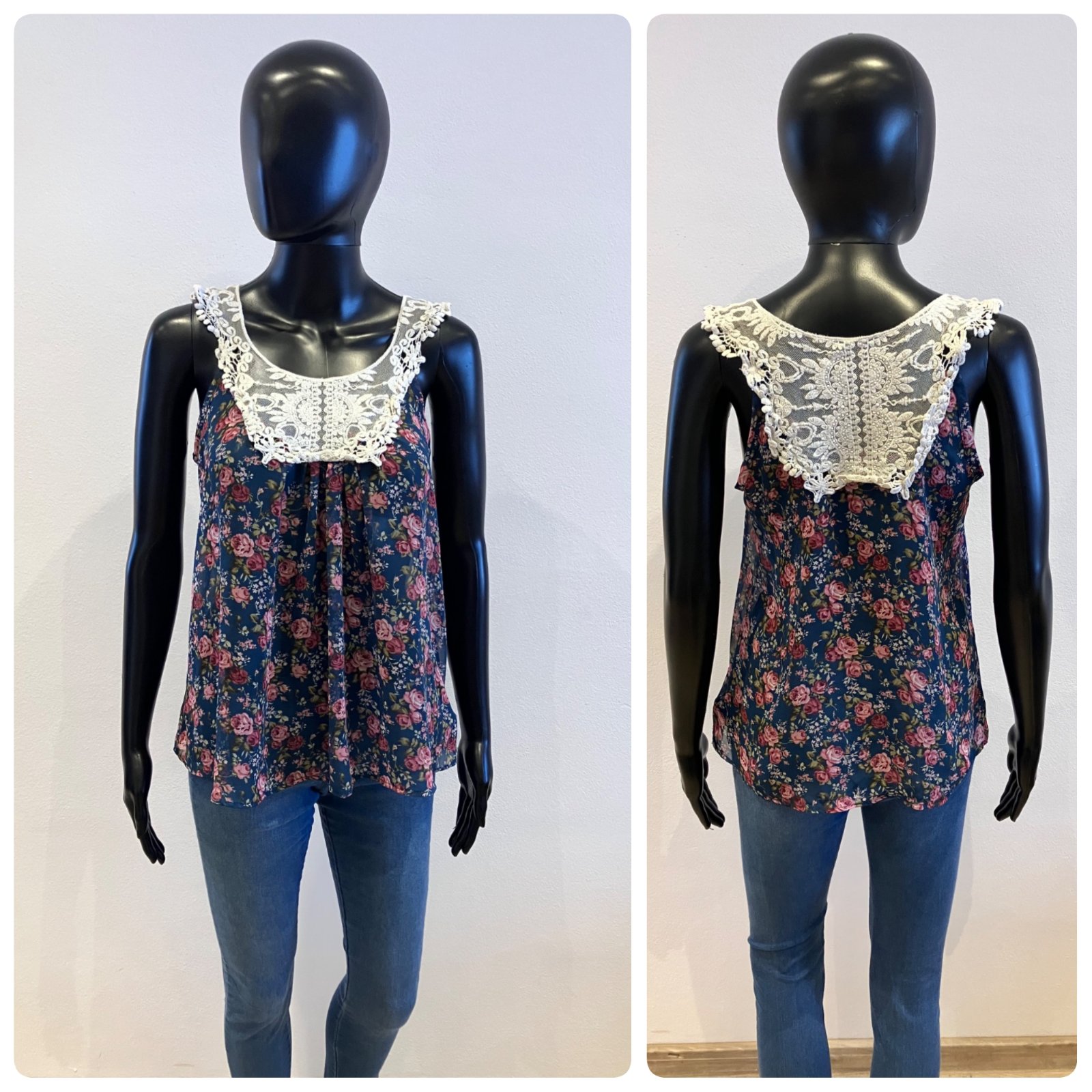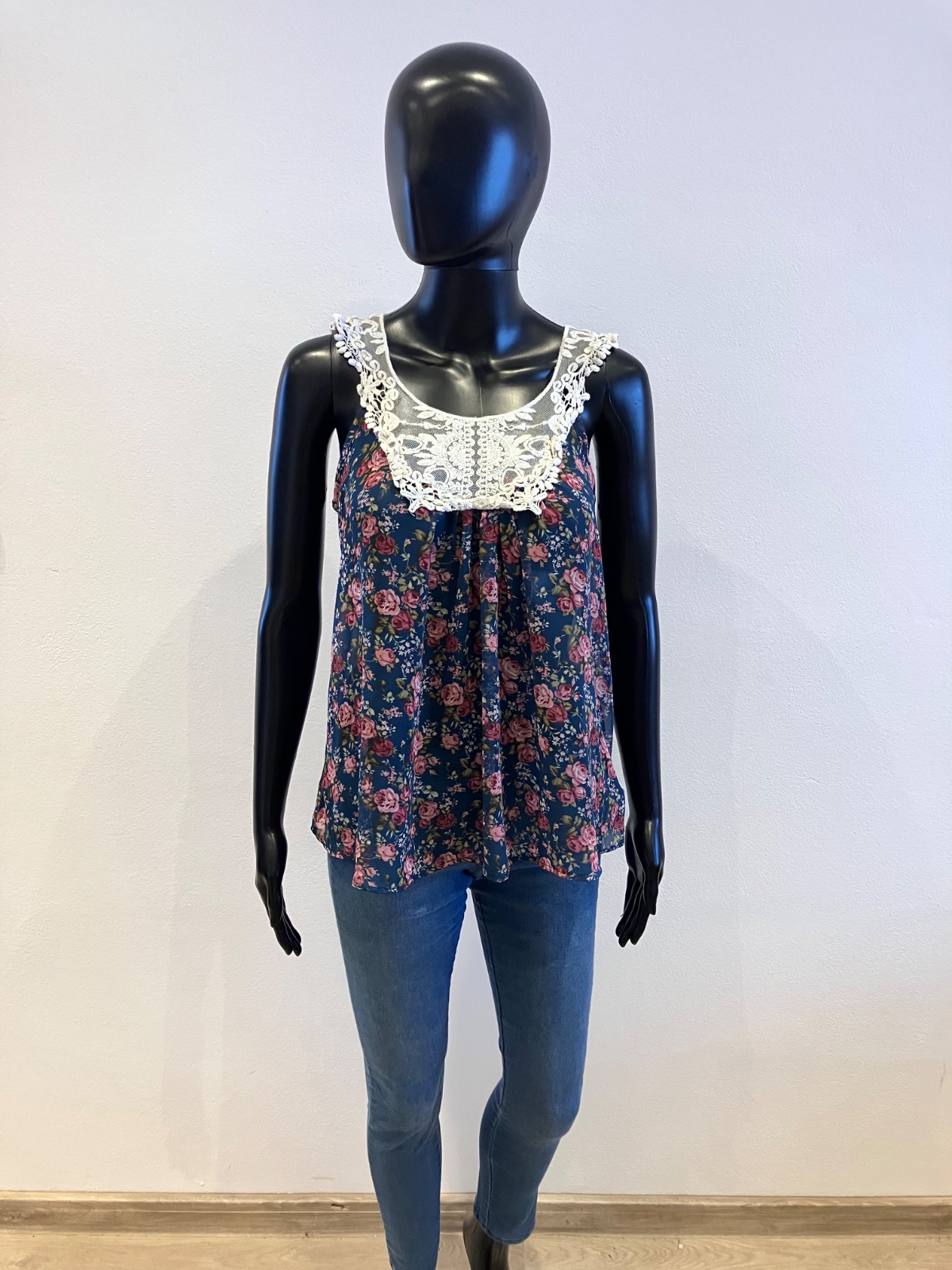Dámska kvetovaná blúzka s krajkou bez rukávov, nie je elastická, priesvitná, veľmi tenká, materiál 100%polyester.