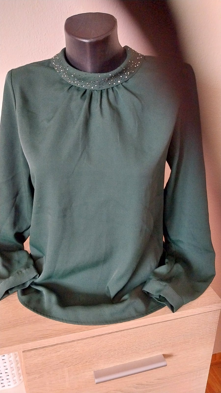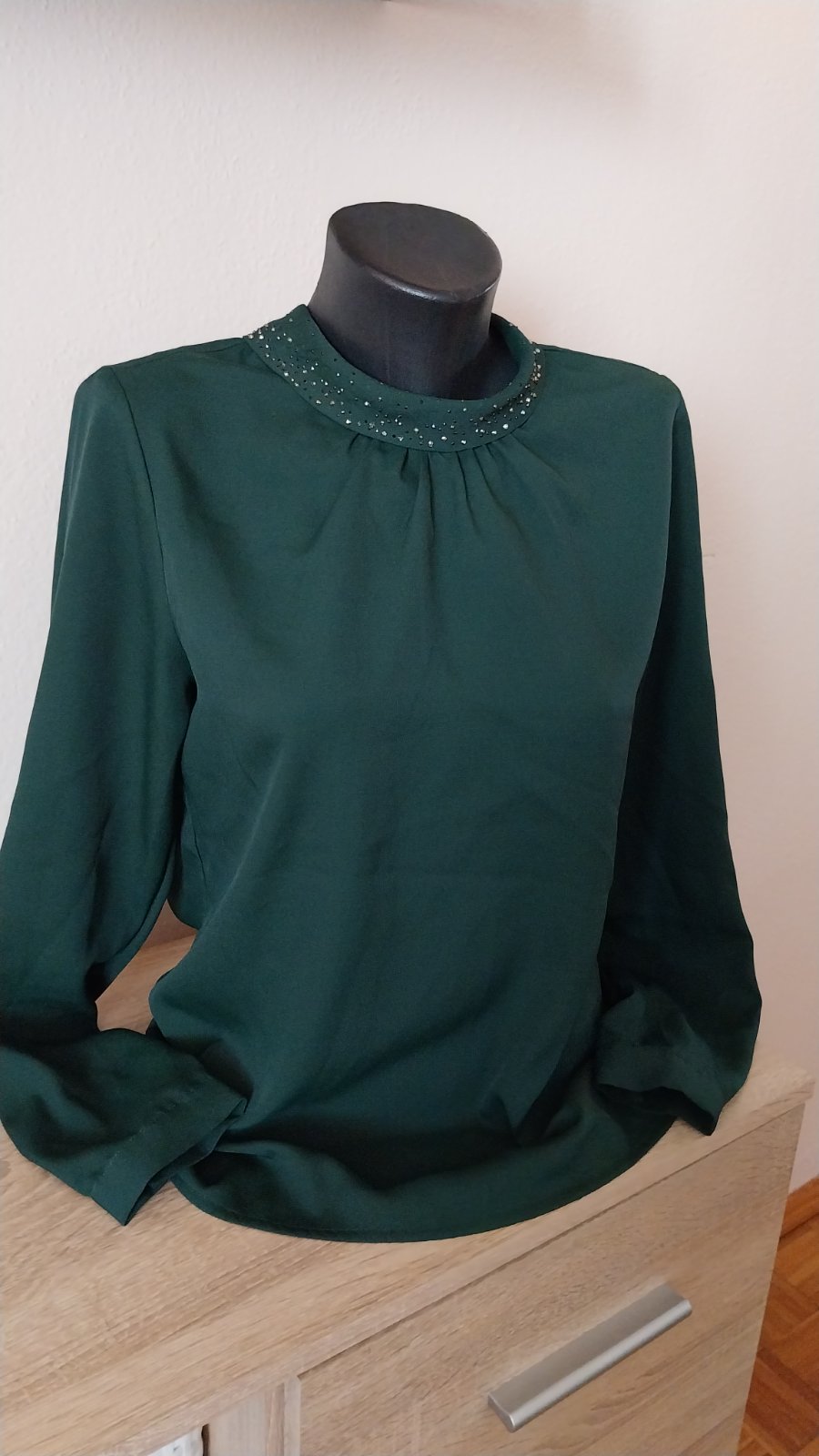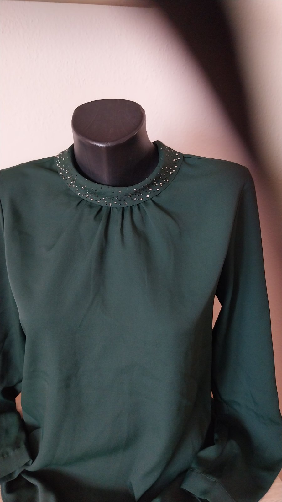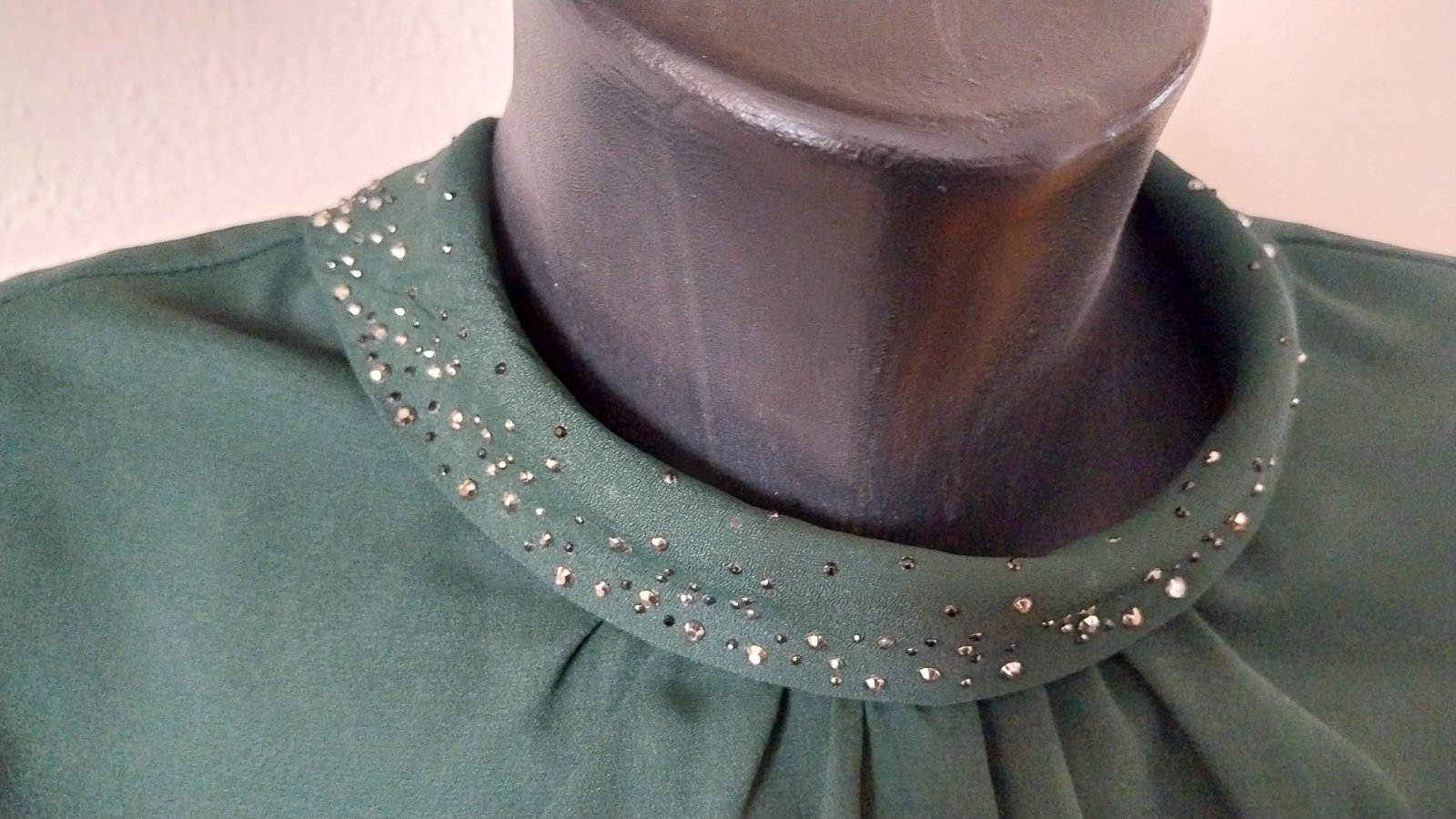 Smaragdovo zelený top s flitrami okolo krku. Je krásny sýto smaroagdovo zelený. Na fotografii je to zle osvetlené, ale je farba je sýty, nevyblednutá.