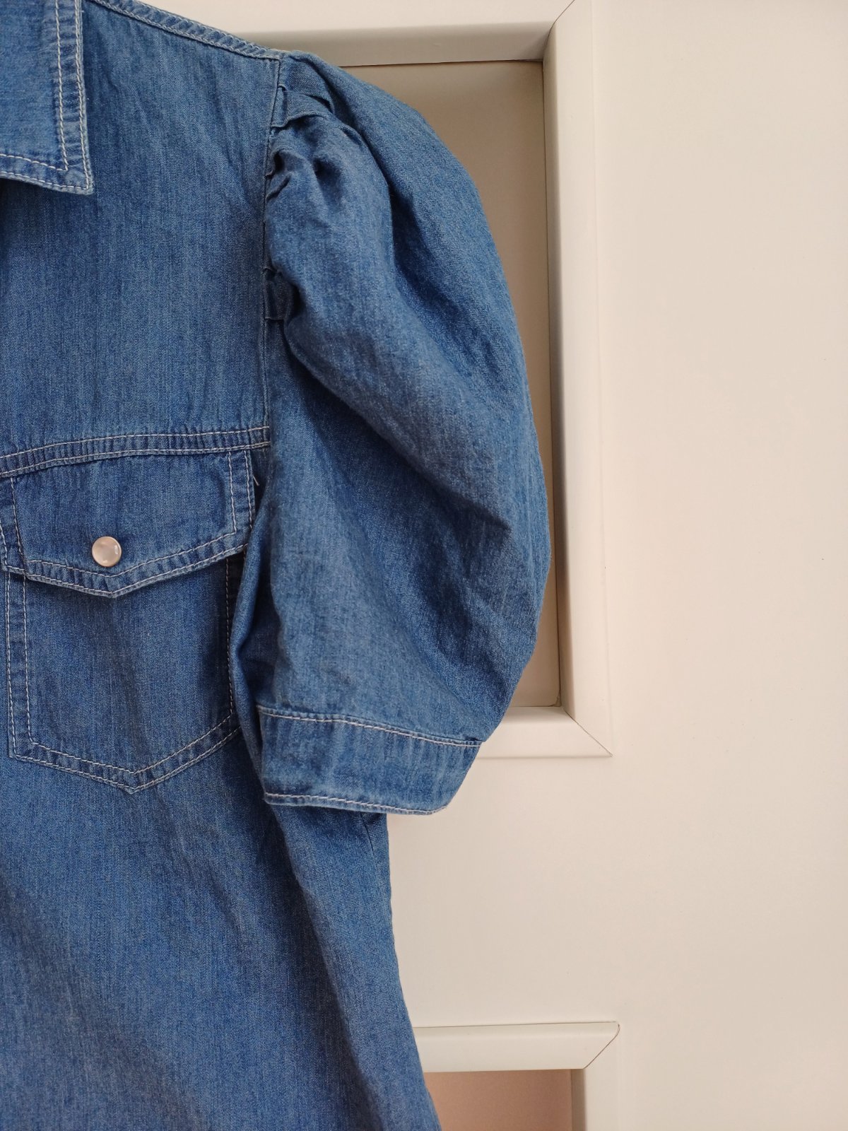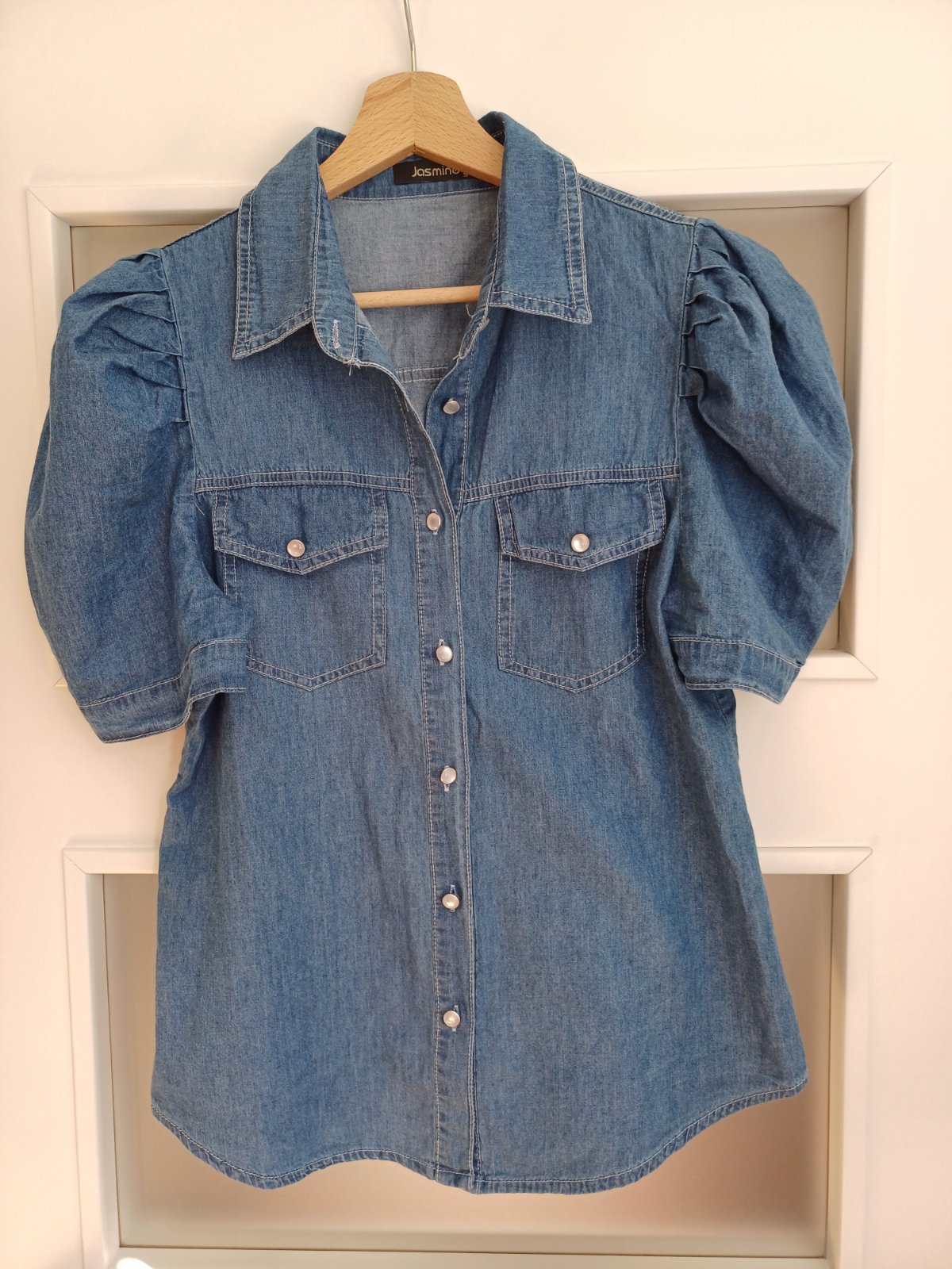 Nová rifĺová blúzka s krátkym rukávom veľkosti S s balónovými rukávmi.