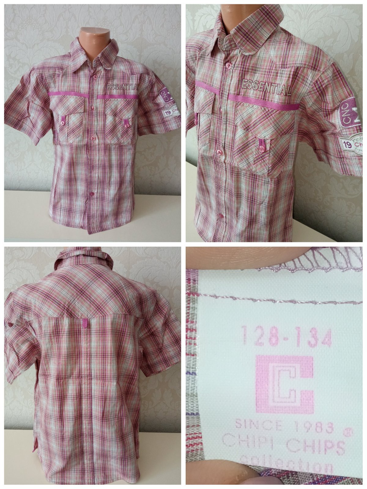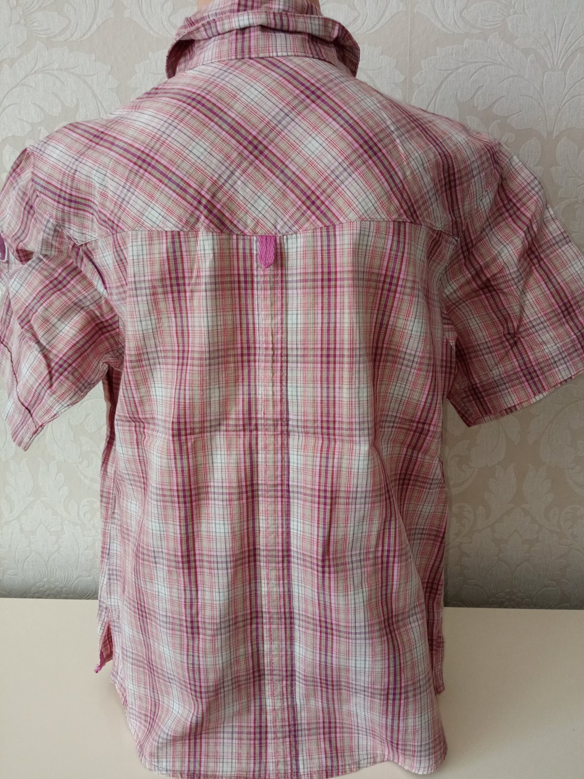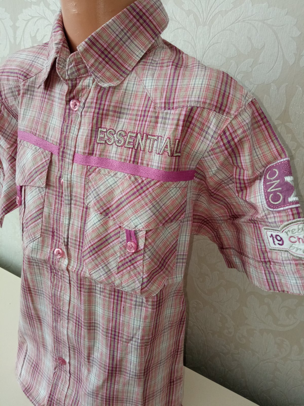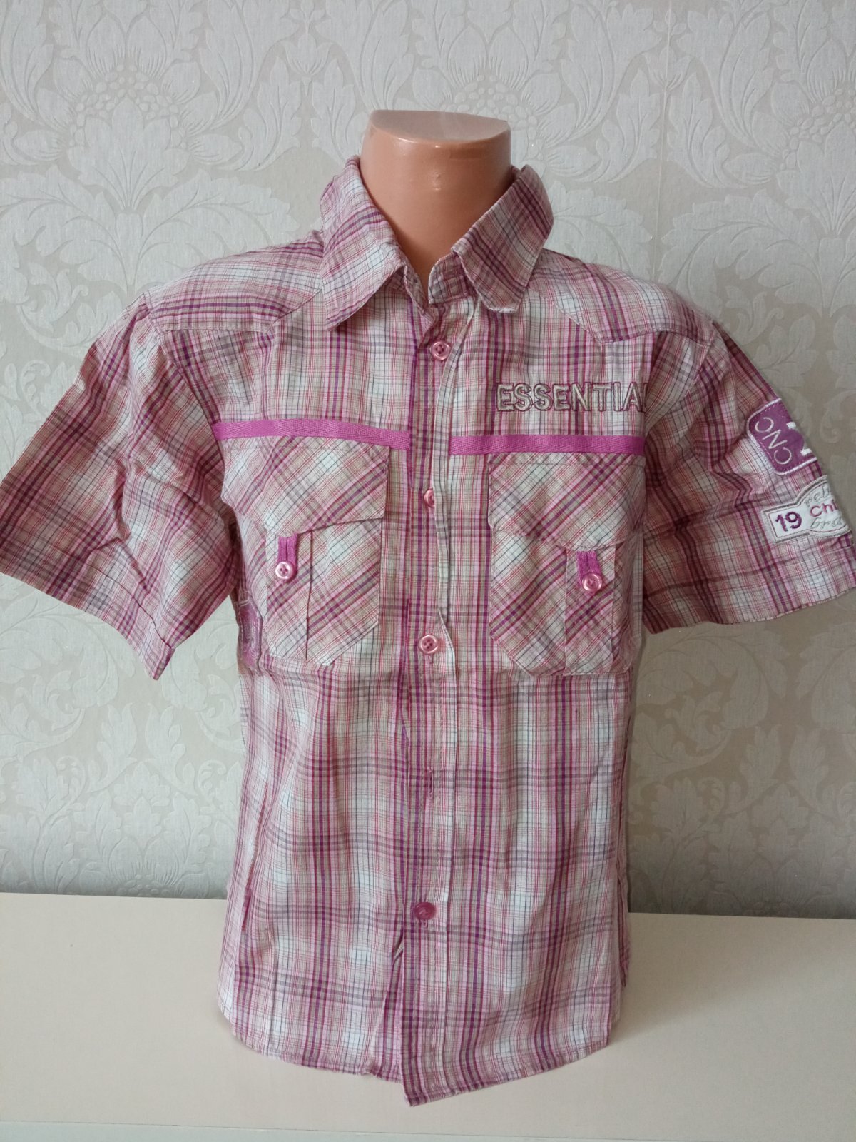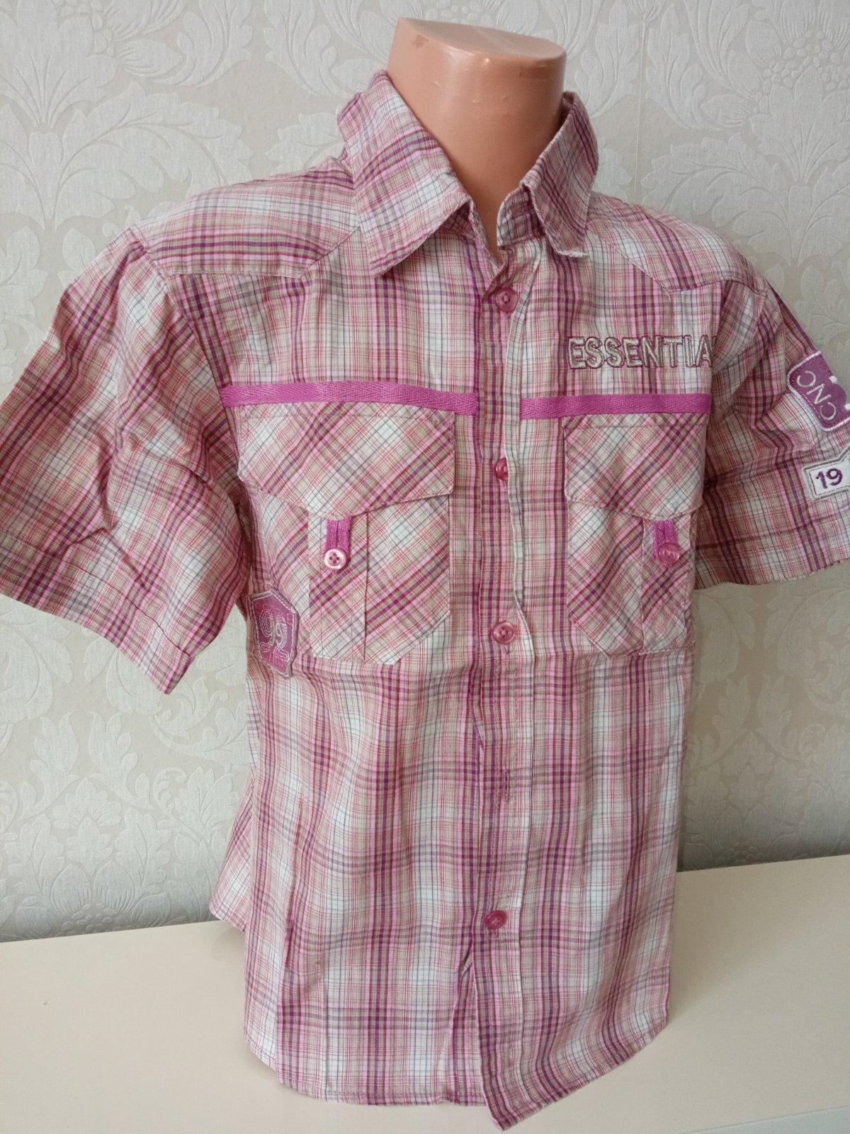 Chlapčenská košeľa s krátkym rukávom. Zapínanie na gombíky. Veľkosť:128-134. Nie je elastická. Materiál:100%bavlna. Farba ružovo-fialovo-biela .