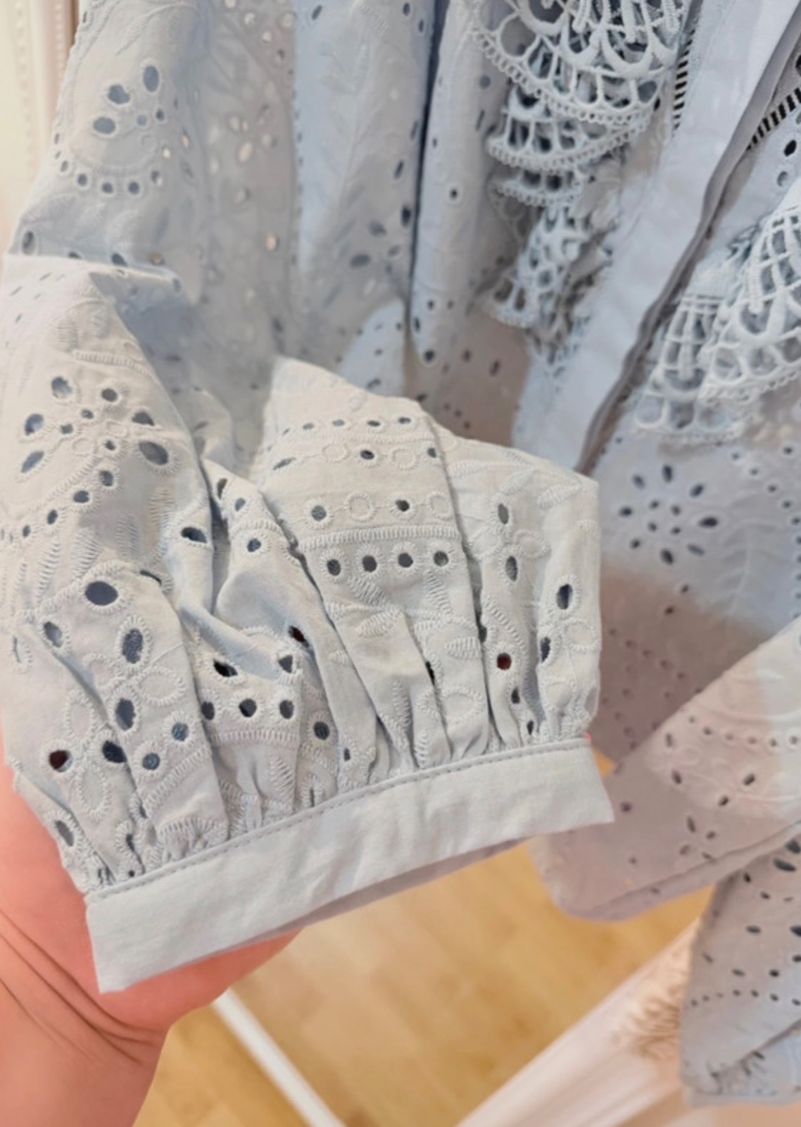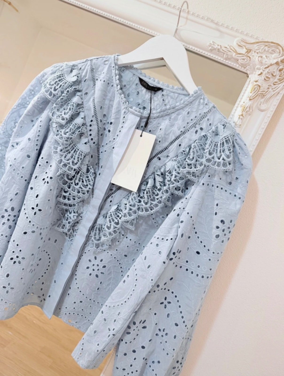 Luxusná madeirová blúzka značky ZARA v nádhernom jemne modrom odtieni s bohato zdobenou čipkou a romantickými volánmi.