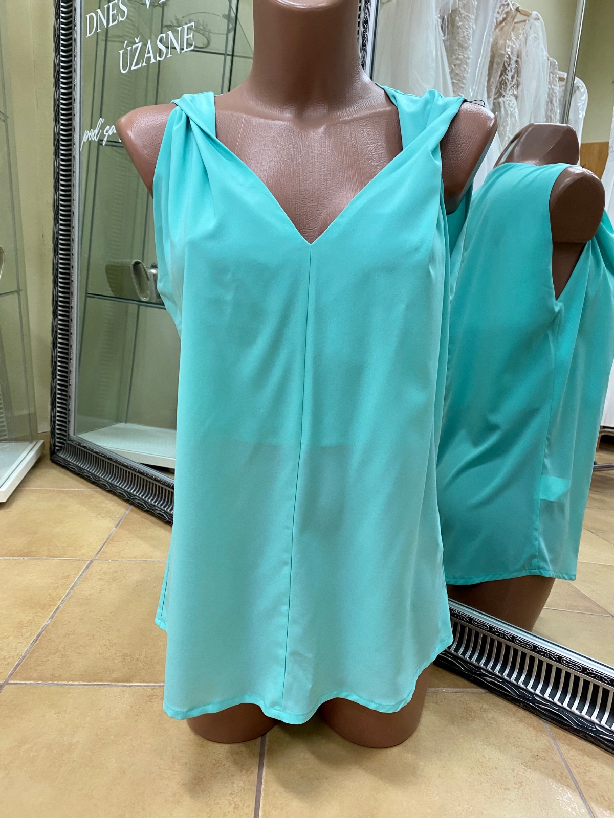 Dámska voľná mätová blúzka s véčkovým výstrihom a prekríženými ramienkami. Ľahký materiál, pohodlná a štýlová – ideálna na leto aj bežné nosenie.