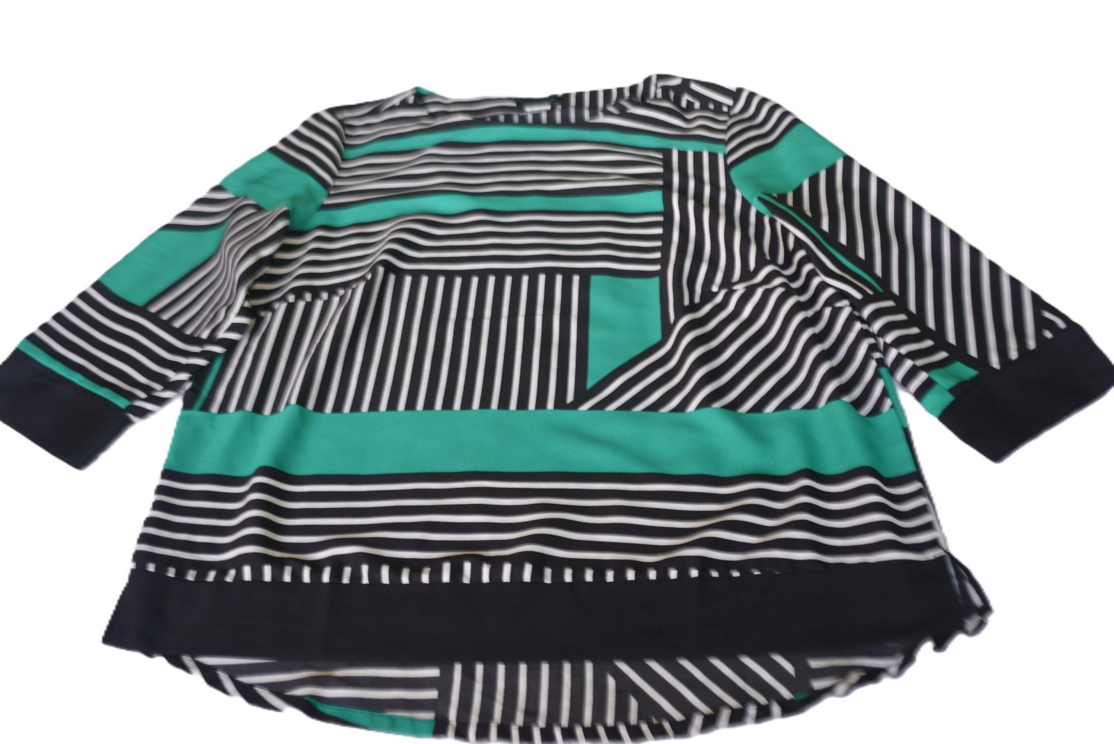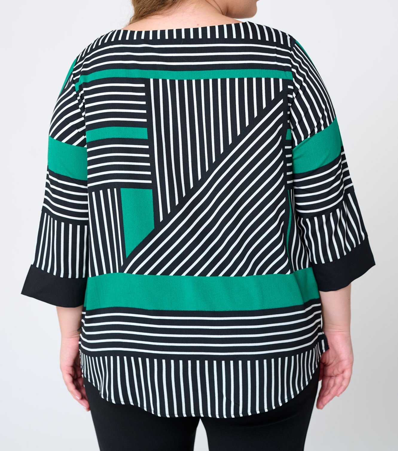 Blúzka s čiernobielym geometrickým vzorom a zelenými detailmi.