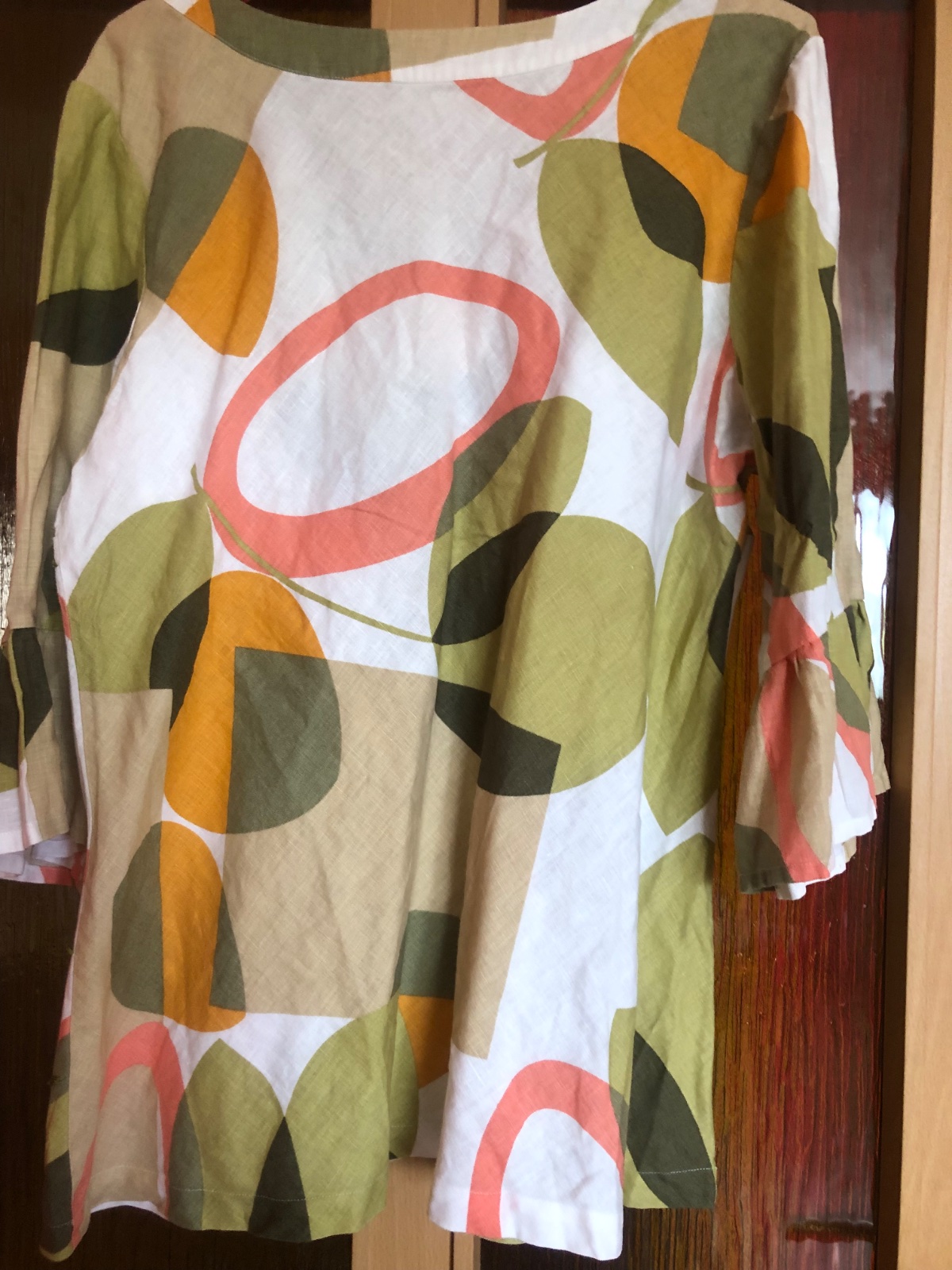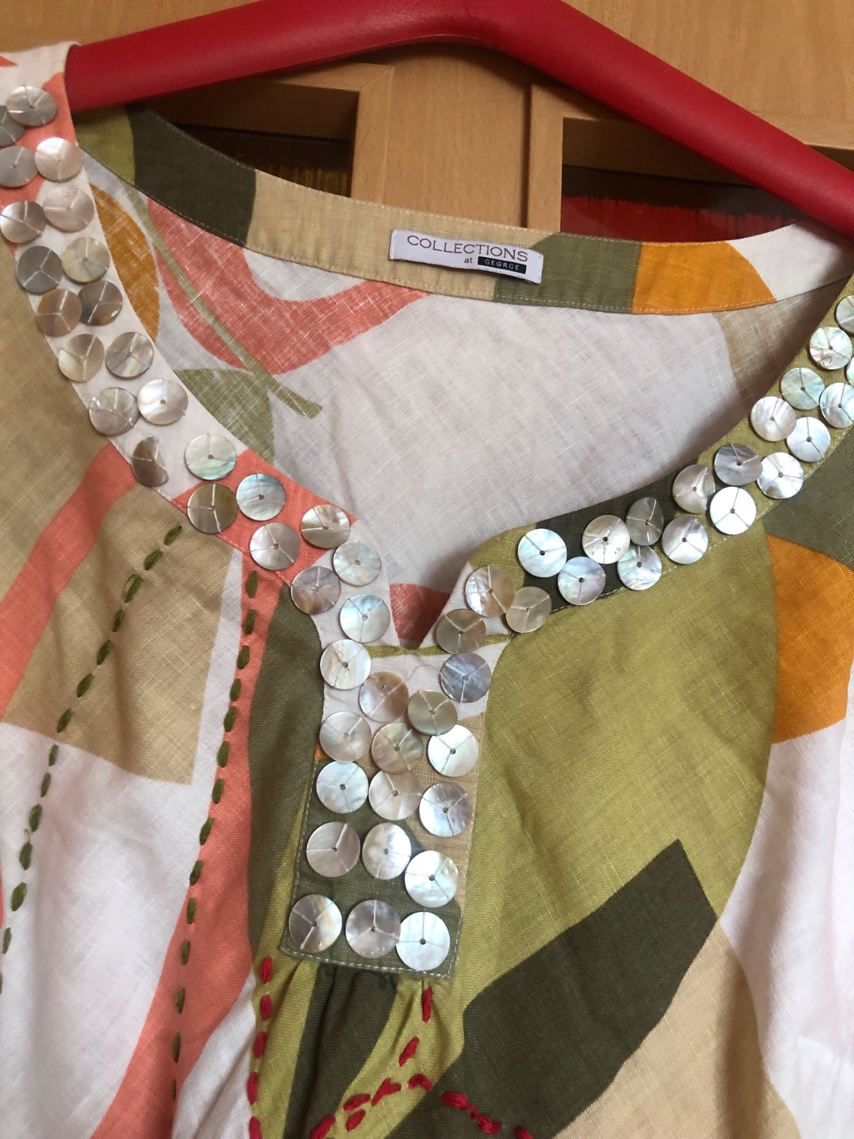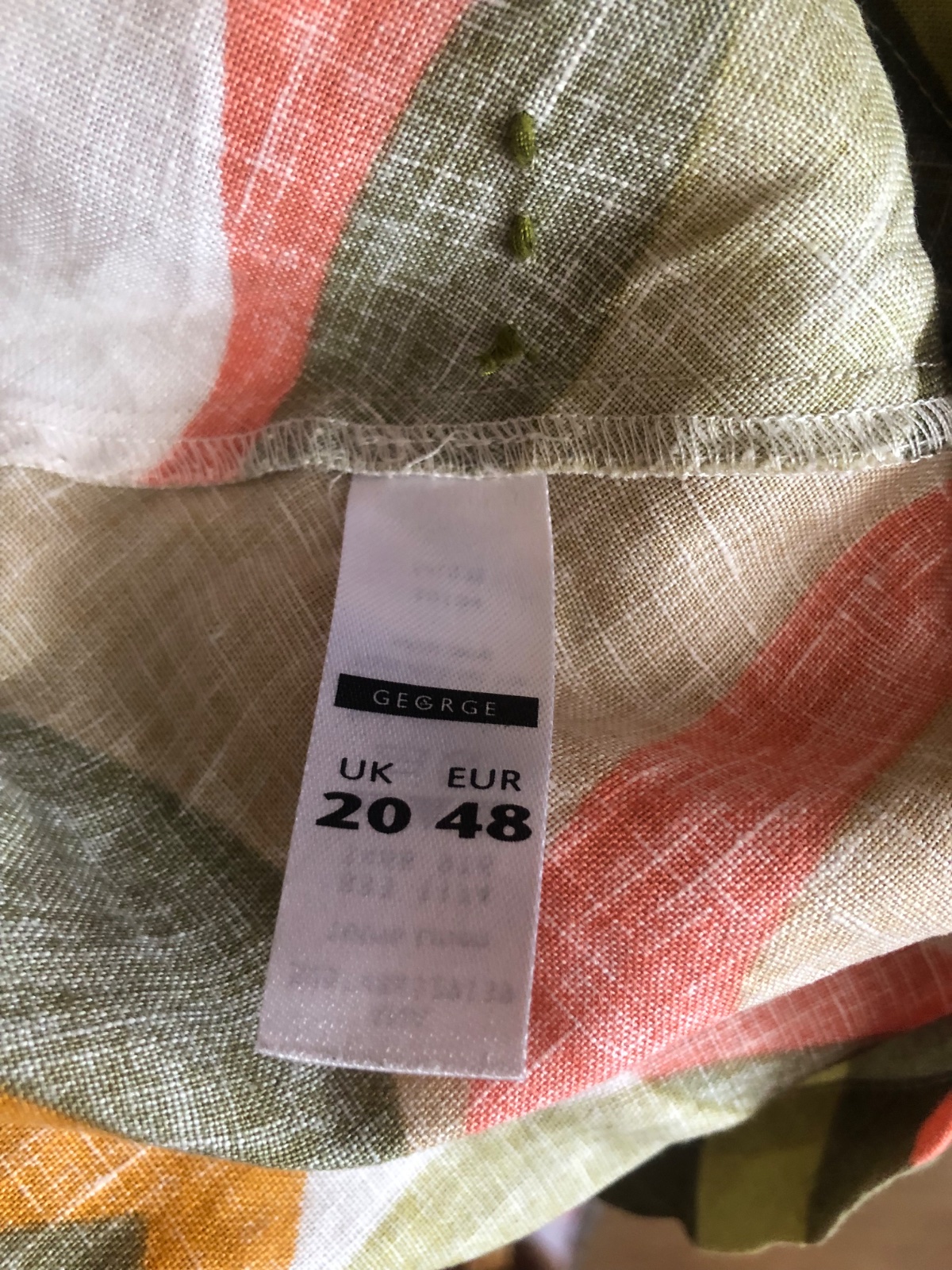Min. nosená, bez poškodení. velkost UK 20 EU 48, dlzka vpredu: 64cm, vzadu: 66cm, sirka pod pazuchami: 2x61,5cm, pas: 2x53,5cm, dole: 2x59cm, rukáv je 3/4, od limca: 61cm, od ramena: 46,7cm rukáv ...
