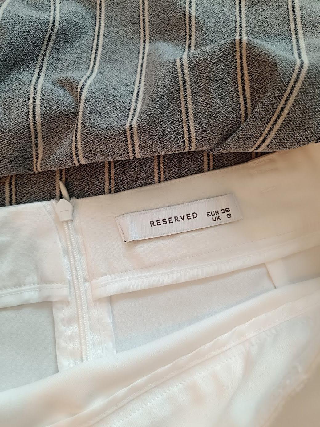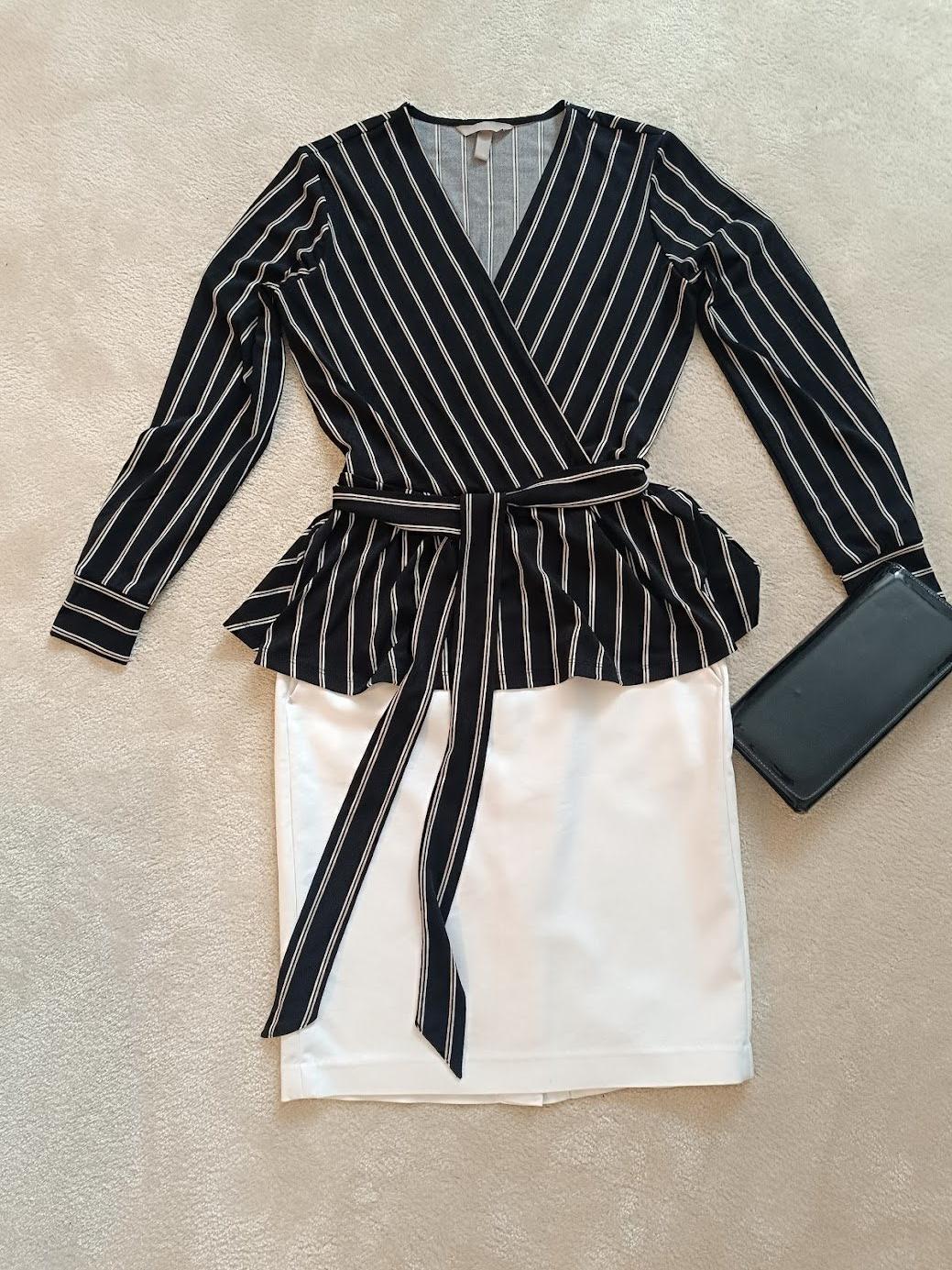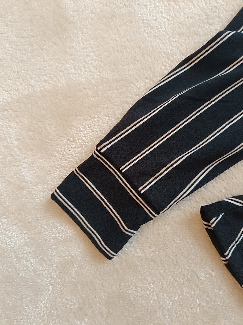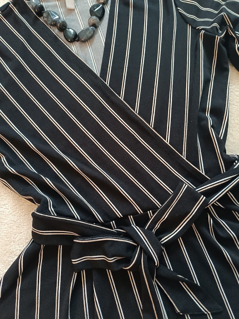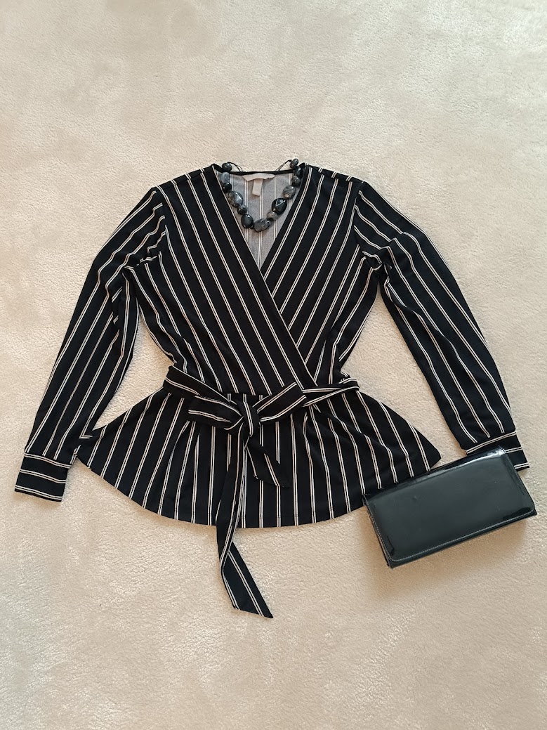 Krásna zavinovacia blúzka so zvýrazneným pásom – veľmi lichotivý strih. Jemné biele pásiky predlžujú postavu. Materiál je príjemný, mäkký a poddajný. Súčasťou je látkový opasok na zaviazanie. Vhodná na bežné nosenie aj na elegantnejšie príležitosti. Minimálne nosená, vo výbornom stave. ak by bol zaujem pridam aj suknu Reserverd 36. spolu cena 6 eur,