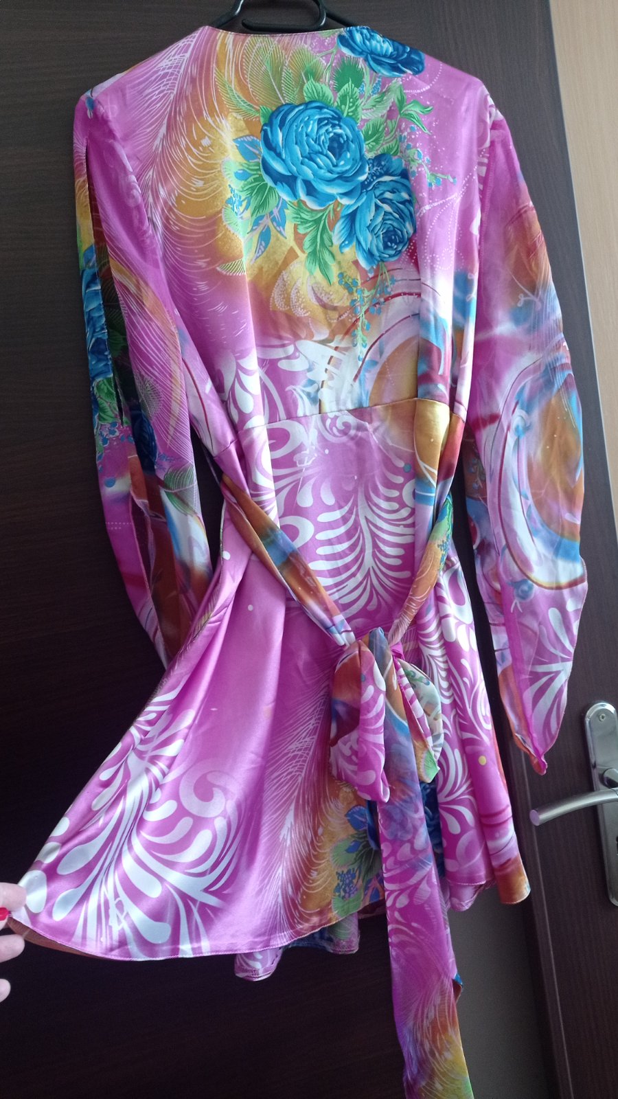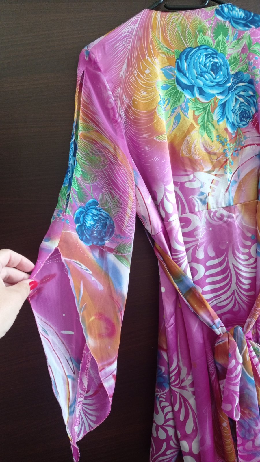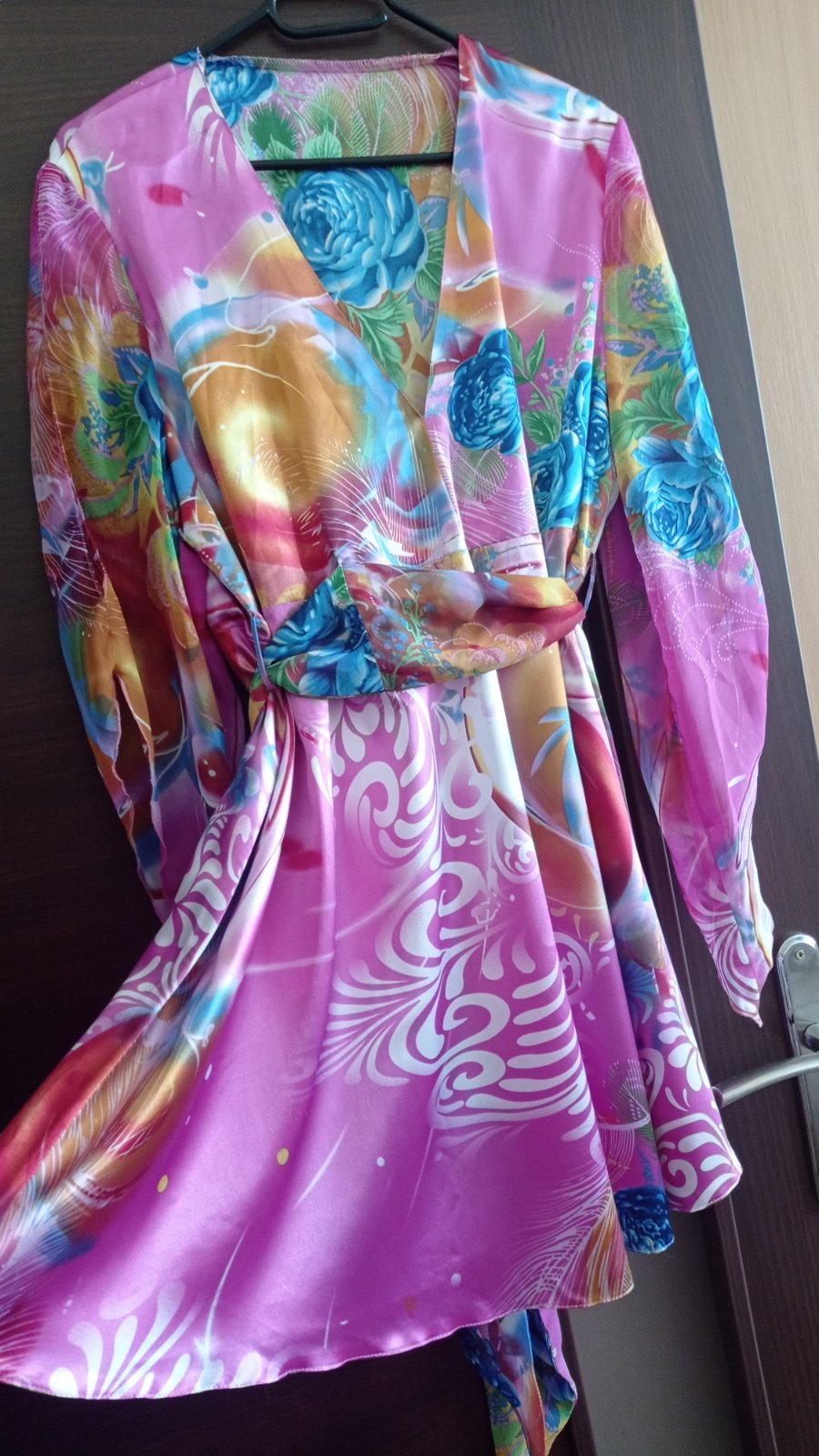 Tunika je z luxusnej satenovej látky, výstrih do V, rukávy majú jedinečný strih a sú zo šifónu toho istého vzoru ako saténová látka, pod prsiami stuha na zaviazanie vzadu na chrbáte, tiež zo šifónu, top stav, bez poškodení