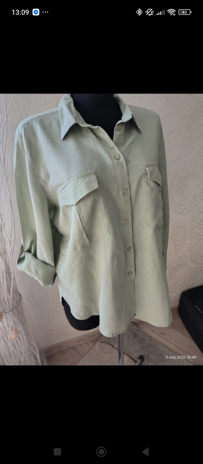 Veľmi pekný nosený stav. Veľkosť udáva 42, ale je veľmi široká, sadne skôr XXL. Farba: mätová, skoro do modra.