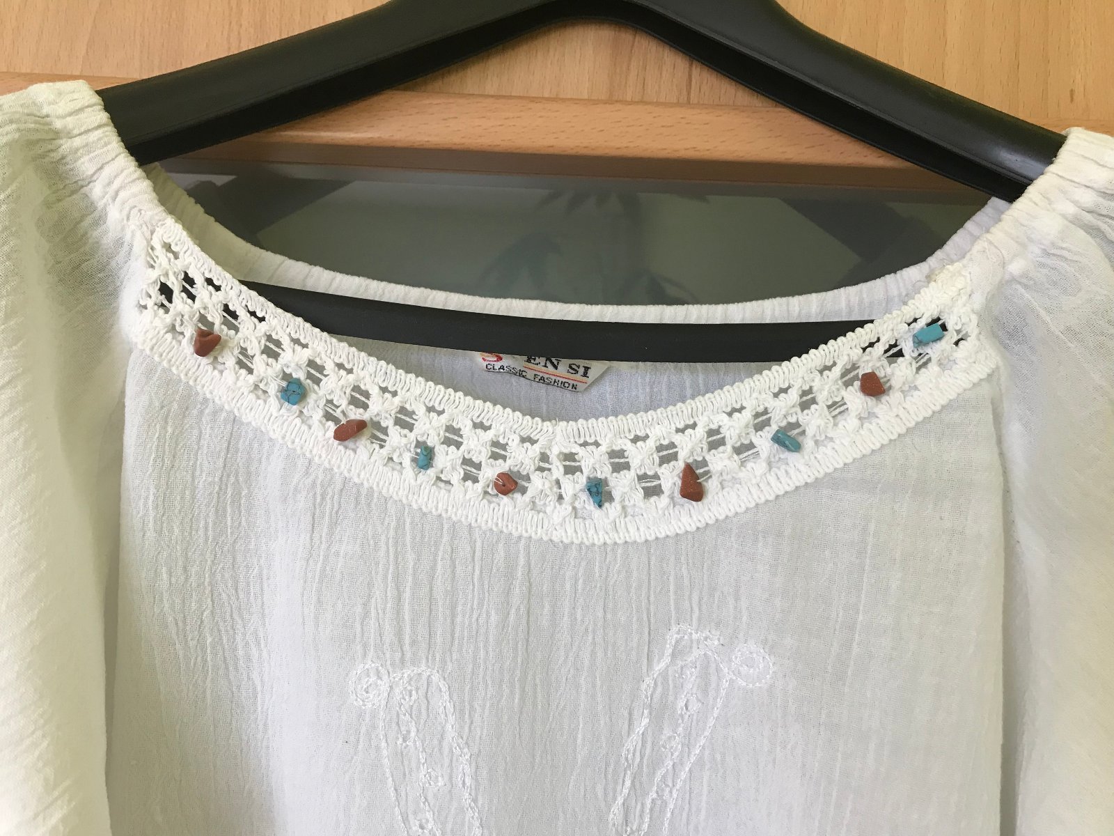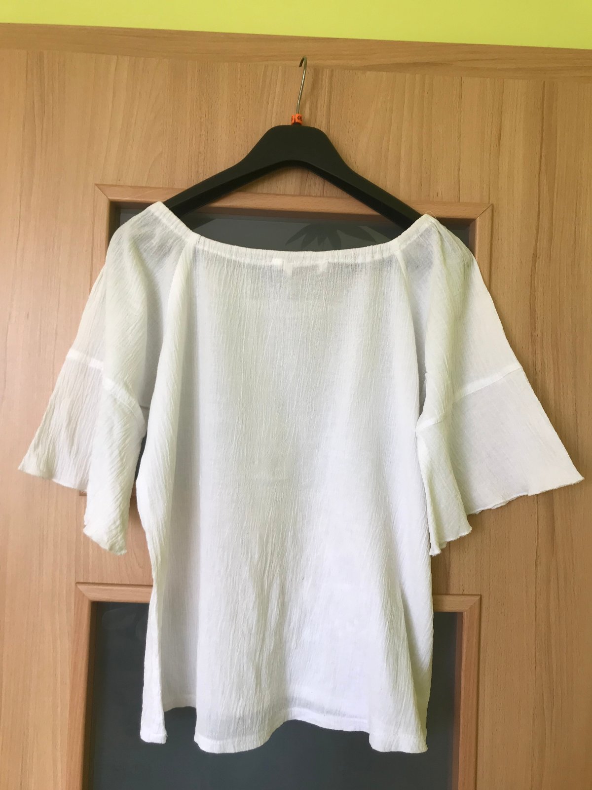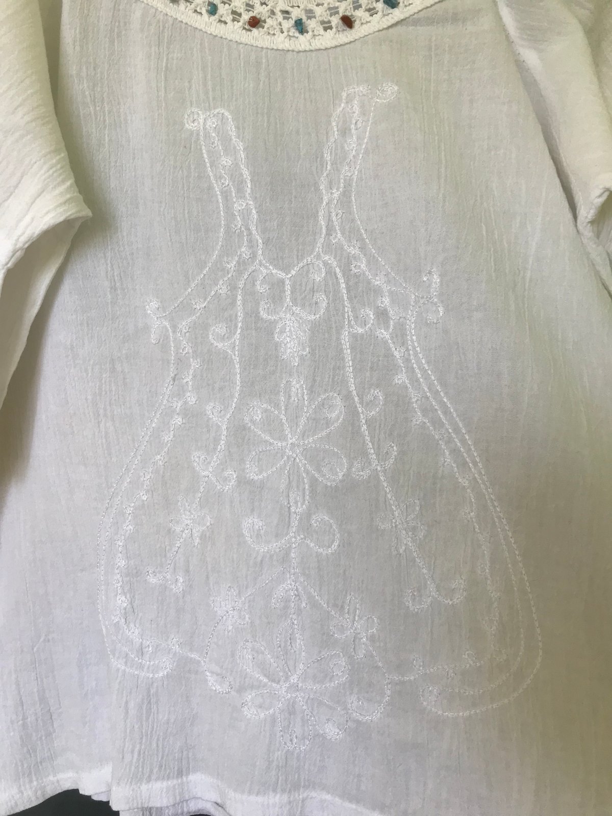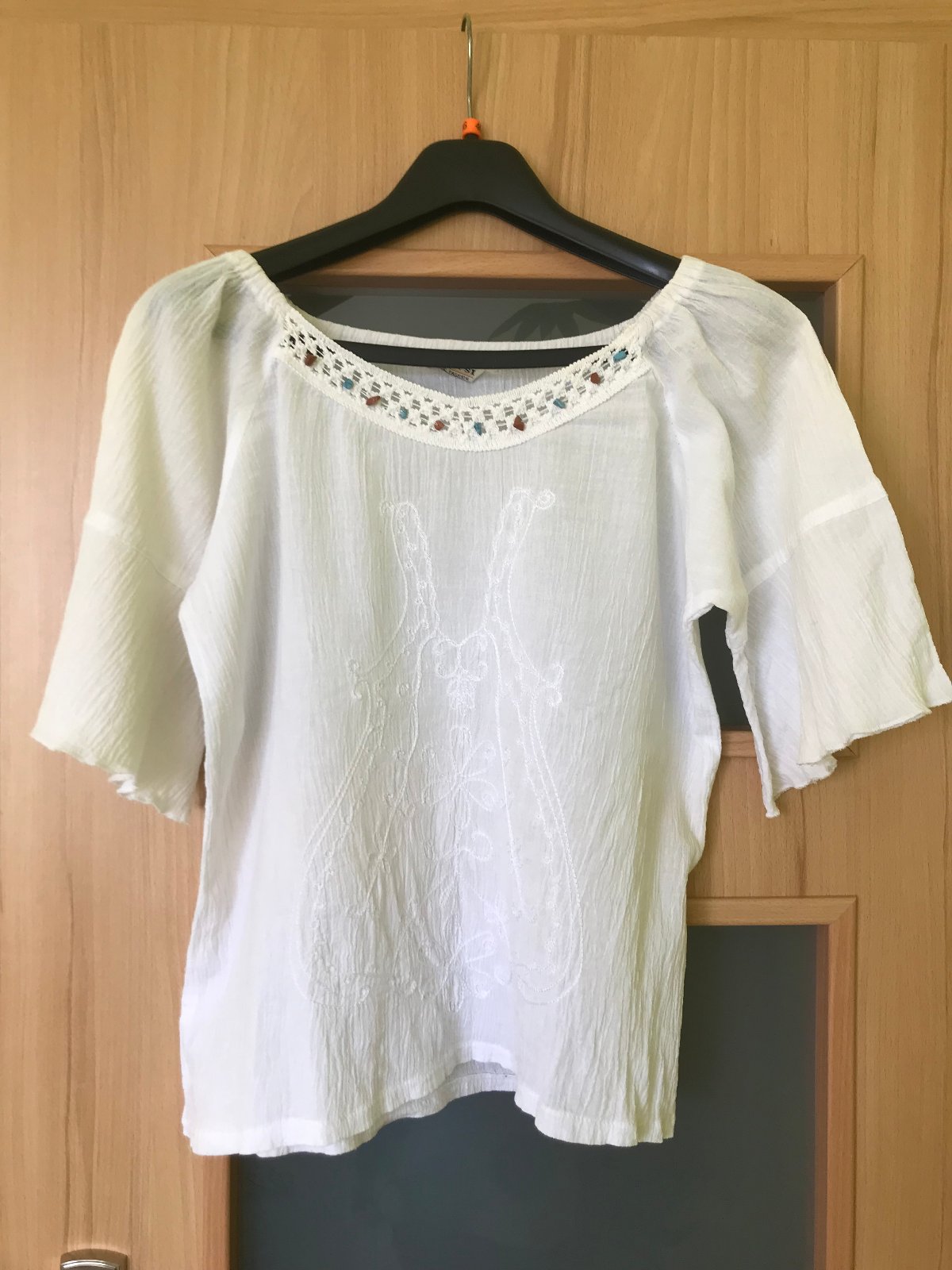 Biela široká viskózová blúzka, 3/4 široký rukáv do tvaru "A", veľkosť "M"; vpredu je biela výšivka, límec vpredu okolo krku má dekor čipky s kamienkami; vzdušná. Po opratí nie je potrebné žehliť. Nosená, dobrý stav. Rozmery: dĺžka chrbát: 51 cm, výstrih cca 10 cm, dĺžka rukáva: 34 cm, obvod manžety rukáva: 50 cm, obvod cez prsia: 100 cm.