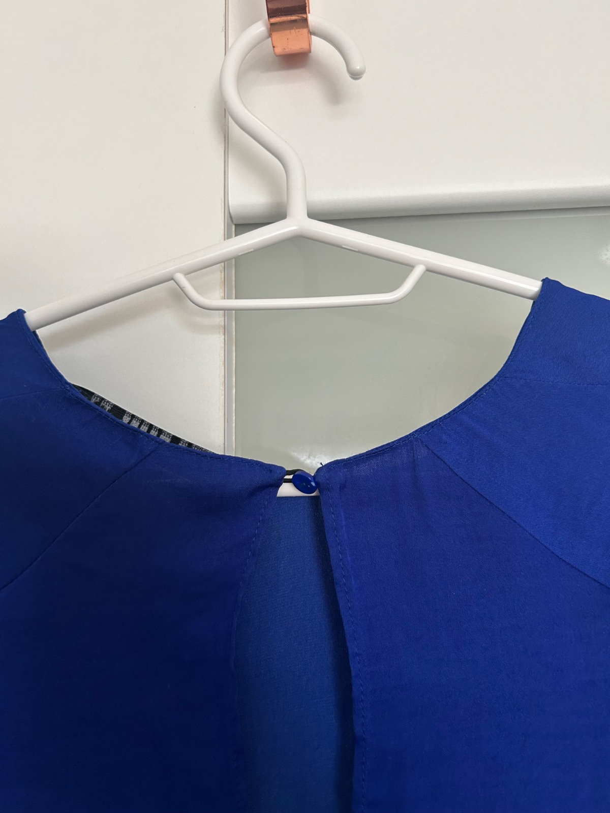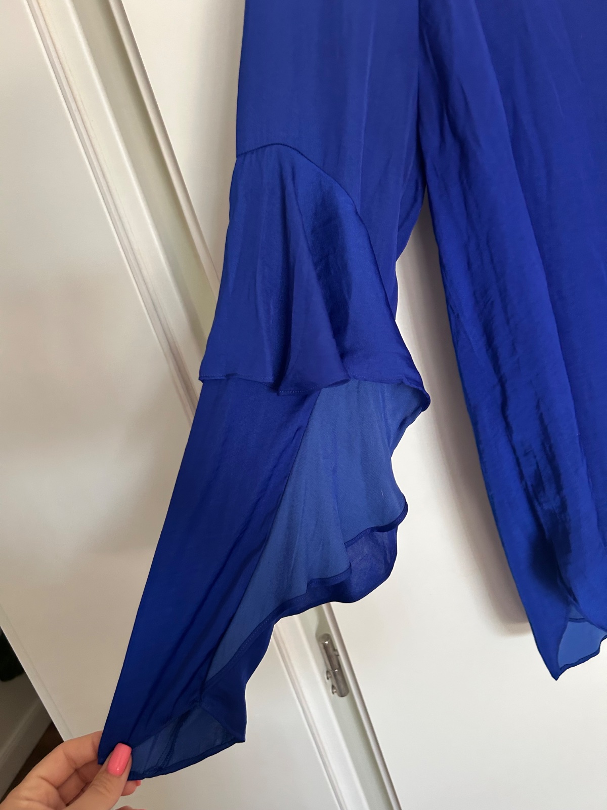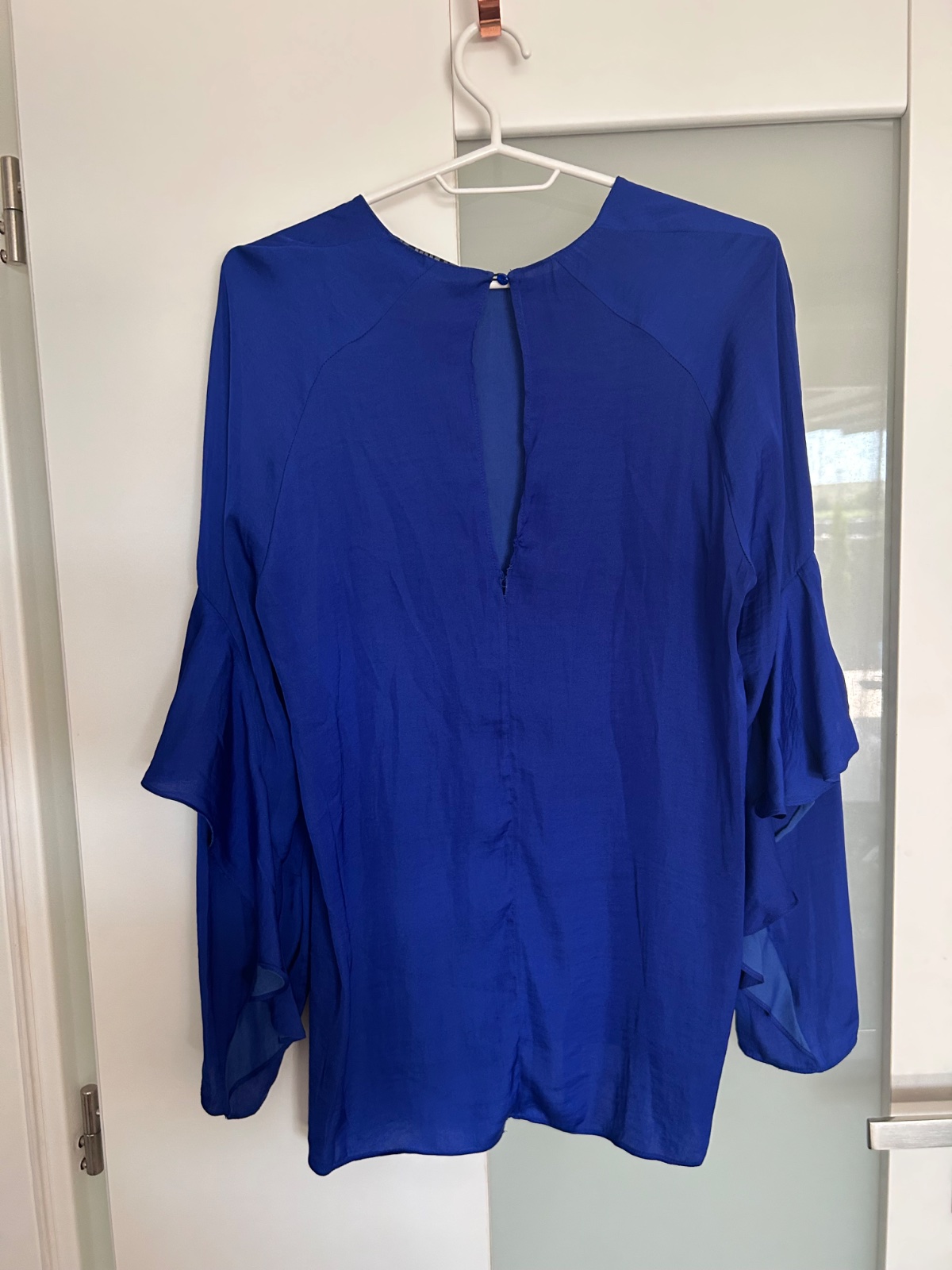 Pekný nosený stav, bez funkčného poškodenia, padavy tenký materiál, gombik vzadu na krku, krásne volány na rukávoch, mne úzka, dl. 73, š.49