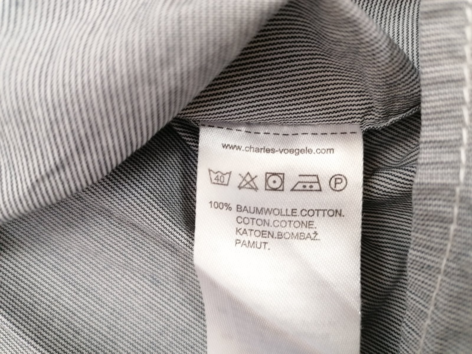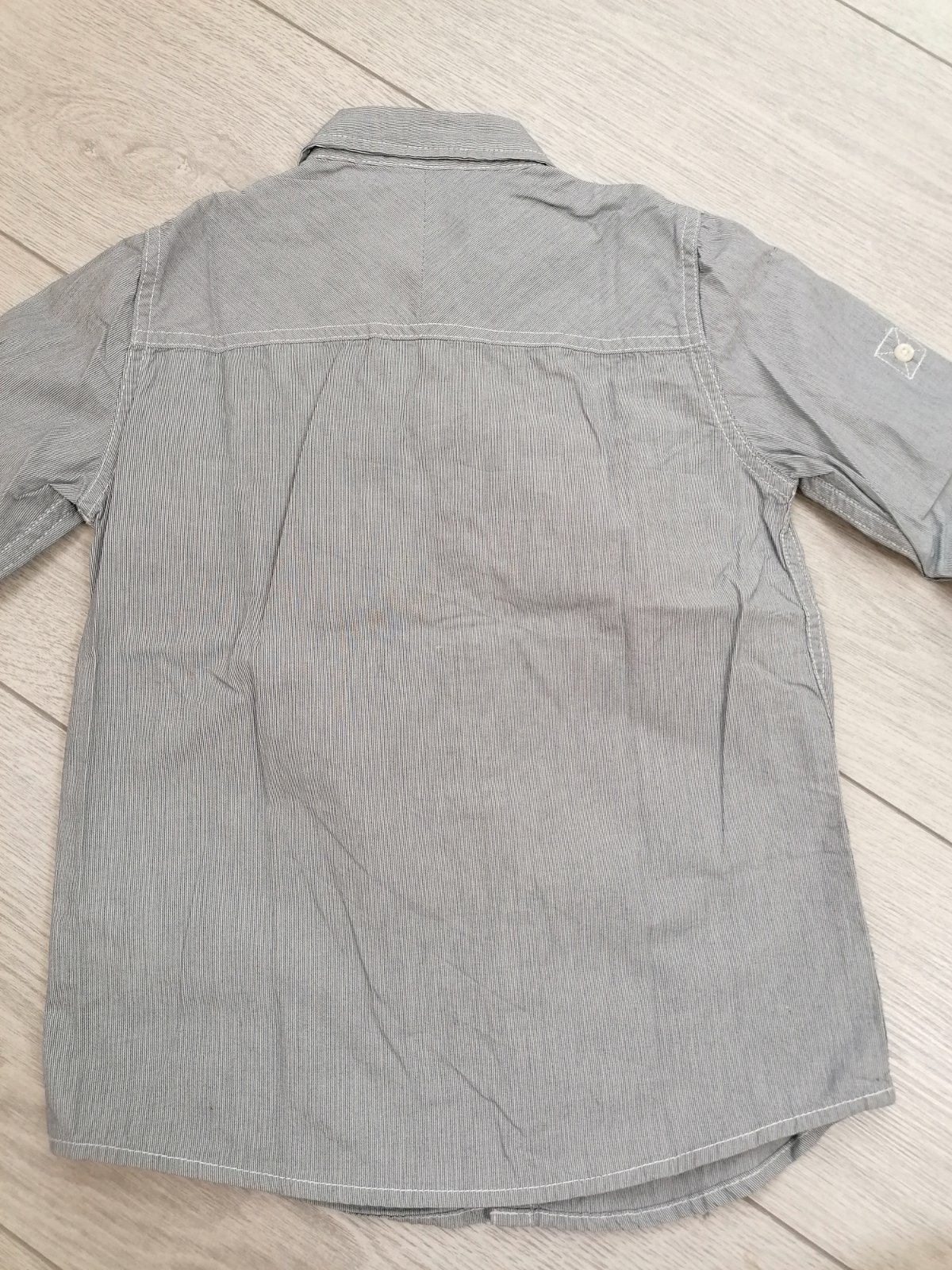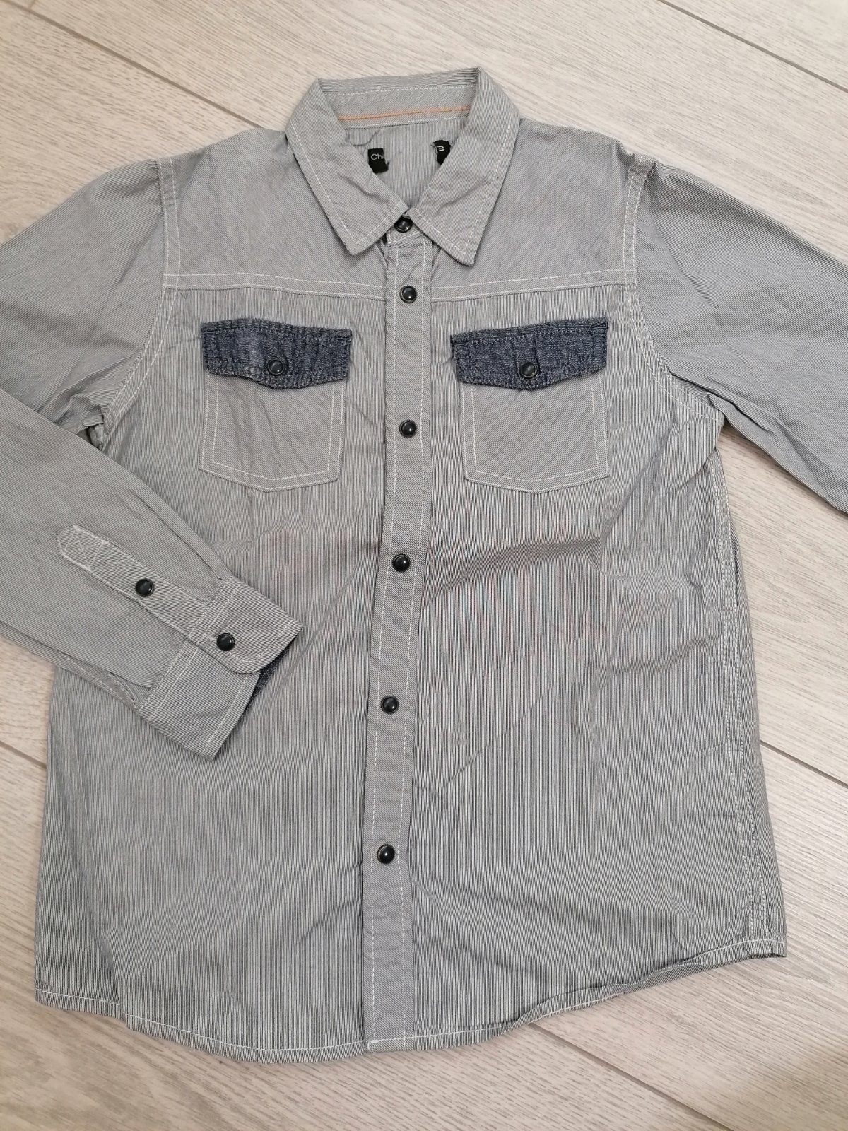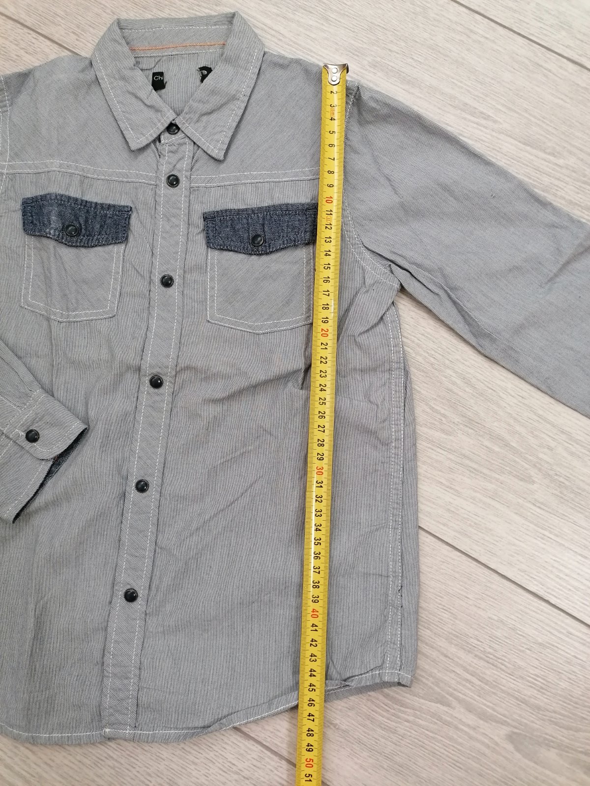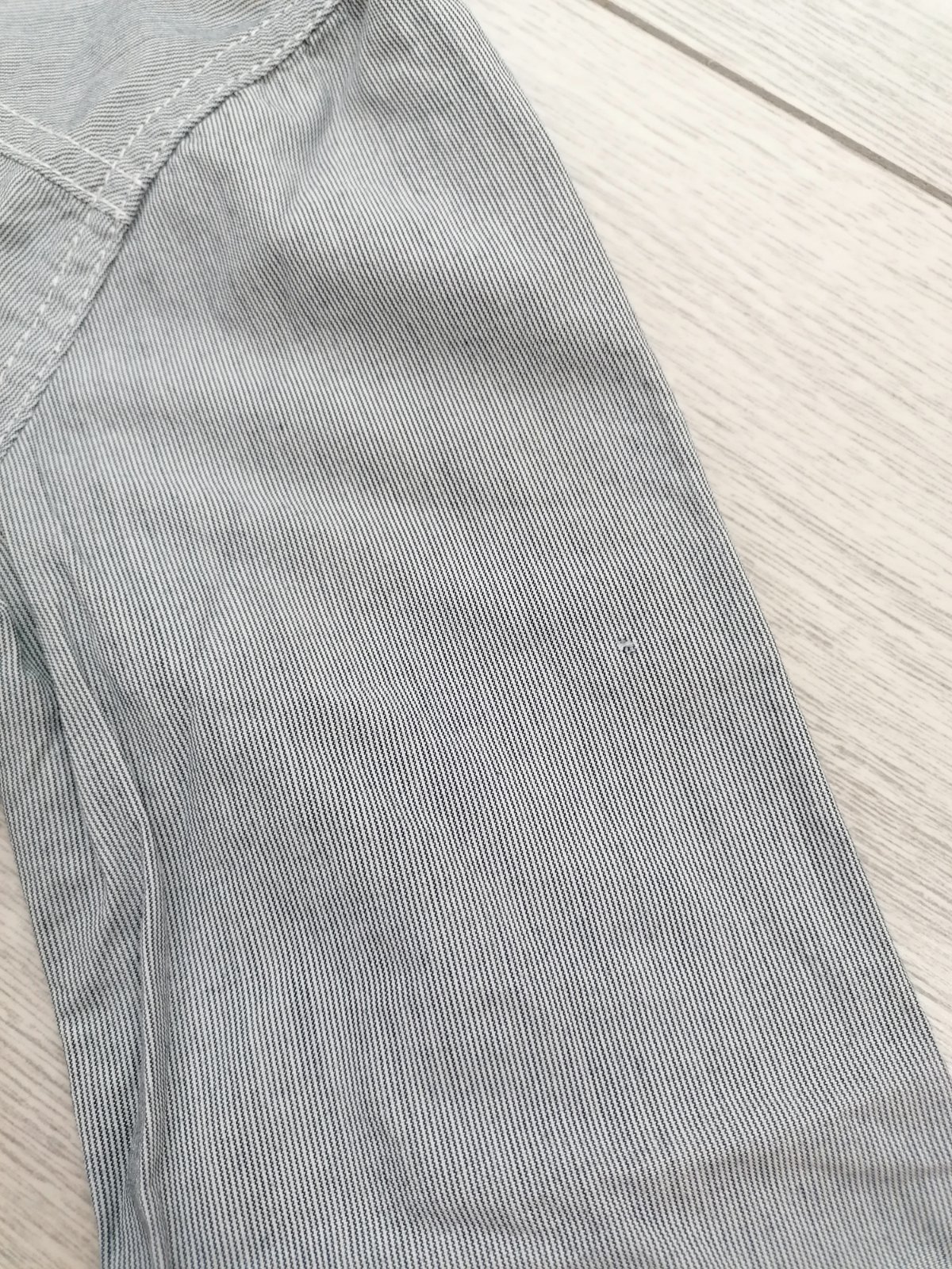 Farba je svetlosiva, jemne pruhovane. Zapinanie na cvoky. Moderny riflovy efekt.