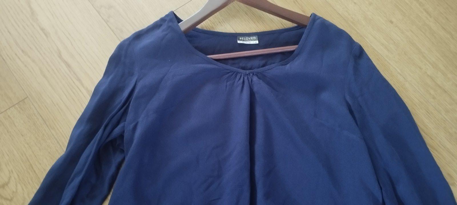 Blúzka v tmavomodrej farbe s potlačou. V prednej časti sú situované dva vrecká. Blúzka nebola nosená len opratá. Šírka v oblasti pŕs: 48cm Dĺžka rukáva: 59cm Celková dĺžka: 75cm